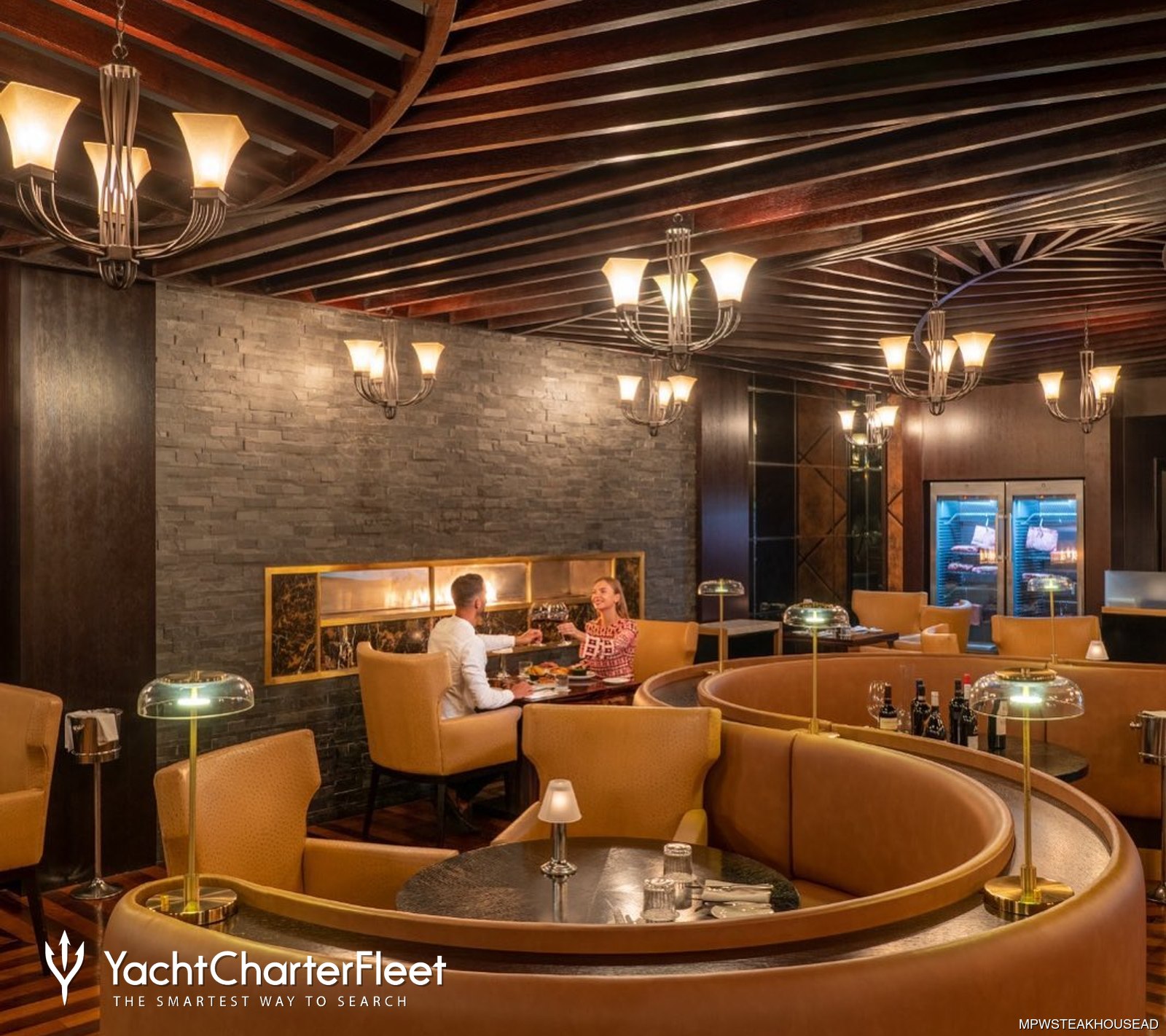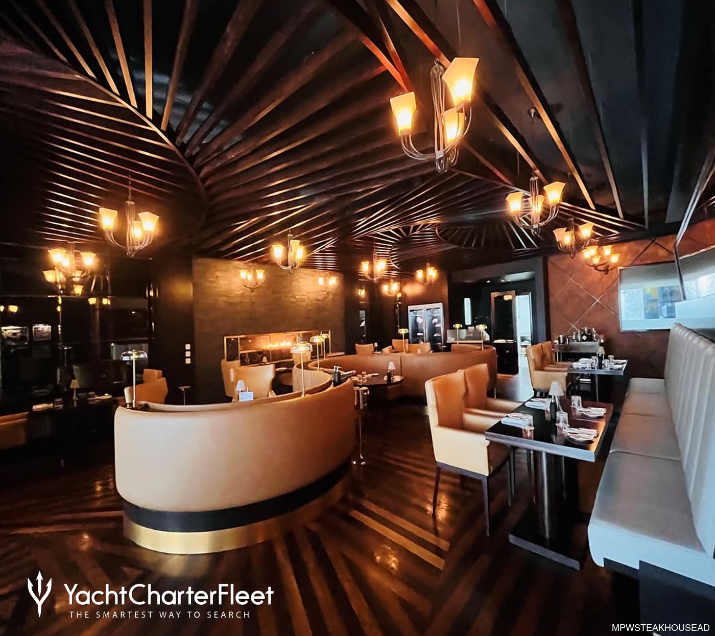 The interior features a bold illuminated wall that gives the room its character while keeping the overall feel balanced. The kitchen focuses on grill dishes and English‑influenced plates, prepared in a way that keeps flavours clear and uncluttered. Guests from visiting motor yacht charters can choose from a variety of options suited to different preferences, making it suitable for both small groups and families.