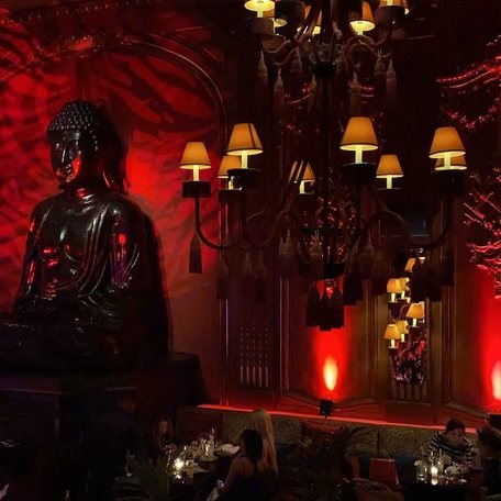 Impossible not to notice is the lavish décor. Deep red upholstery, rich woods, elaborate gold gilding and a larger-than-life Buddha statue transport patrons to a faraway eastern land. Dinner is enjoyed on the mezzanine while those in the lounge bar on the level below are kept entertained by resident DJ Papa spinning a subtle blend of chill-out music with delicately embellished electro beats.