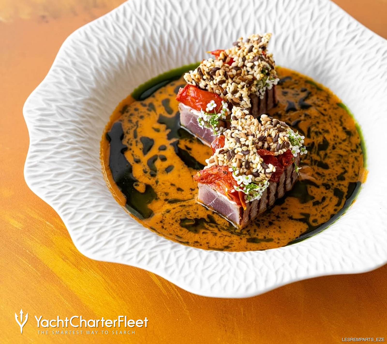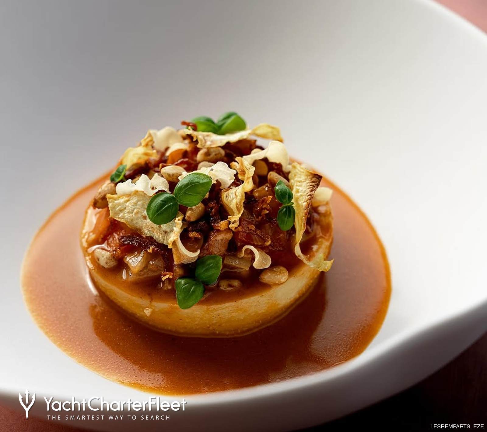 The menu also features a variety of starters and mains that showcase the richness of flavors synonymous with South of France yacht charters. Each dish reflects a deep respect for the traditions of the region, using fresh, local produce to highlight the essence of Mediterranean cooking.
