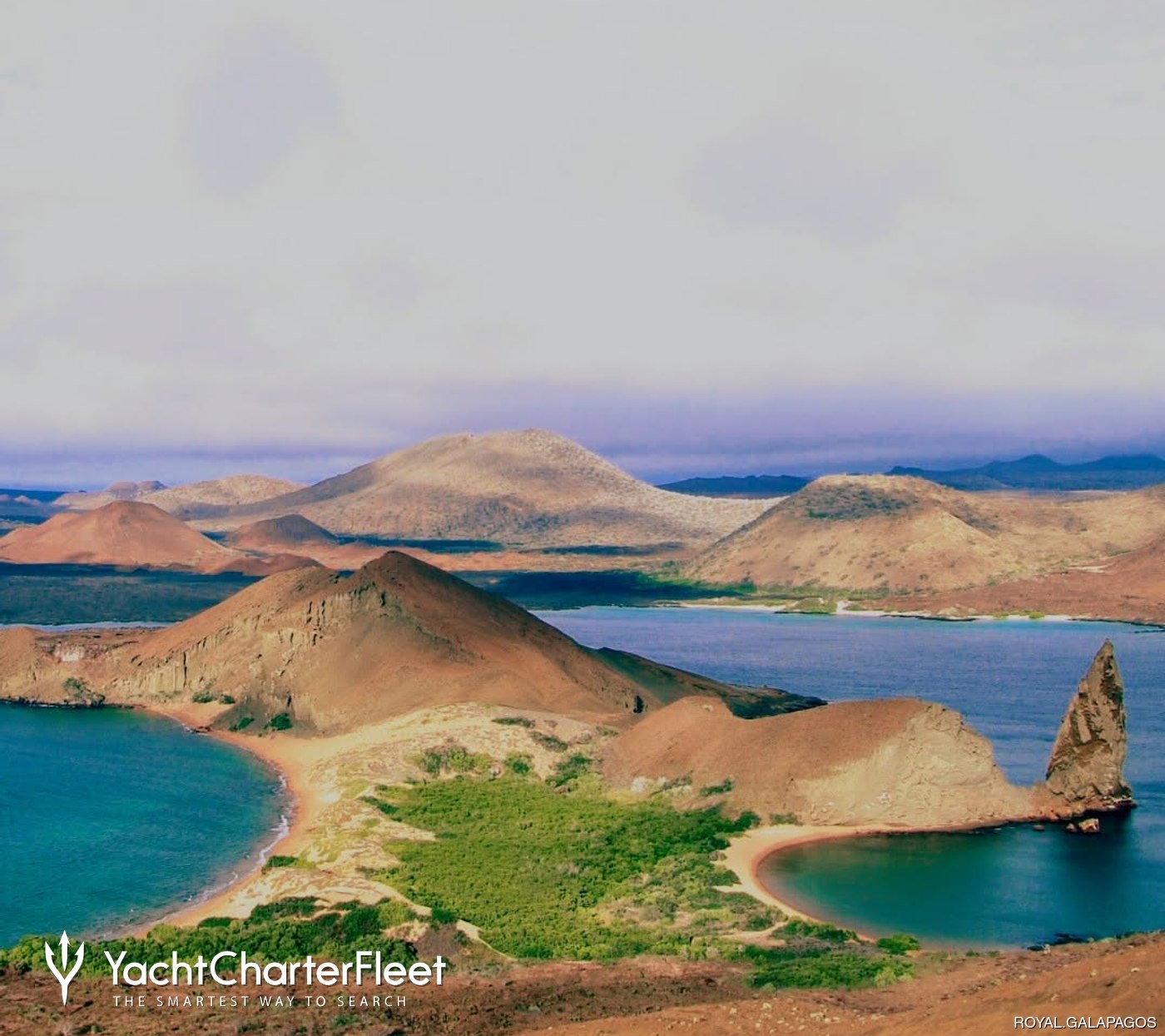 From above, Pinnacle Rock becomes part of a larger composition that includes both gentle and dramatic volcanic features. The scene feels open and expansive, making it easy to understand why this viewpoint is one of the most photographed in the archipelago.