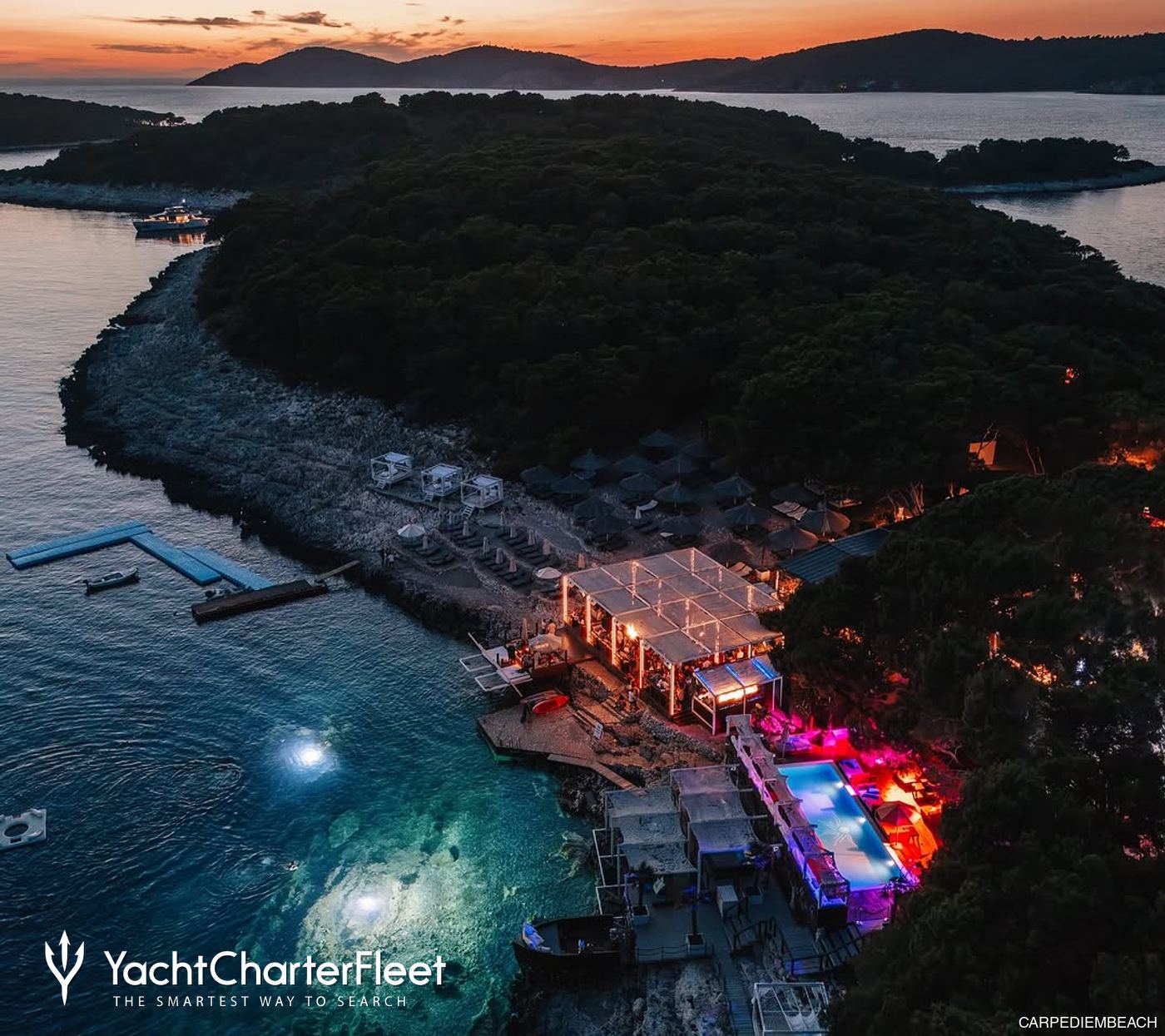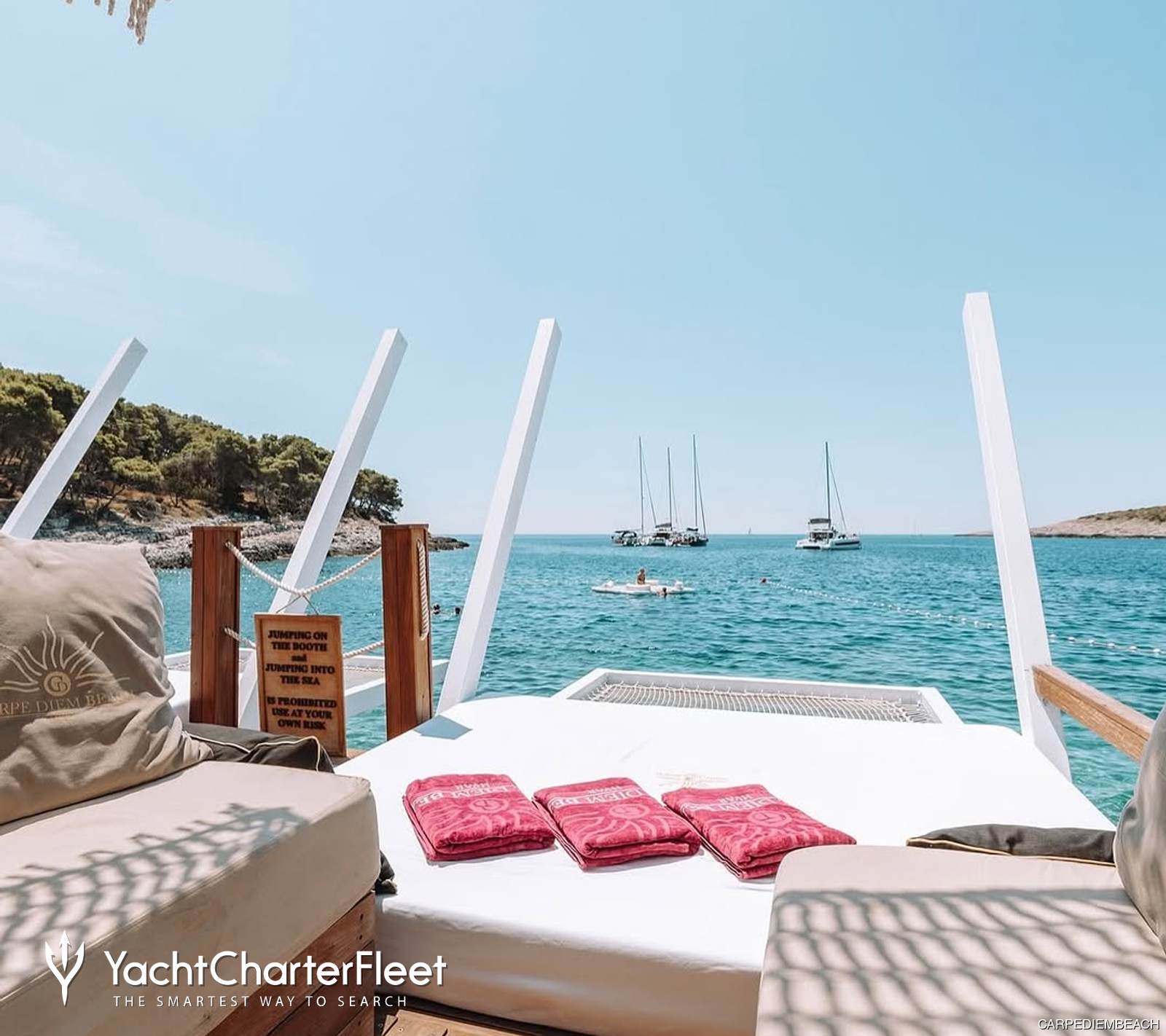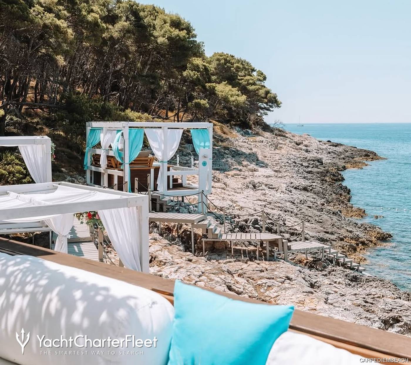 Carpe Diem Beach is one of the most sought-after beach clubs on Croatia yacht charters. It features two stunning beaches with spacious sunbeds and shaded areas, making it a favorite destination for holidaymakers and yacht charter visitors exploring the Adriatic.