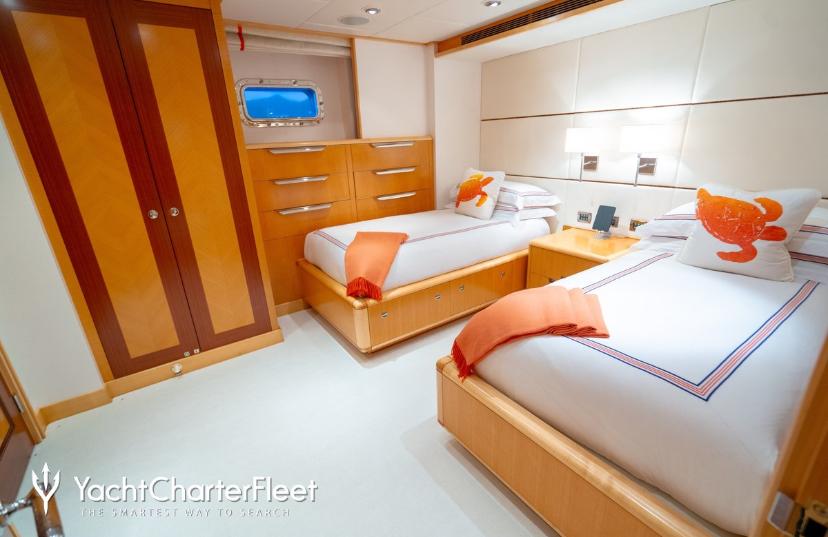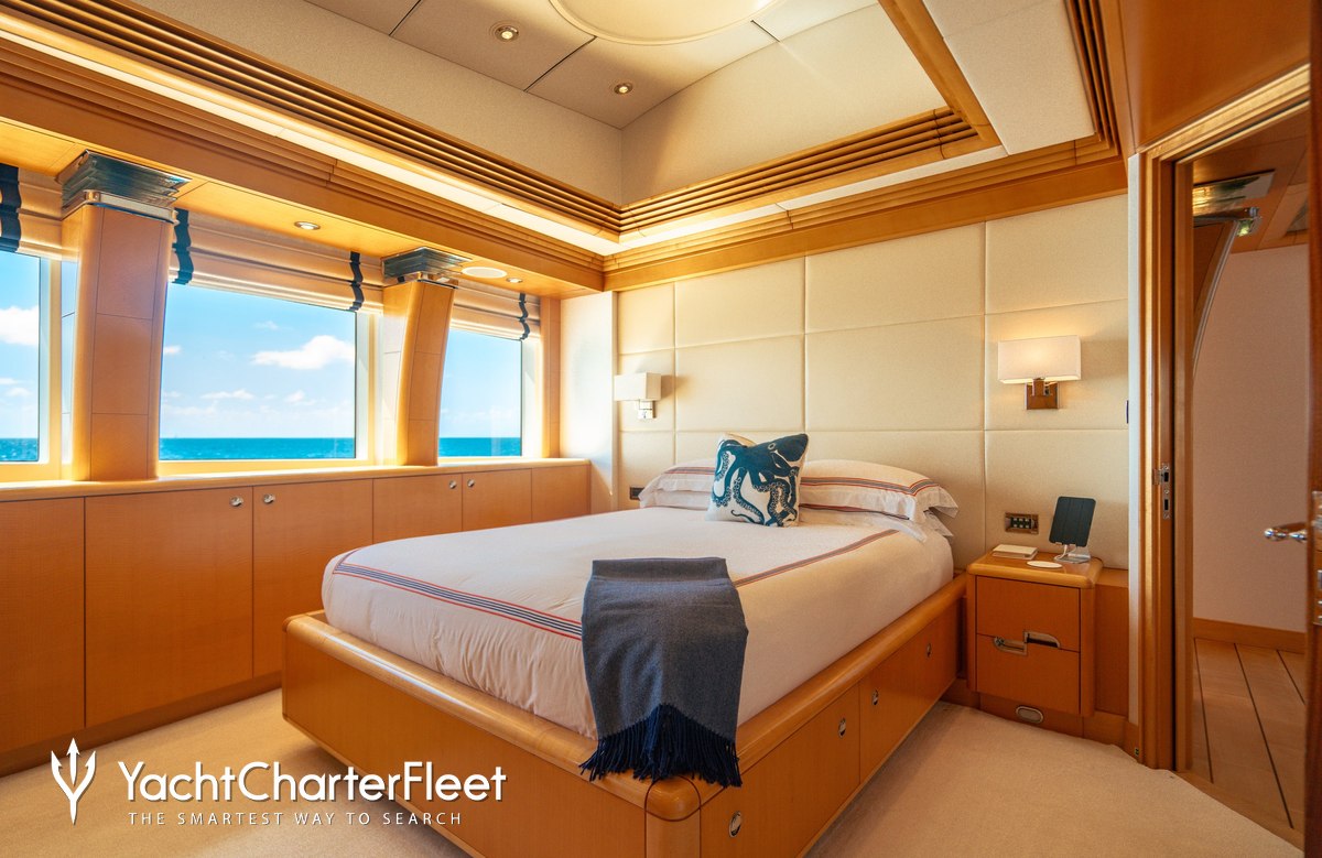 Built in 2006, Victoria Del Mar offers guest accommodation for up to 12 guests in 7 suites comprising a master suite, two VIP cabins, two double cabins and two twin cabins. There are 9 beds in total, including 1 king, 4 queen and 4 singles. She is also capable of carrying up to 11 crew onboard to ensure a relaxed luxury yacht charter experience.