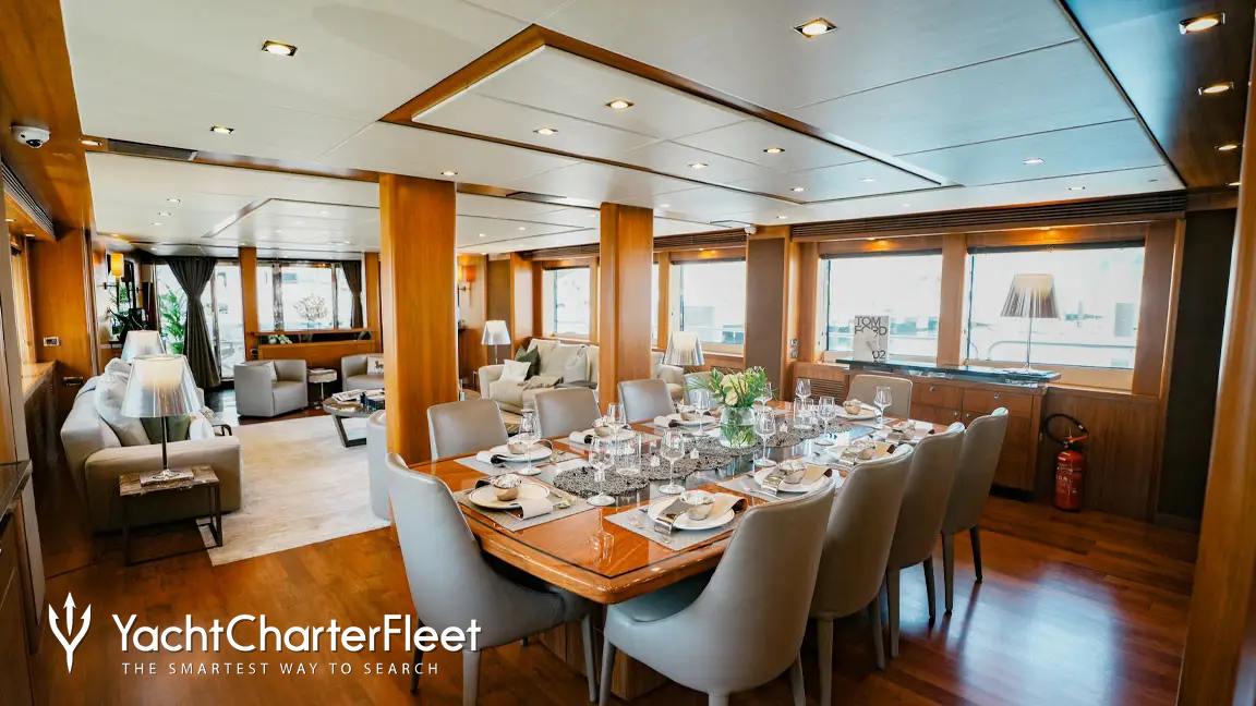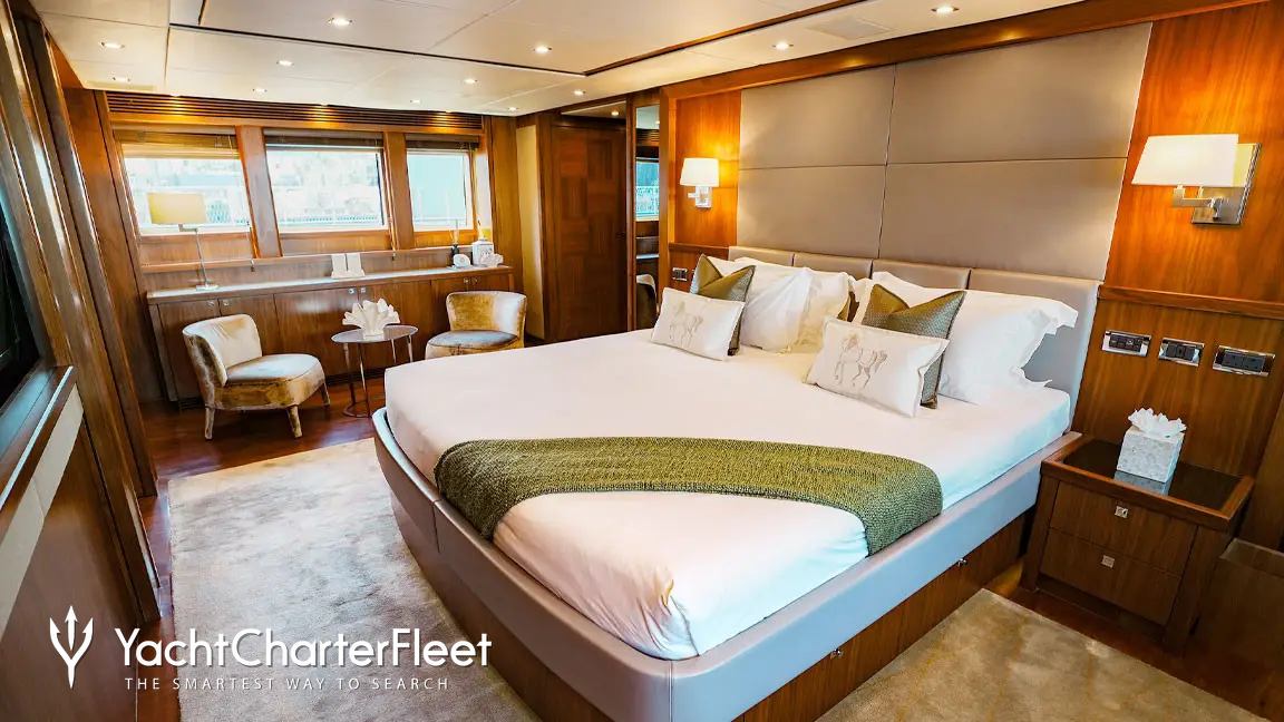 Encore is great for families thanks to her child-friendly setup. Built in 2007, She offers guest accommodation for up to 10 guests with a layout comprising a master suite, two double cabins and two twin cabins. There are 9 beds in total, including 1 king, 2 doubles, 4 singles and 2 pullmans. She is also capable of carrying up to 4 crew onboard to ensure a relaxed luxury yacht charter experience.