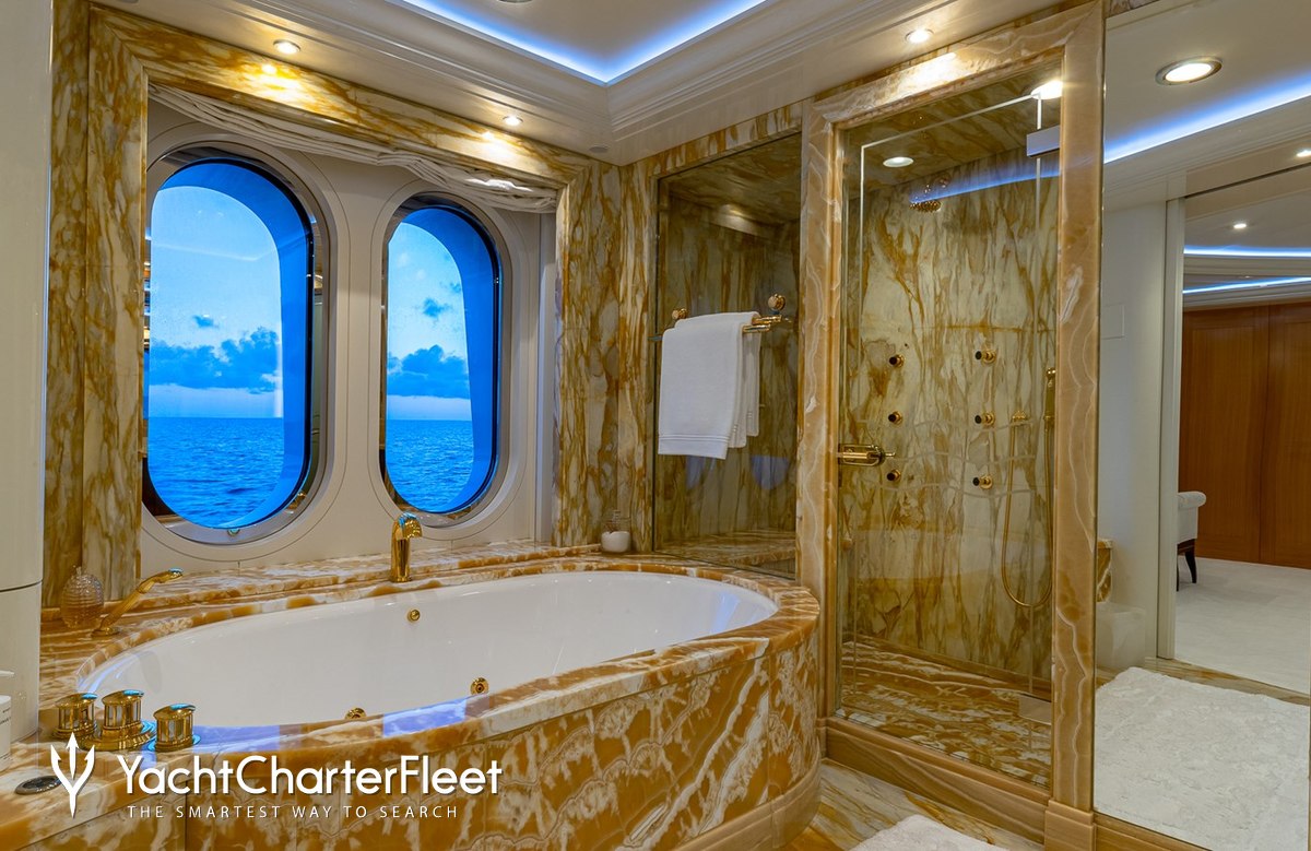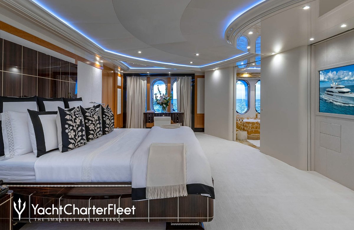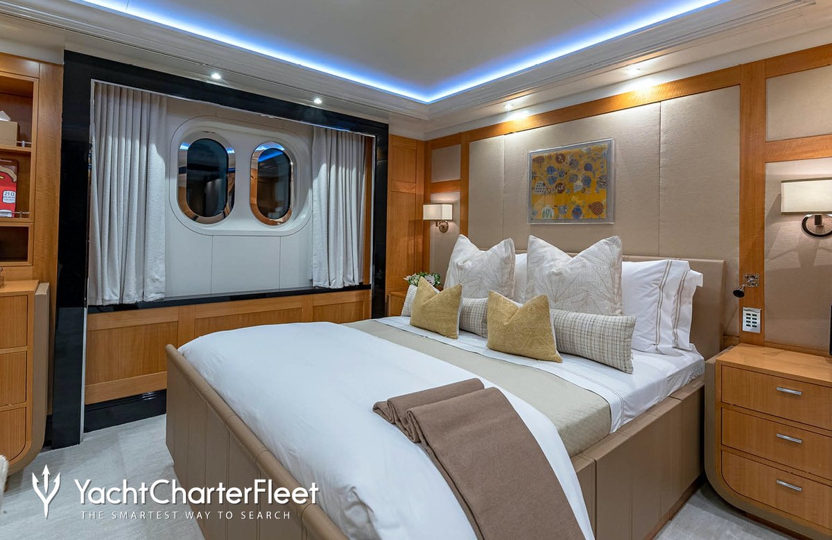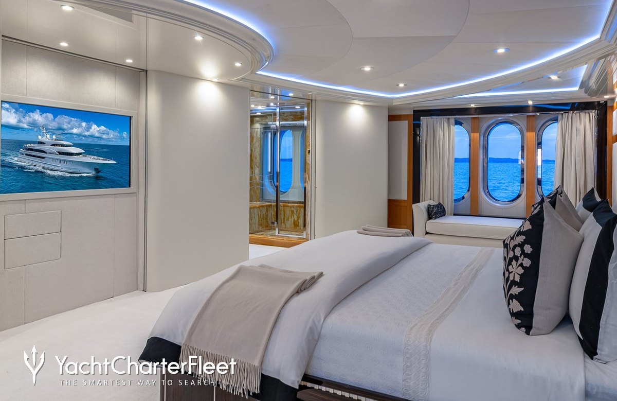 Lunaris offers guest accommodation for up to 12 guests in 6 suites comprising a master suite located on the main deck, one VIP cabin, three double cabins and one twin cabin. The supremely spacious full beam master suite incorporates its own study and dressing room as well as a his and her bathroom. She is also capable of carrying up to 17 crew onboard to ensure a relaxed luxury yacht charter experience.