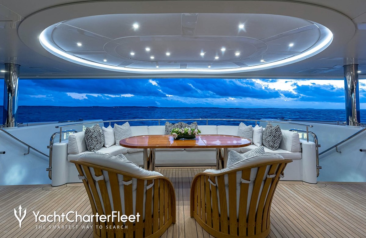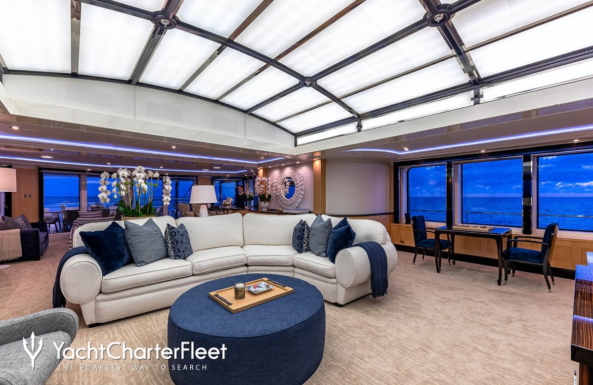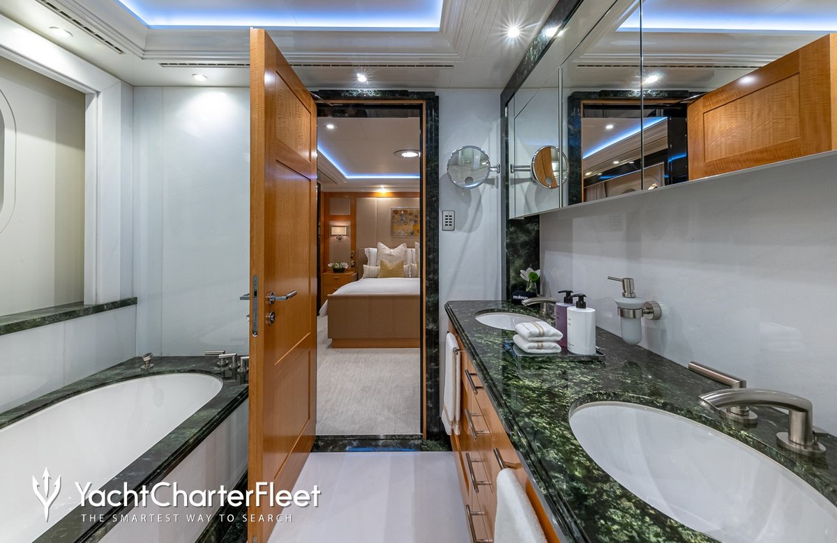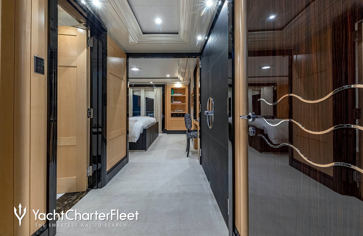 Lunaris offers guest accommodation for up to 12 guests in 6 suites comprising a master suite located on the main deck, one VIP cabin, three double cabins and one twin cabin. The supremely spacious full beam master suite incorporates its own study and dressing room as well as a his and her bathroom. She is also capable of carrying up to 17 crew onboard to ensure a relaxed luxury yacht charter experience.