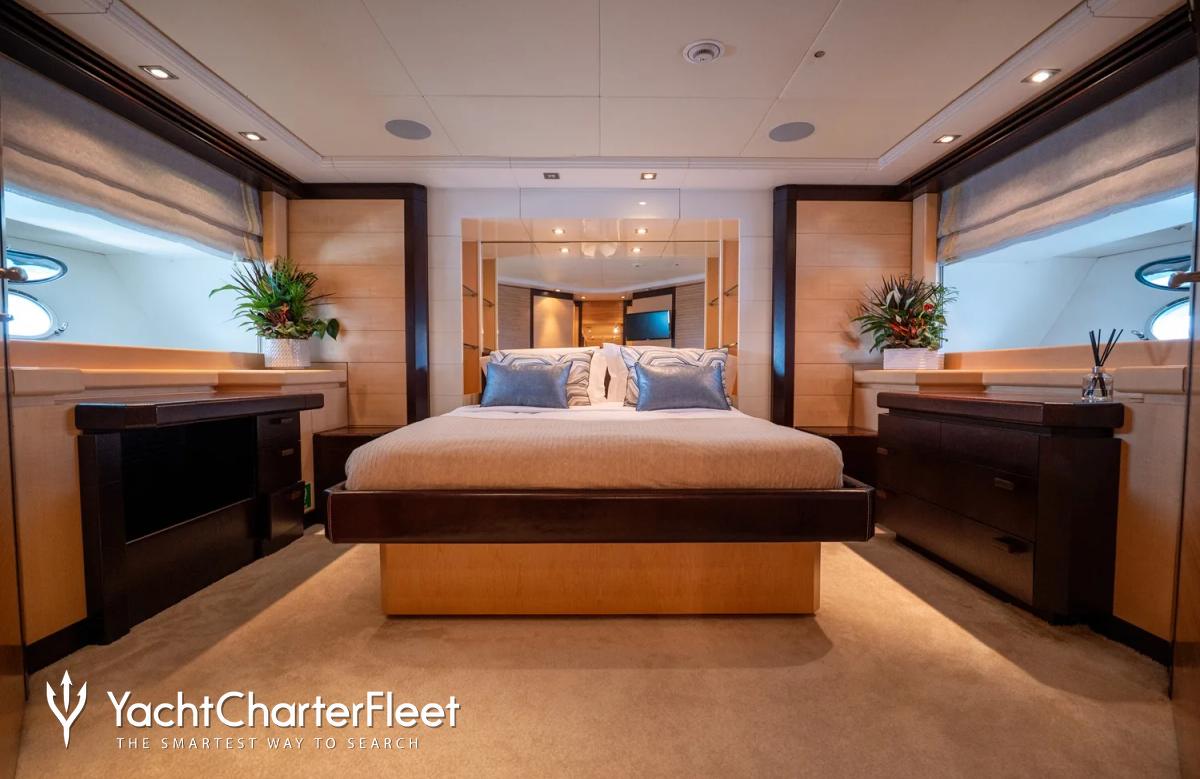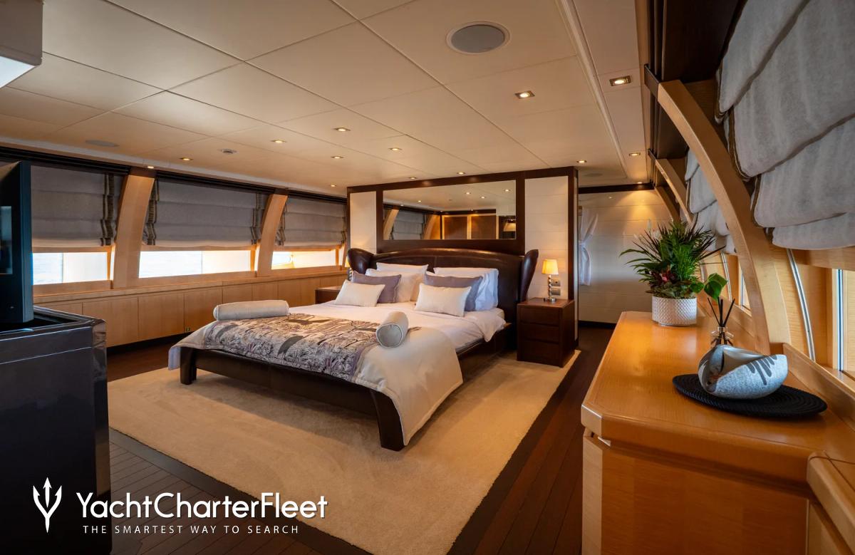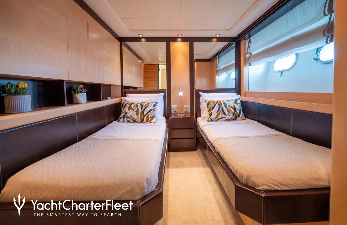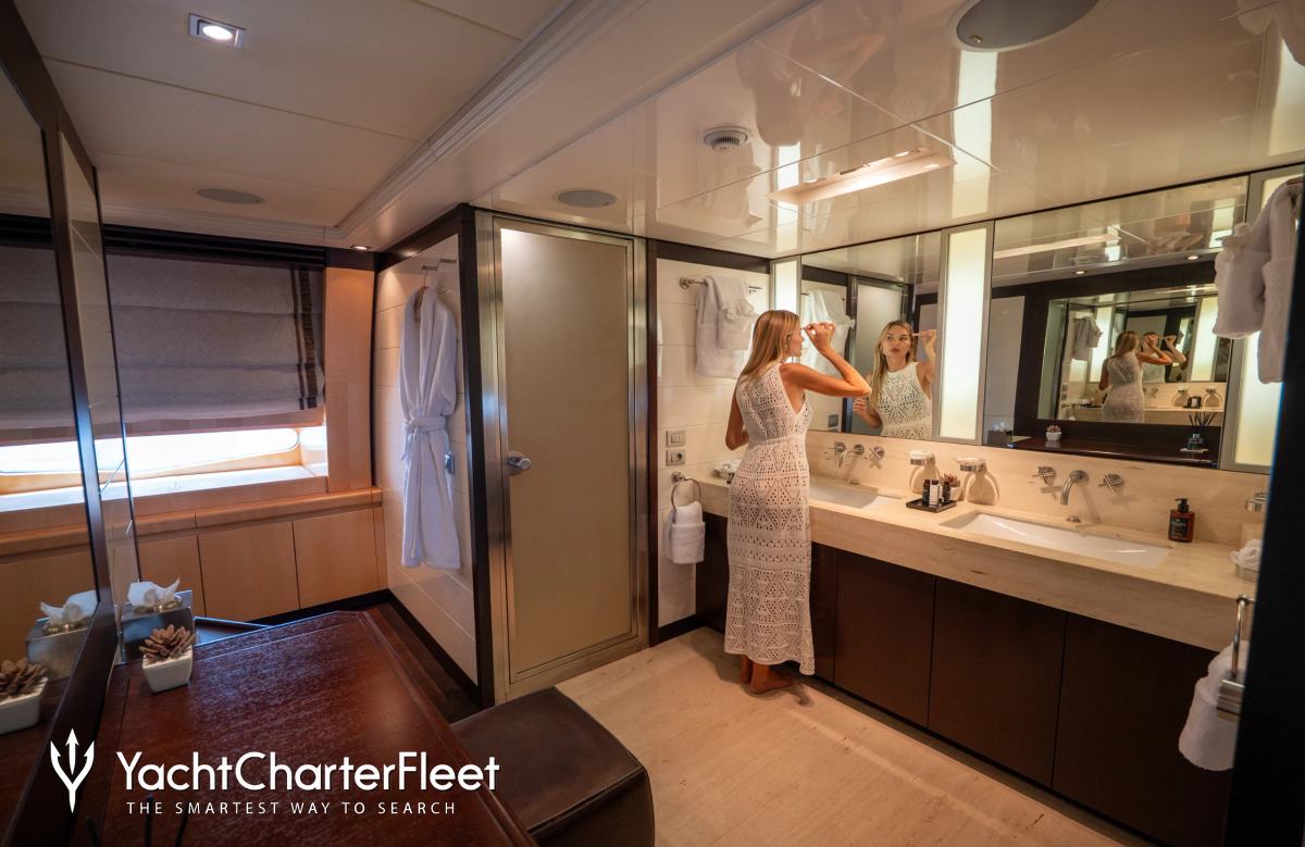 Liberdade is great for families thanks to her child-friendly setup. Built in 2007, She offers guest accommodation for up to 11 guests with a layout comprising a master suite located on the main deck, three double cabins and one twin cabin. The supremely spacious full beam master suite benefits from a his and her bathroom. There are 8 beds in total, including 1 king, 2 queen, 4 singles and 1 pullman. She is also capable of carrying up to 7 crew onboard to ensure a relaxed luxury yacht charter experience.