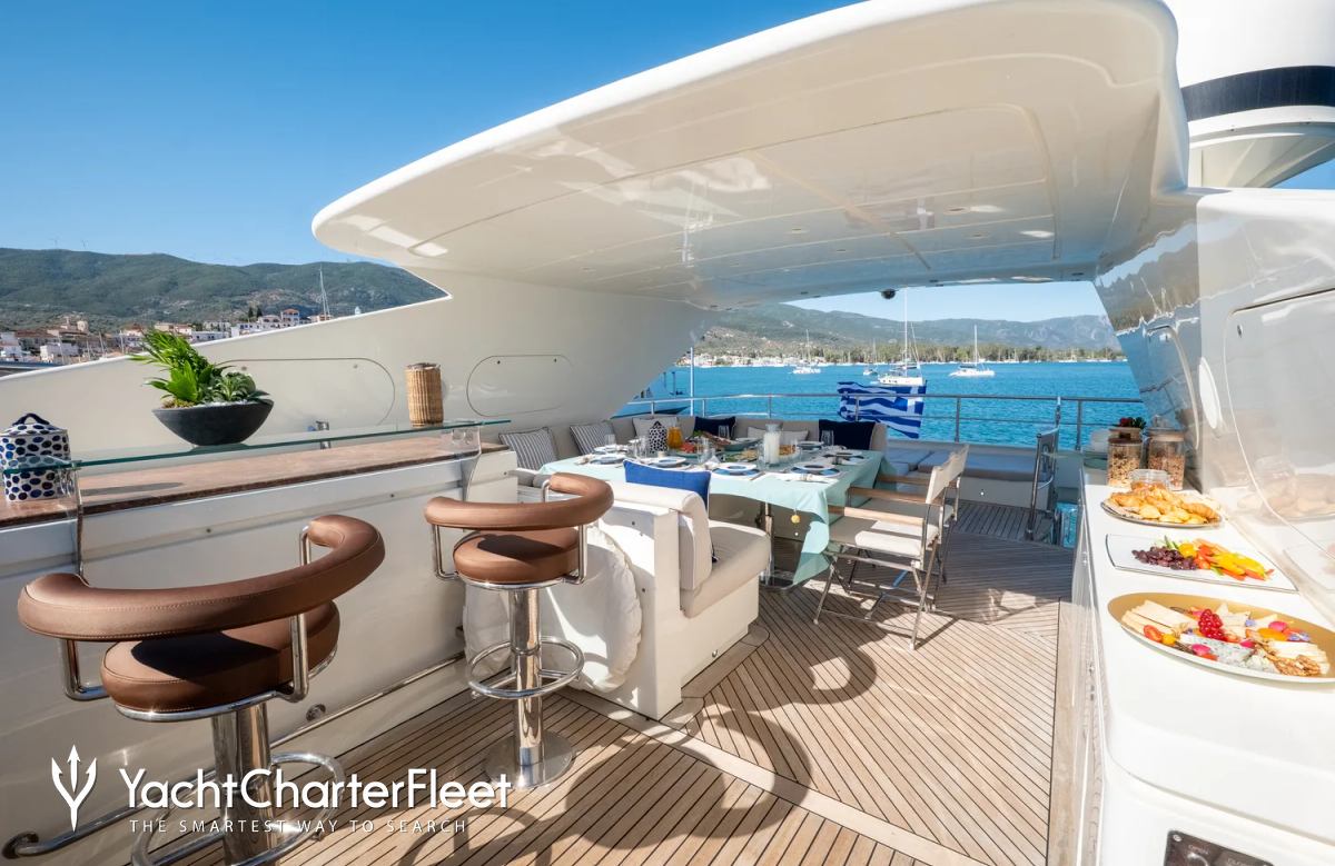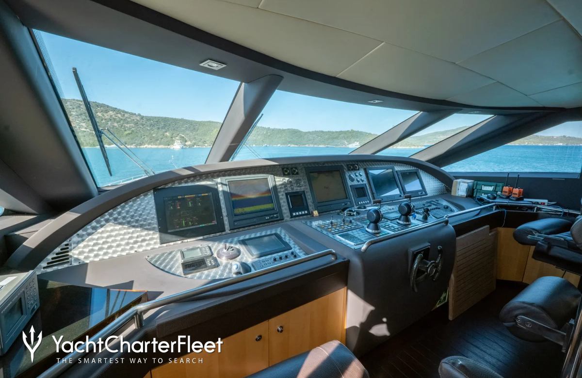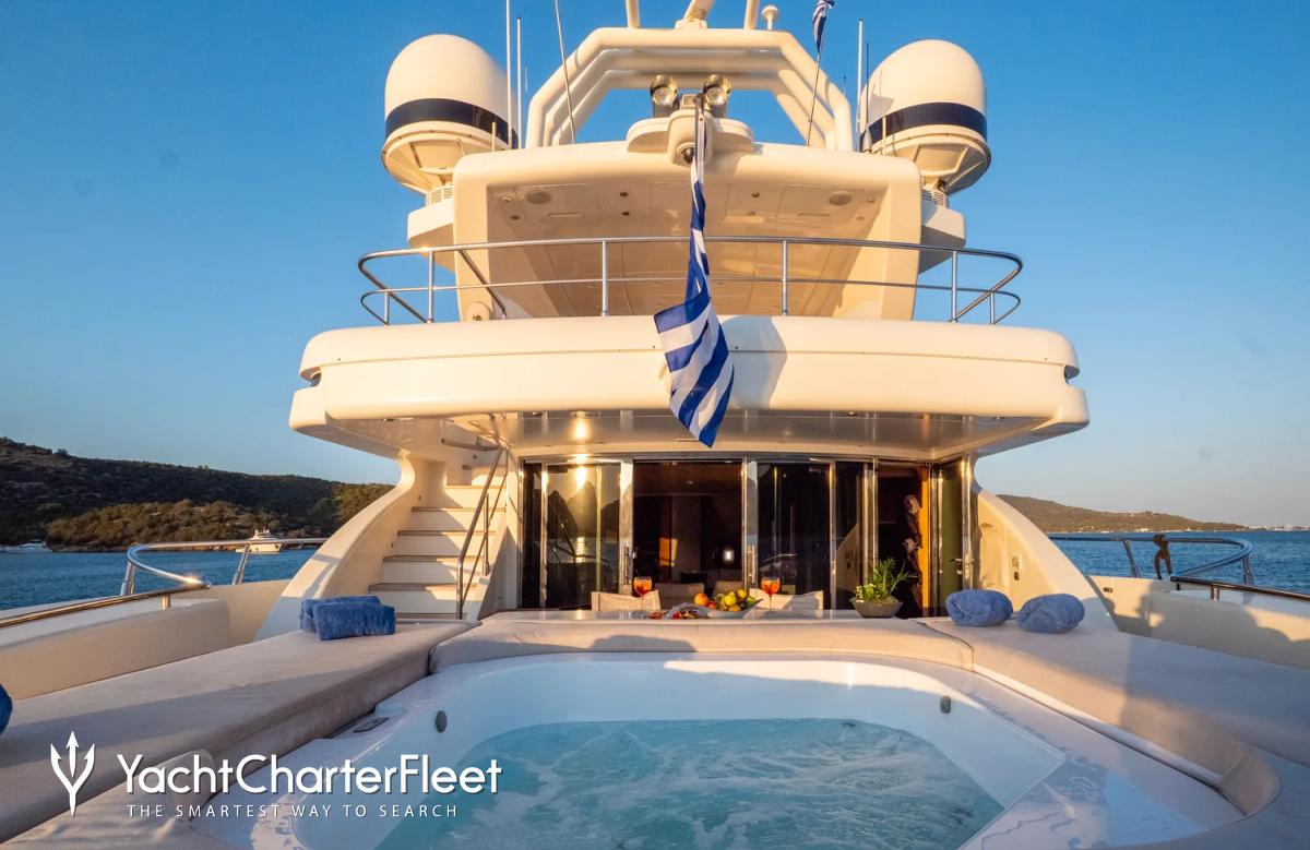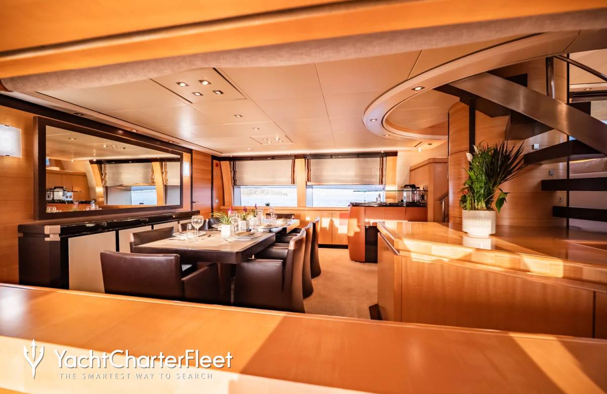 The last ISA 133 manufactured. Modified from original design to become the biggest ISA 133, also includes larger passageways, unique lounge area on foredeck, and custom garage for Jet skis & water sports equipment.
