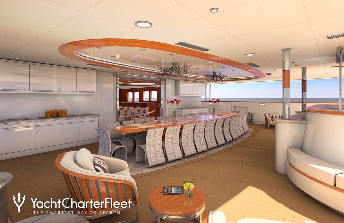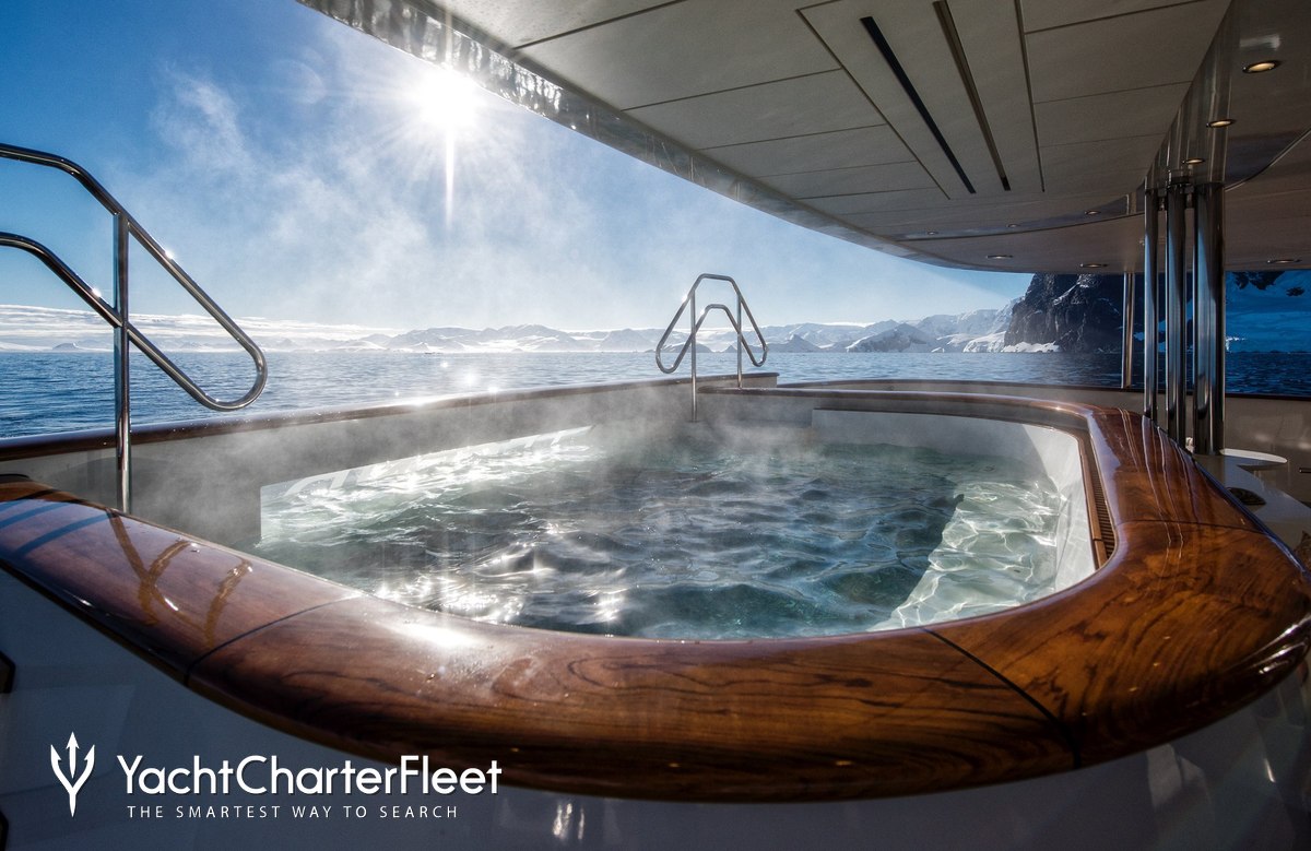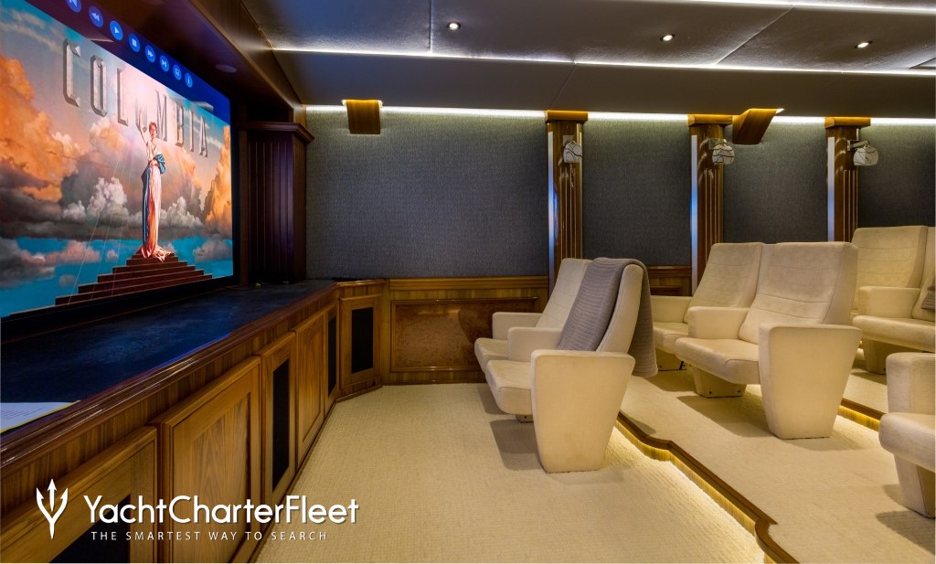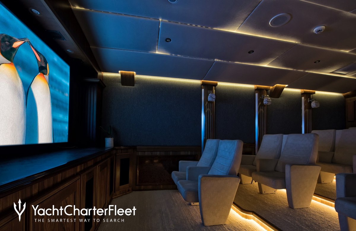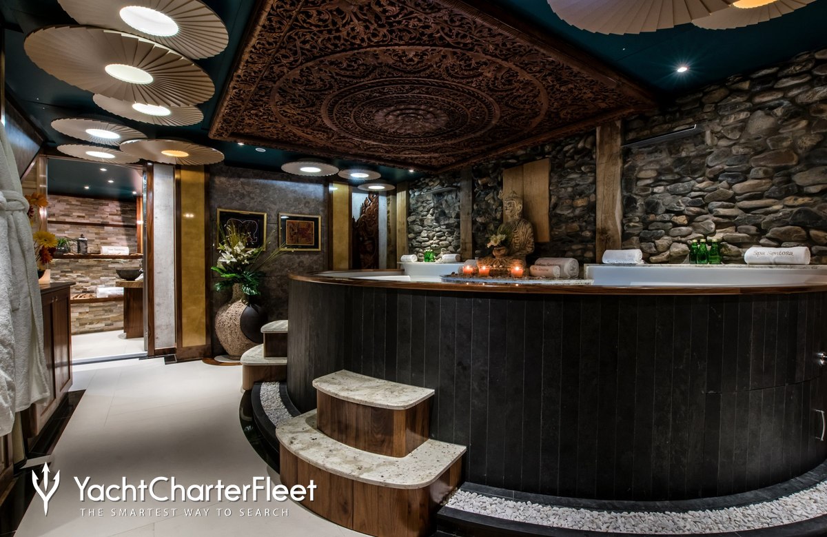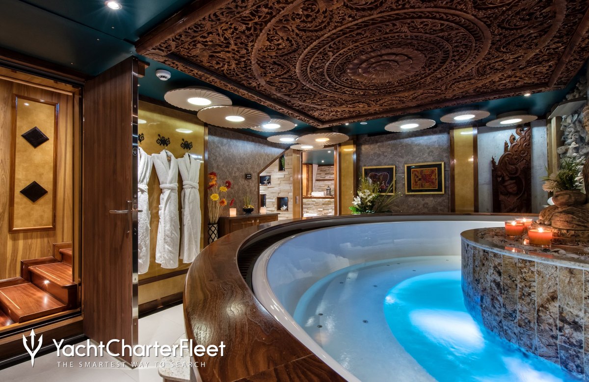 Her entertainment options are spectacular: highlights include her elaborate Balinese spa, featuring almost every conceivable luxury one could think of, a cigar room, a whisky bar, and a 14-seat cinema. But the pièce de résistance is undoubtedly her waterfall-fed, outdoor jacuzzi which can comfortably fit 16 guests.