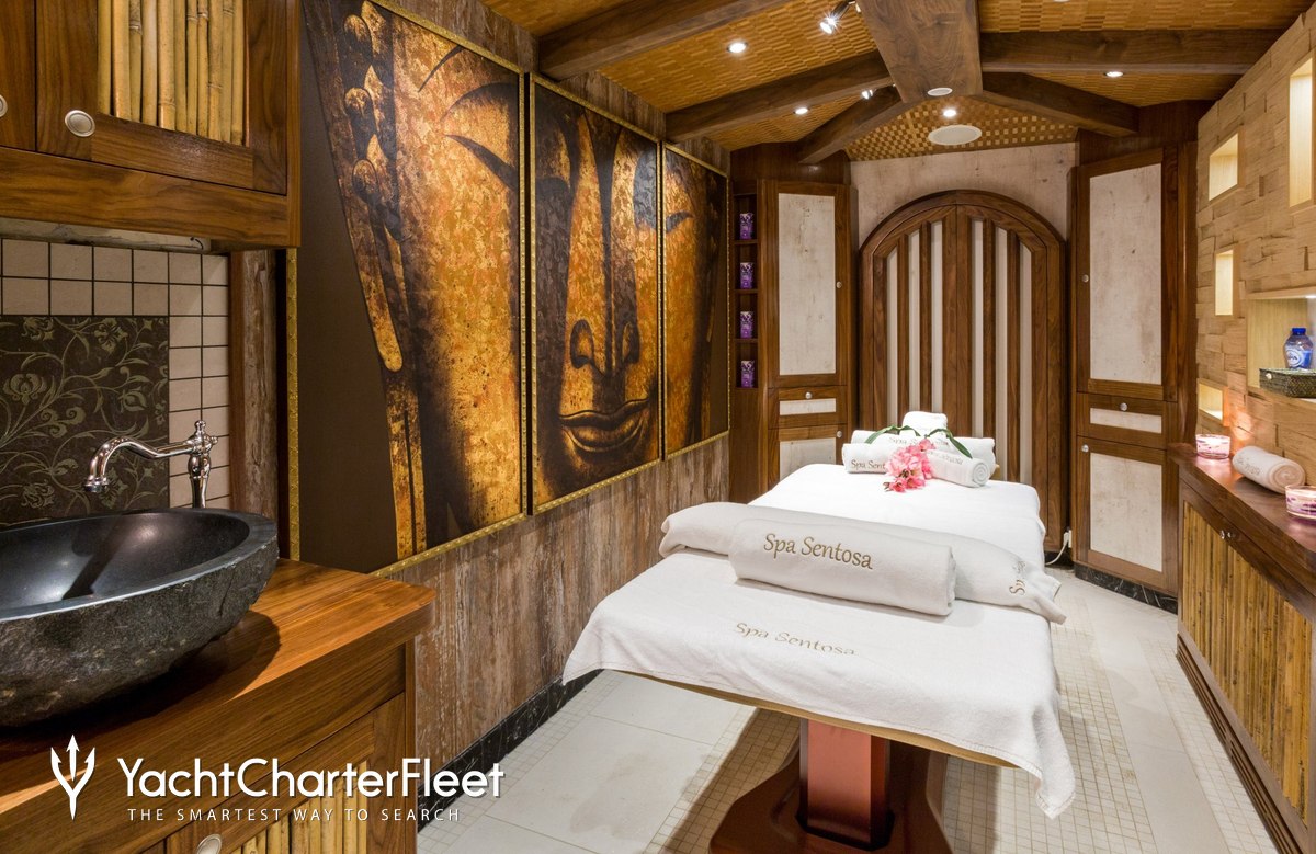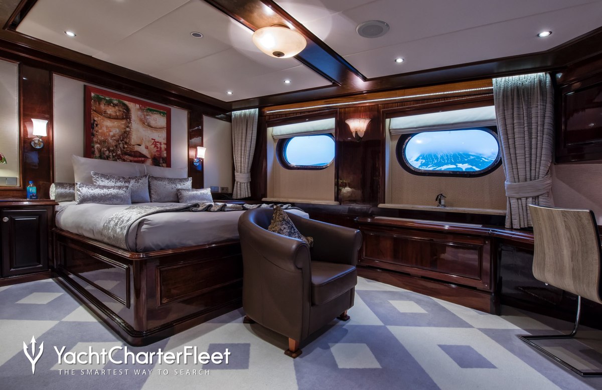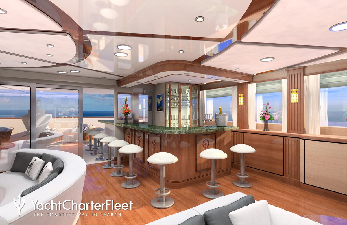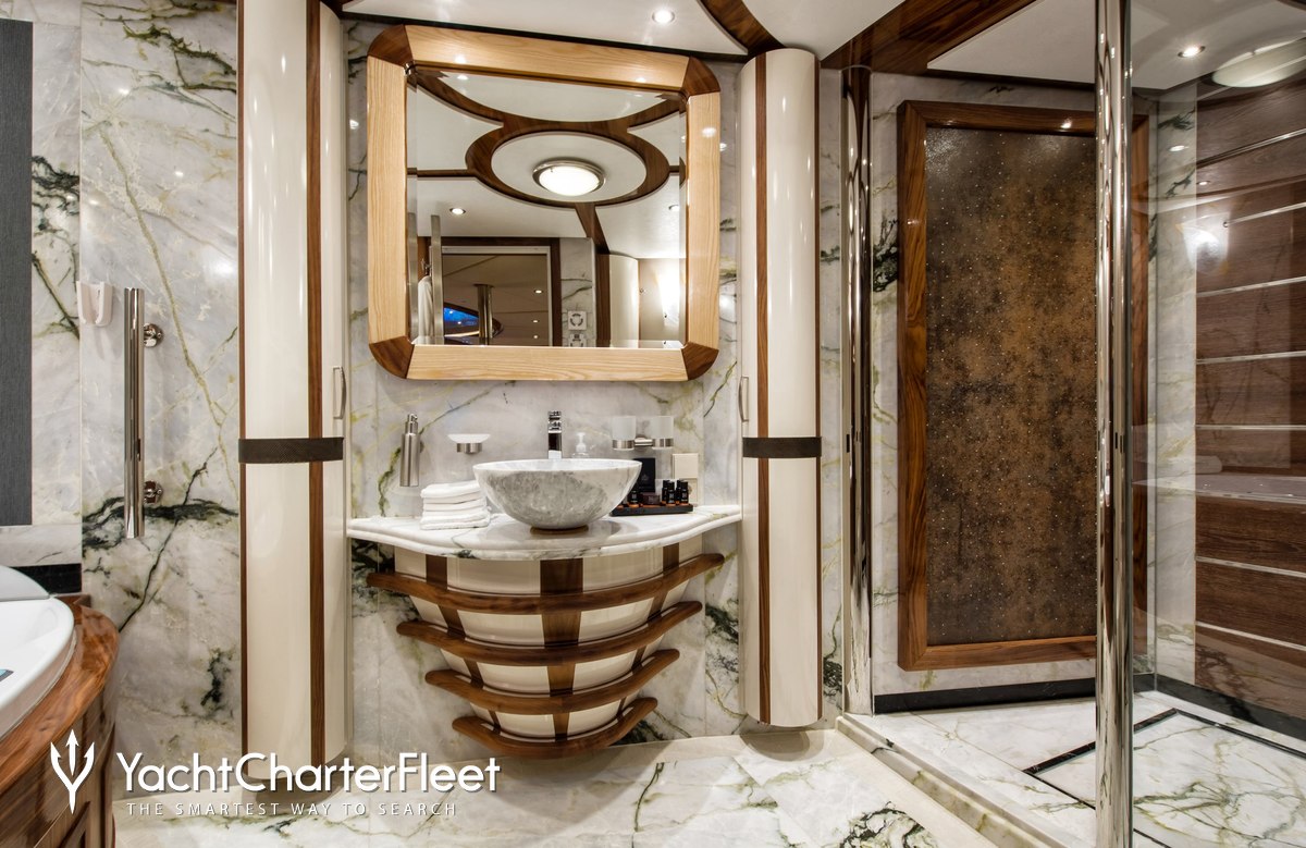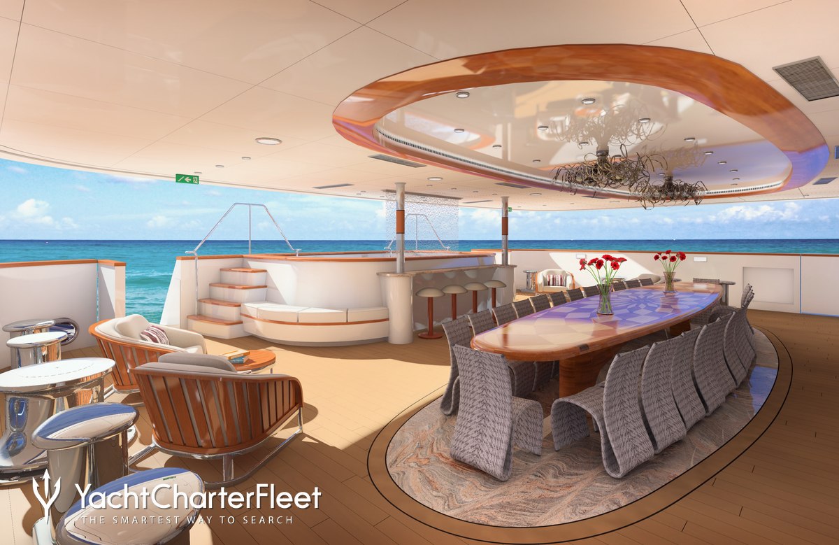 Her entertainment options are spectacular: highlights include her elaborate Balinese spa, featuring almost every conceivable luxury one could think of, a cigar room, a whisky bar, and a 14-seat cinema. But the pièce de résistance is undoubtedly her waterfall-fed, outdoor jacuzzi which can comfortably fit 16 guests.