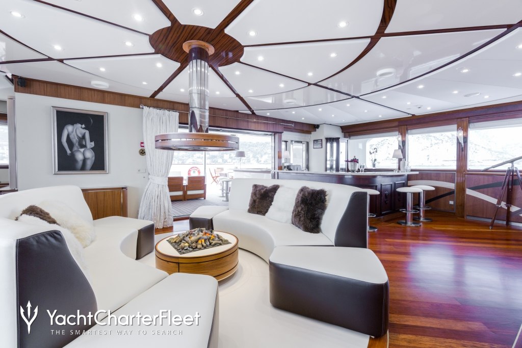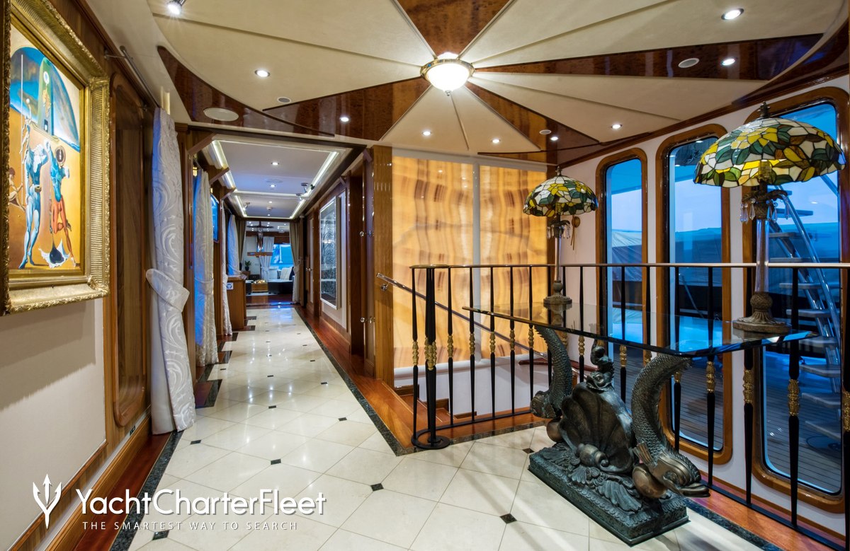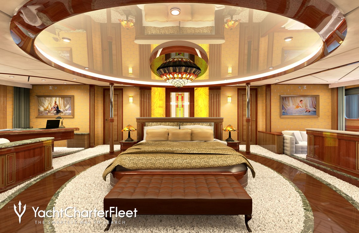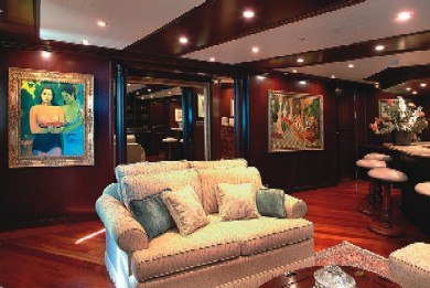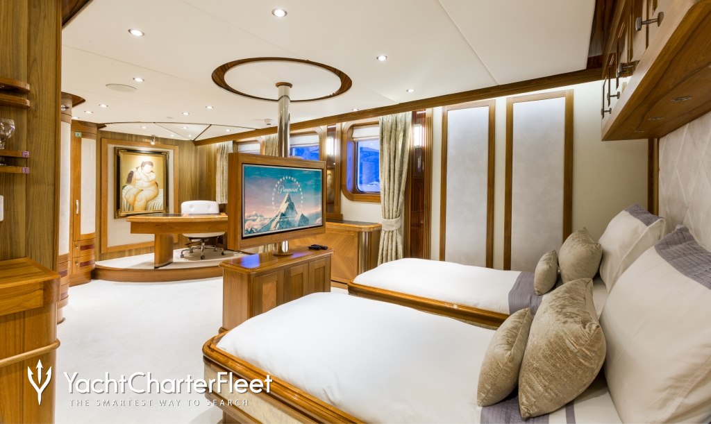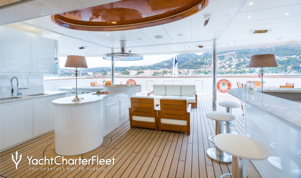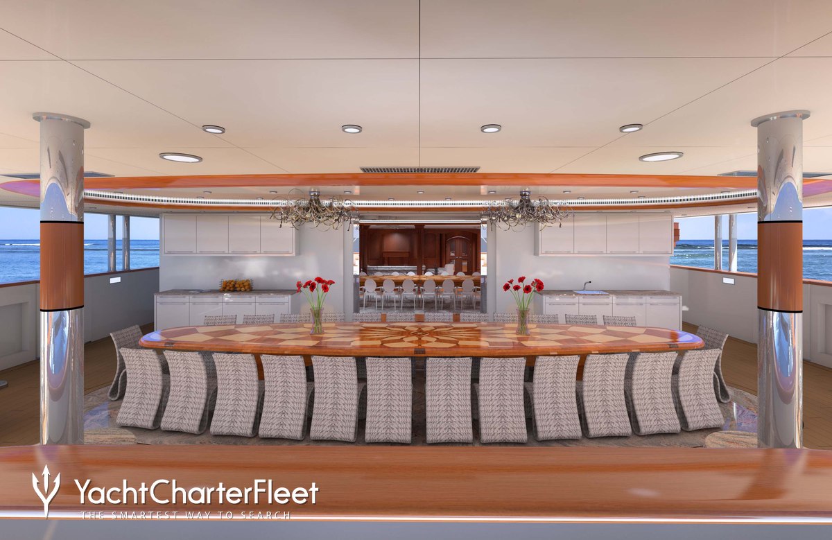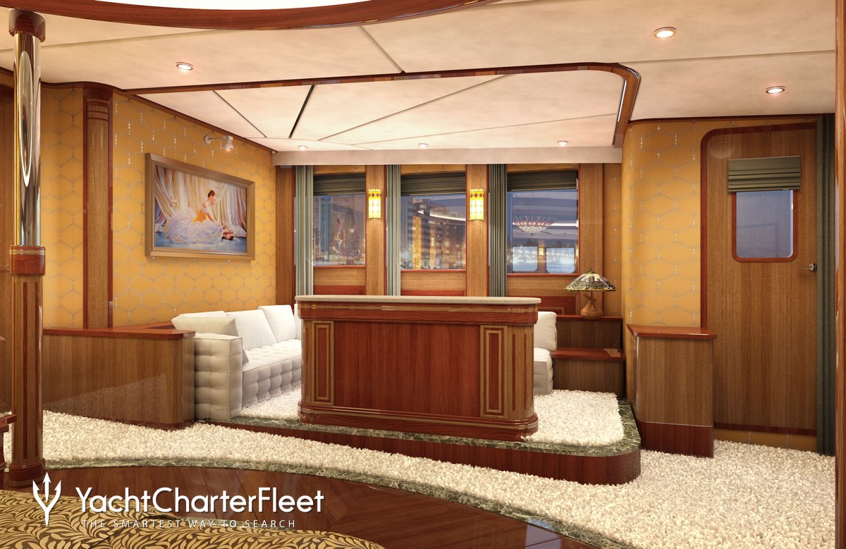 Her entertainment options are spectacular: highlights include her elaborate Balinese spa, featuring almost every conceivable luxury one could think of, a cigar room, a whisky bar, and a 14-seat cinema. But the pièce de résistance is undoubtedly her waterfall-fed, outdoor jacuzzi which can comfortably fit 16 guests.