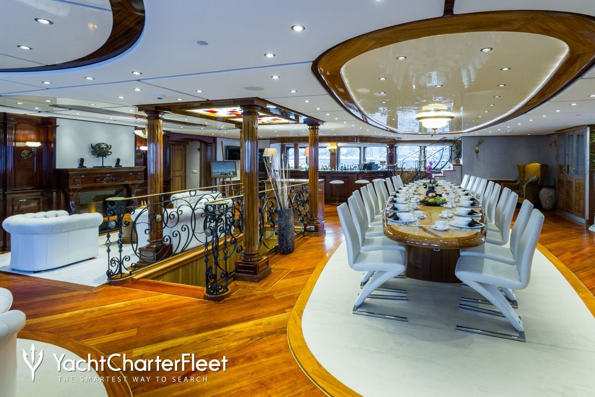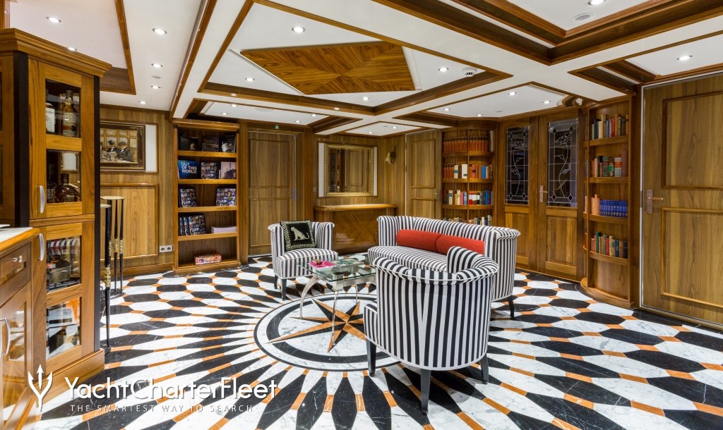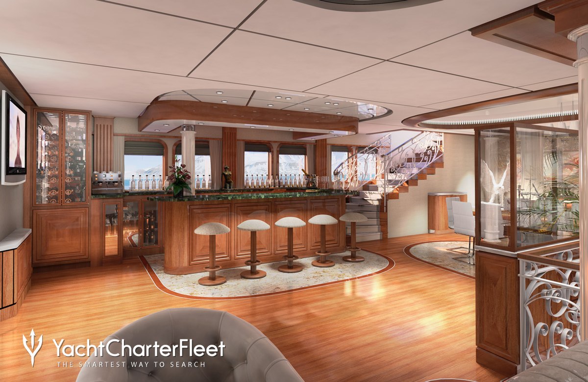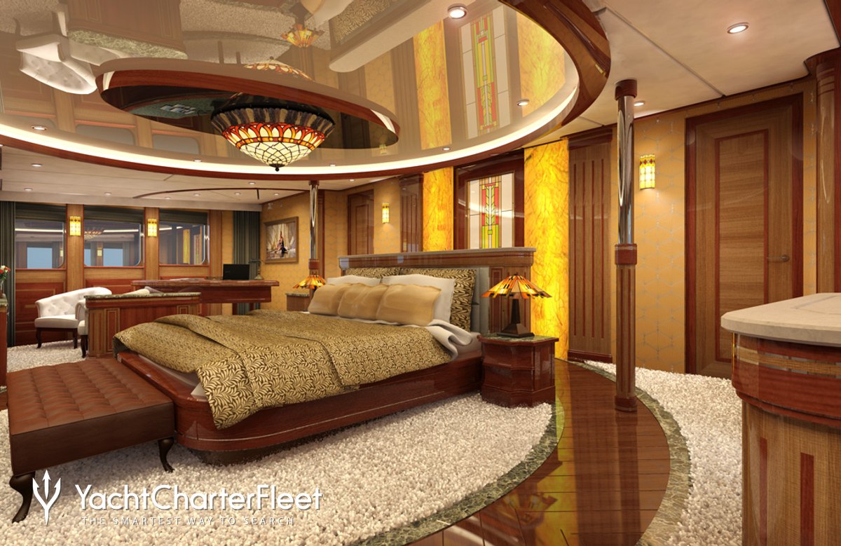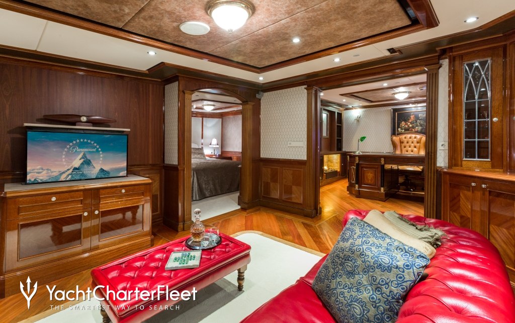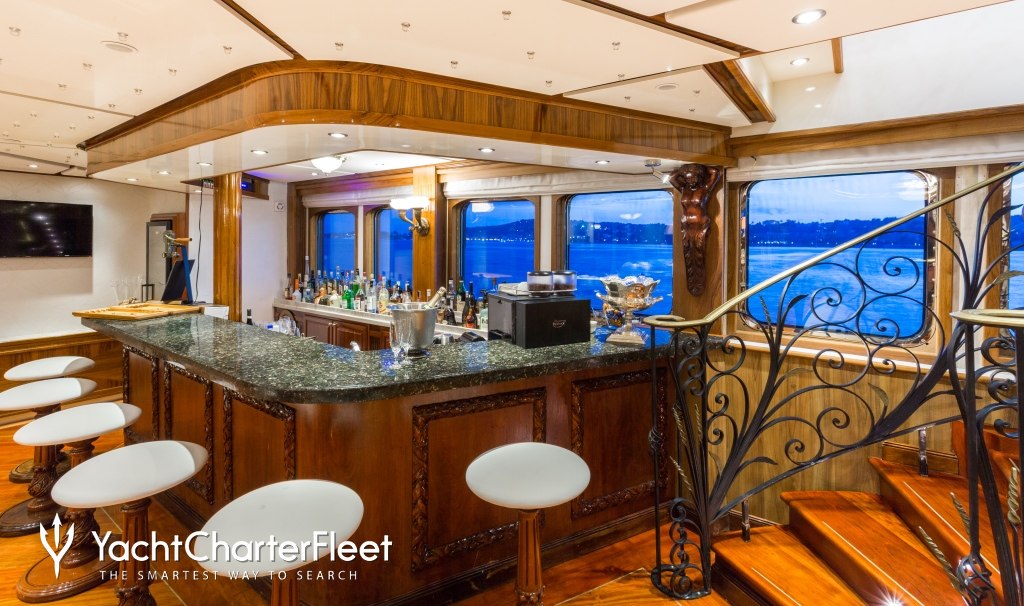 Her entertainment options are spectacular: highlights include her elaborate Balinese spa, featuring almost every conceivable luxury one could think of, a cigar room, a whisky bar, and a 14-seat cinema. But the pièce de résistance is undoubtedly her waterfall-fed, outdoor jacuzzi which can comfortably fit 16 guests.