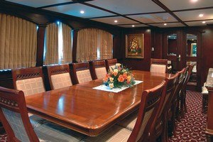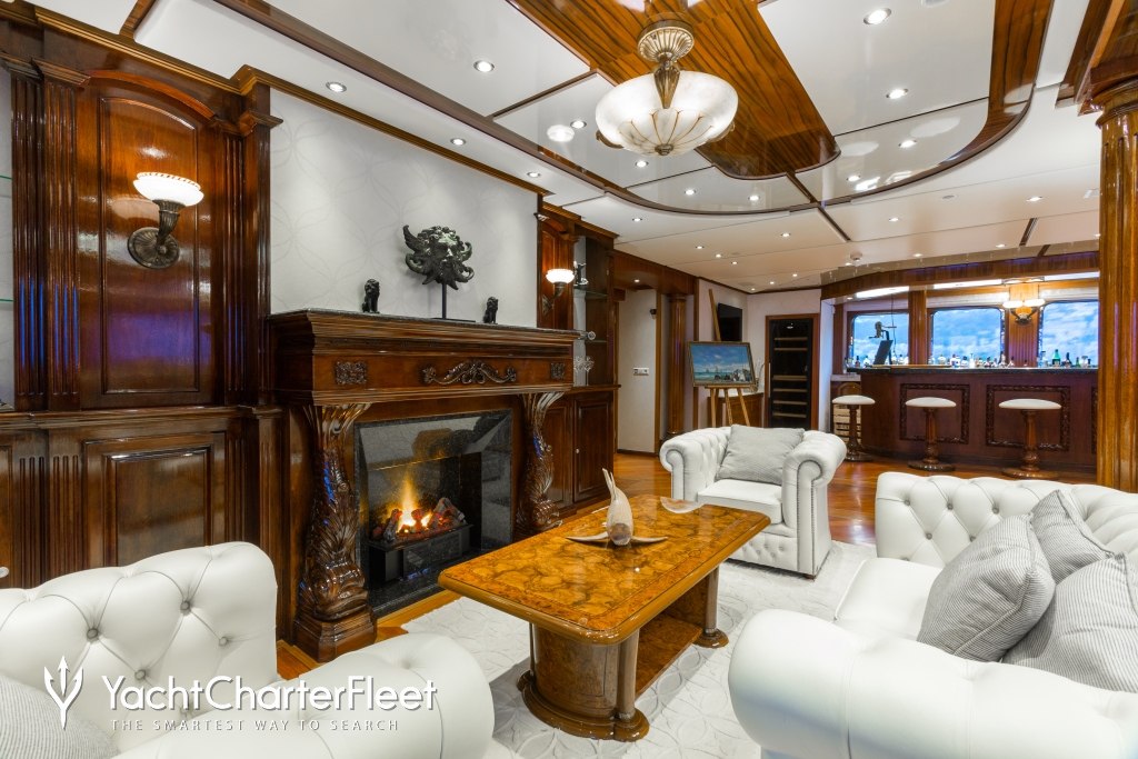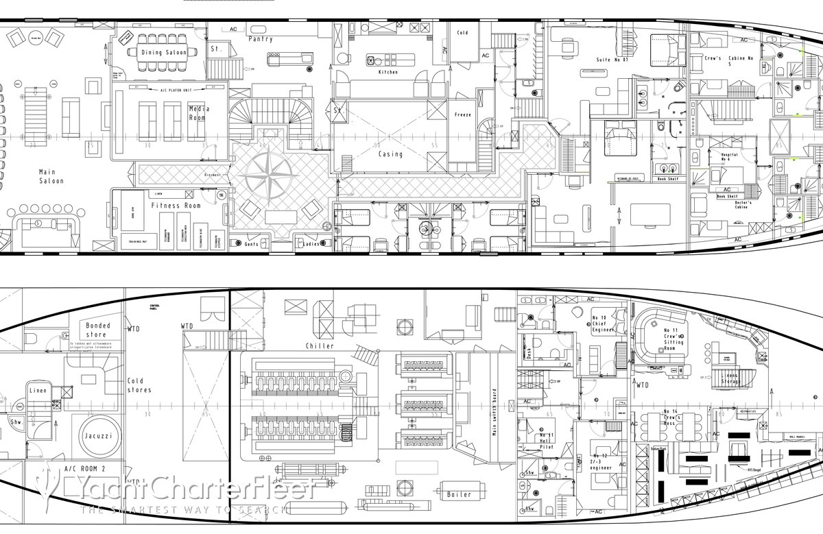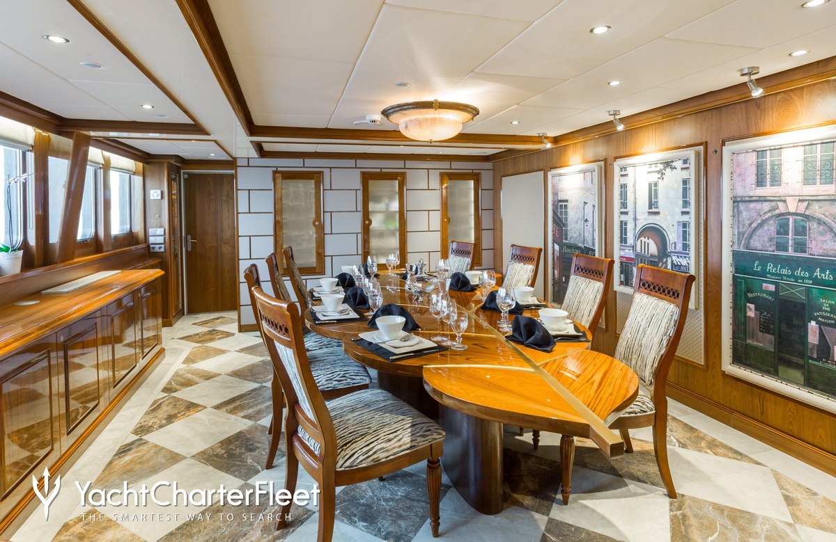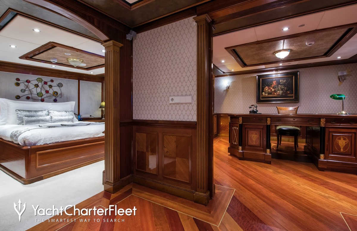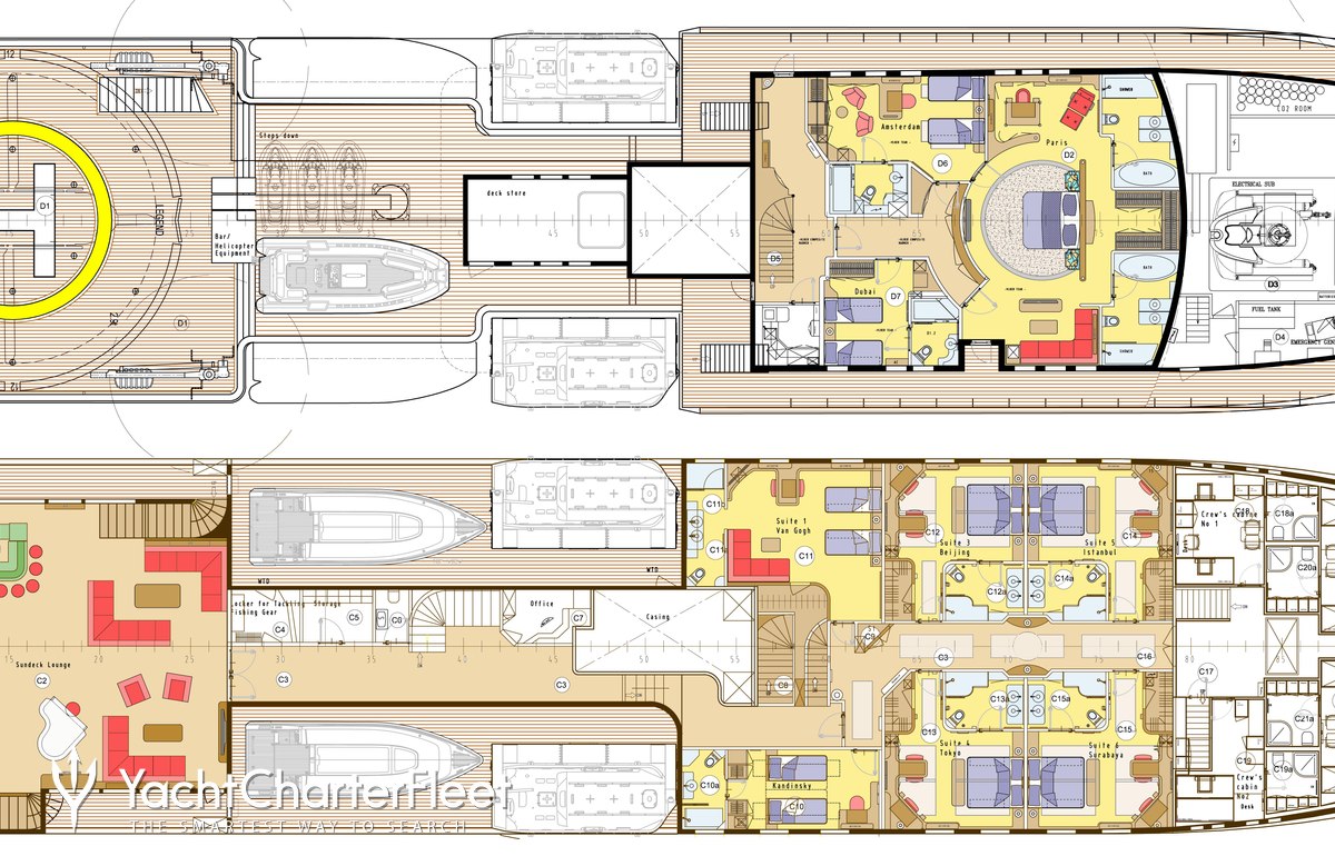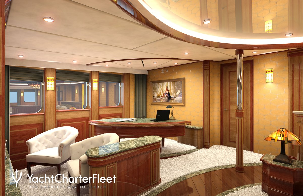 Her entertainment options are spectacular: highlights include her elaborate Balinese spa, featuring almost every conceivable luxury one could think of, a cigar room, a whisky bar, and a 14-seat cinema. But the pièce de résistance is undoubtedly her waterfall-fed, outdoor jacuzzi which can comfortably fit 16 guests.