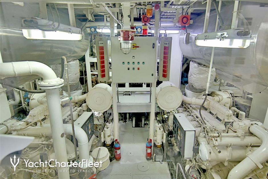 Sojo is built with a steel hull and aluminium superstructure, with teak decks. Sojo comfortably cruises at 12 knots, reaches a maximum speed of 13 knots with a range of up to 2,890 nautical miles from her 147,000 litre fuel tanks at 12 knots. Her water tanks store around 15,830 Litres of fresh water. She was built to Lloyds Register classification society rules.