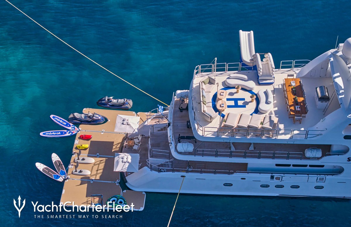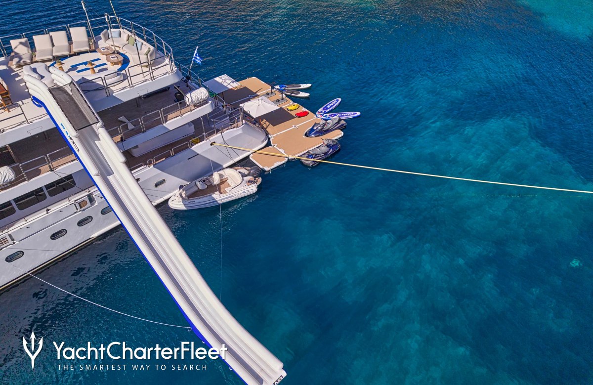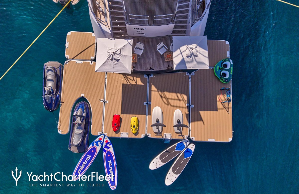 Equipped with a selection of water-toys Sojo lets you and your guests turn the Mediterranean into your own private playground. Principle among these is a waterslide for guests of all ages to enjoy. Take to the sea on the Jet Skis offering you power and control on the water. Also there are two SEABOBs, that allow you to skim along the surface or steer under the crystal water and experience life swimming with the fish.
