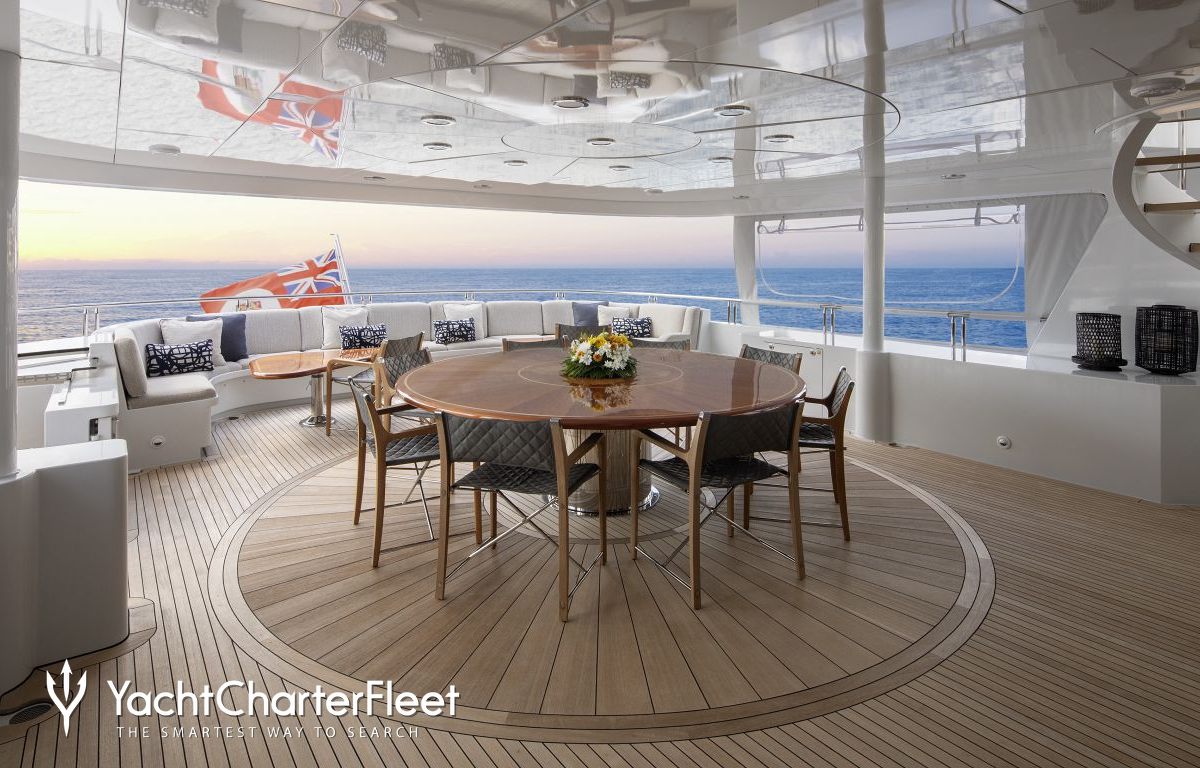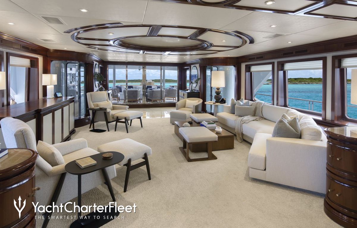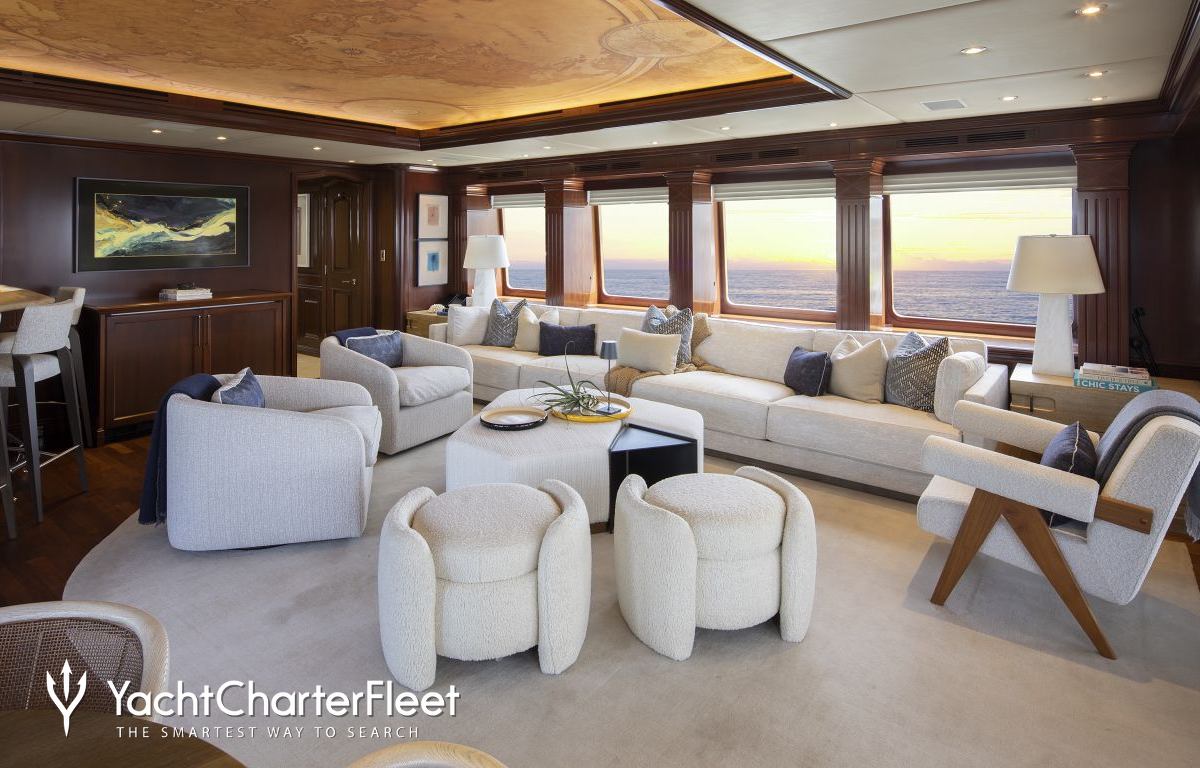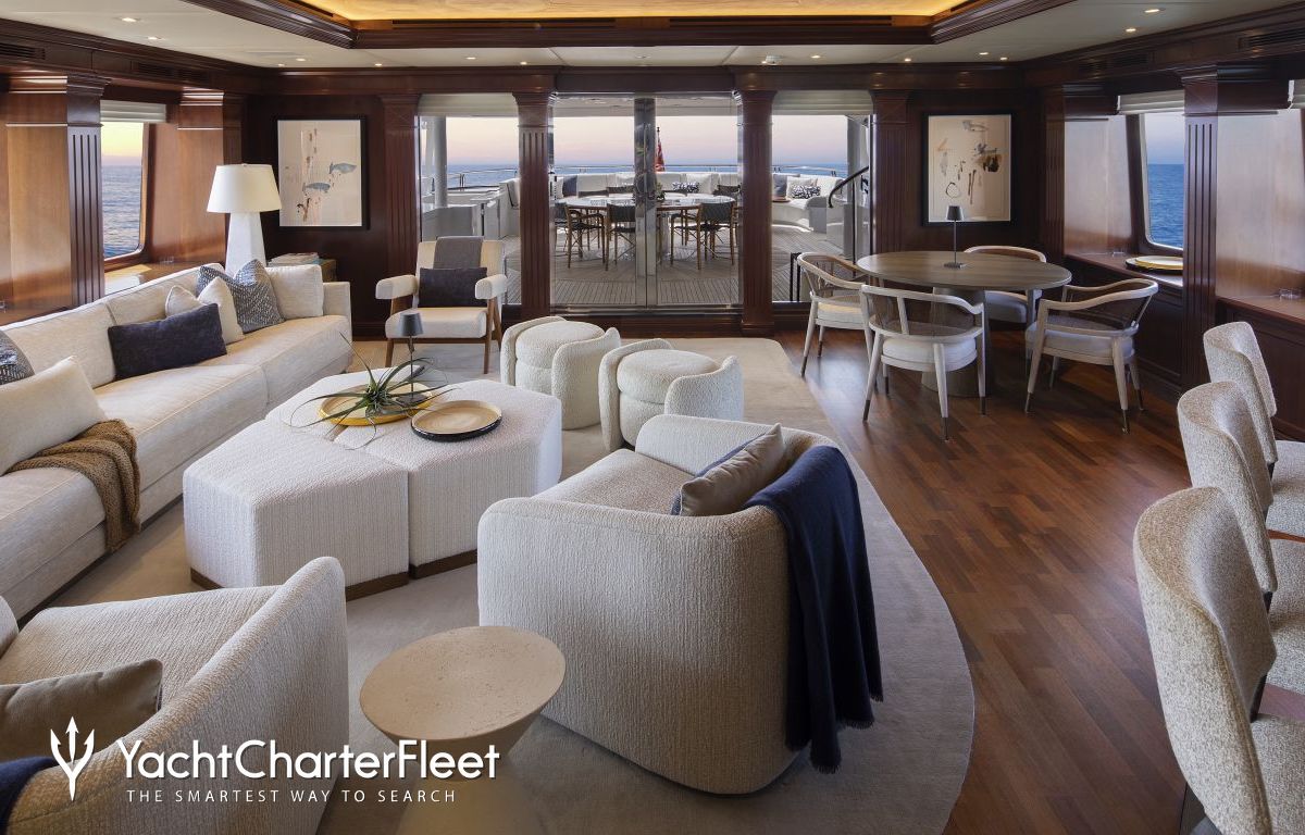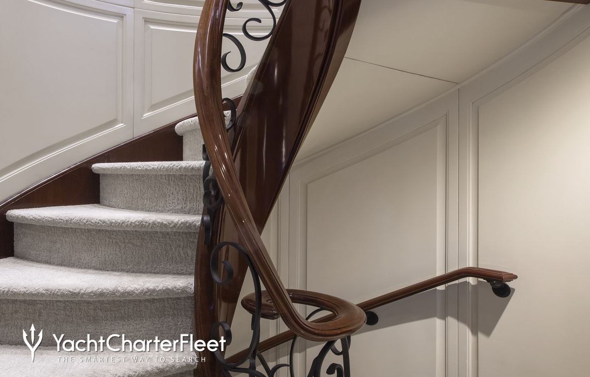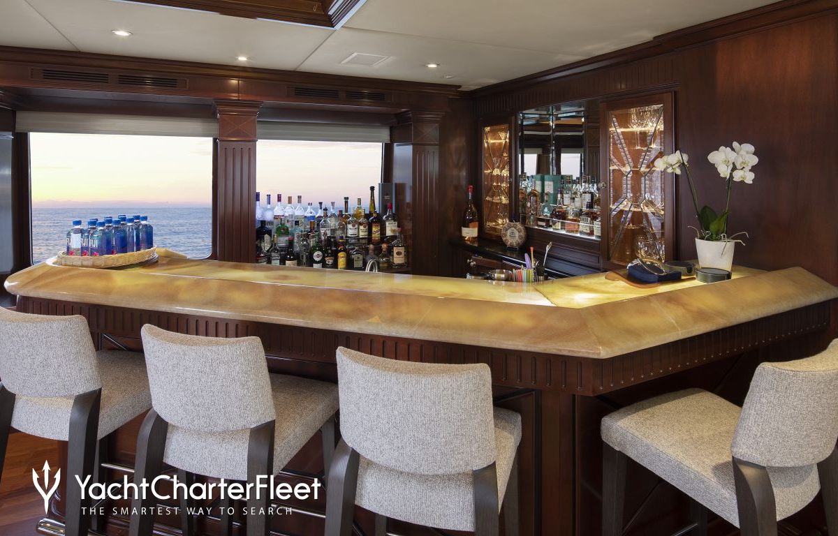 Built with a aluminium hull and aluminium superstructure, with teak decks, she benefits from a semi-displacement hull to provide exceptional seakeeping and impressive speeds. Powered by twin diesel Caterpillar (3512 B) 12-cylinder 2,250hp engines running at 1925rpm, she comfortably cruises at 15 knots, reaches a maximum speed of 19 knots with a range of up to 2,300 nautical miles from her 38,986 litre fuel tanks at 10 knots. An advanced stabilisation system on board promises exceptional comfort levels at anchor or on any voyage. Her water tanks store around 12,112 Litres of fresh water. She was built to ABS (American Bureau of Shipping) ✠A1, Yachting Service, AMS classification society rules, and is MCA Compliant.