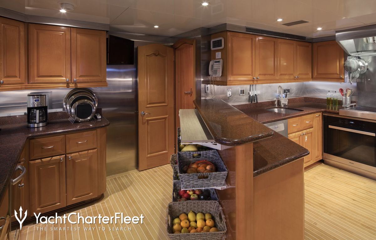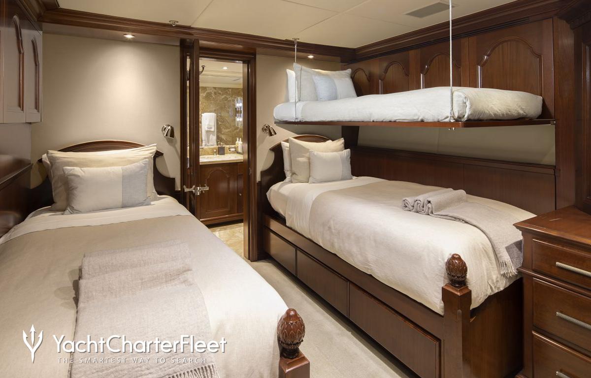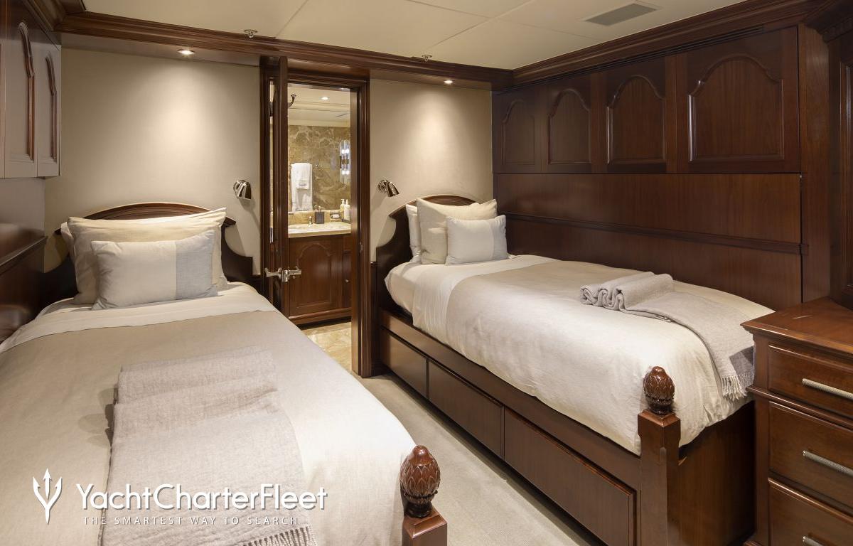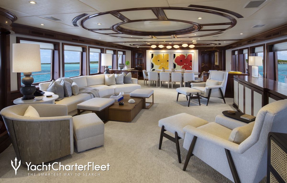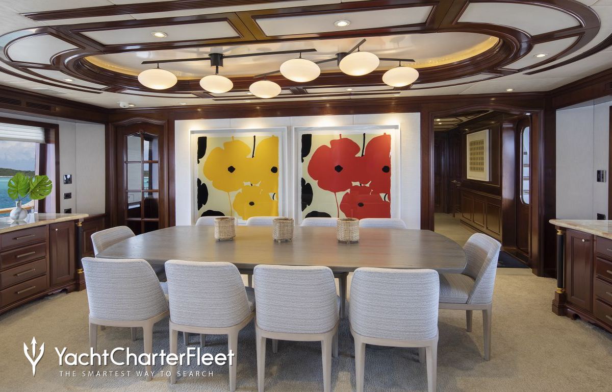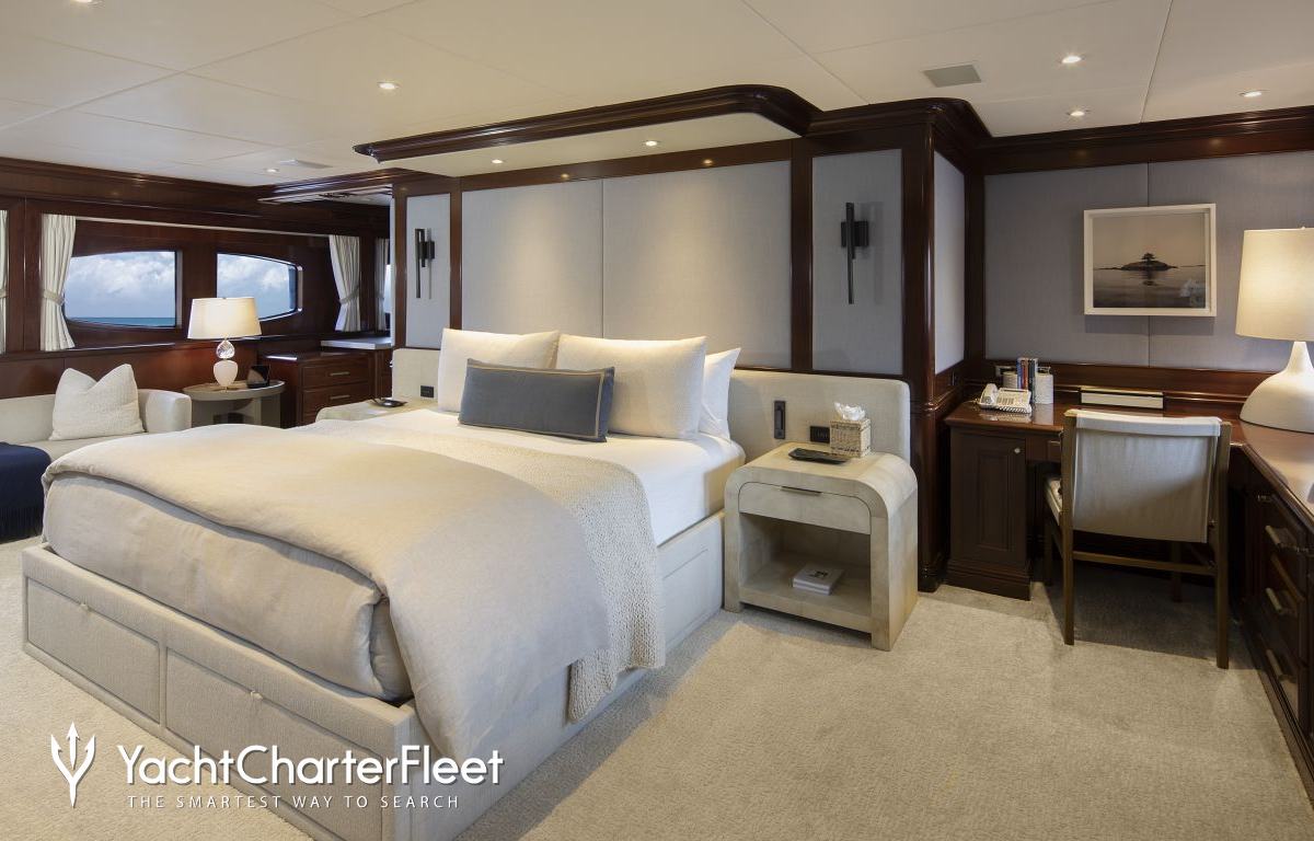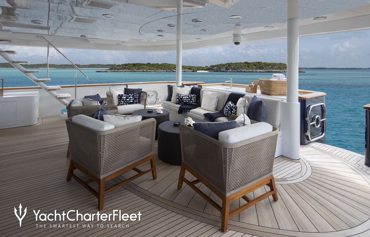 Built with a aluminium hull and aluminium superstructure, with teak decks, she benefits from a semi-displacement hull to provide exceptional seakeeping and impressive speeds. Powered by twin diesel Caterpillar (3512 B) 12-cylinder 2,250hp engines running at 1925rpm, she comfortably cruises at 15 knots, reaches a maximum speed of 19 knots with a range of up to 2,300 nautical miles from her 38,986 litre fuel tanks at 10 knots. An advanced stabilisation system on board promises exceptional comfort levels at anchor or on any voyage. Her water tanks store around 12,112 Litres of fresh water. She was built to ABS (American Bureau of Shipping) ✠A1, Yachting Service, AMS classification society rules, and is MCA Compliant.