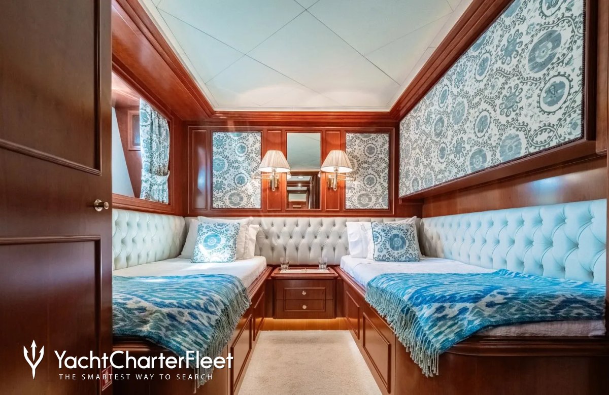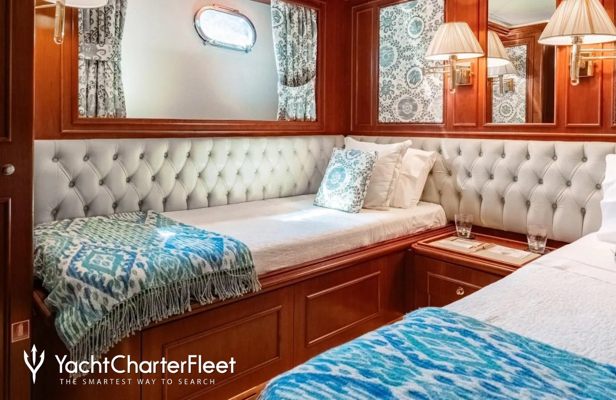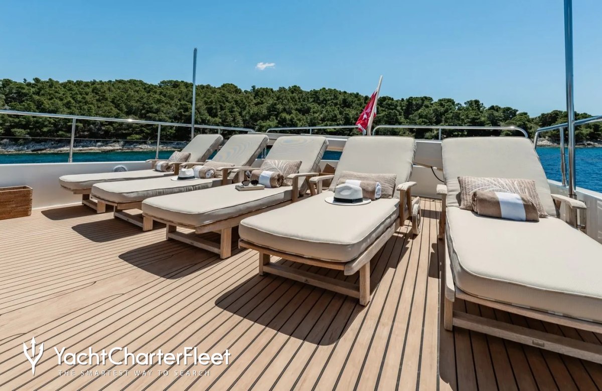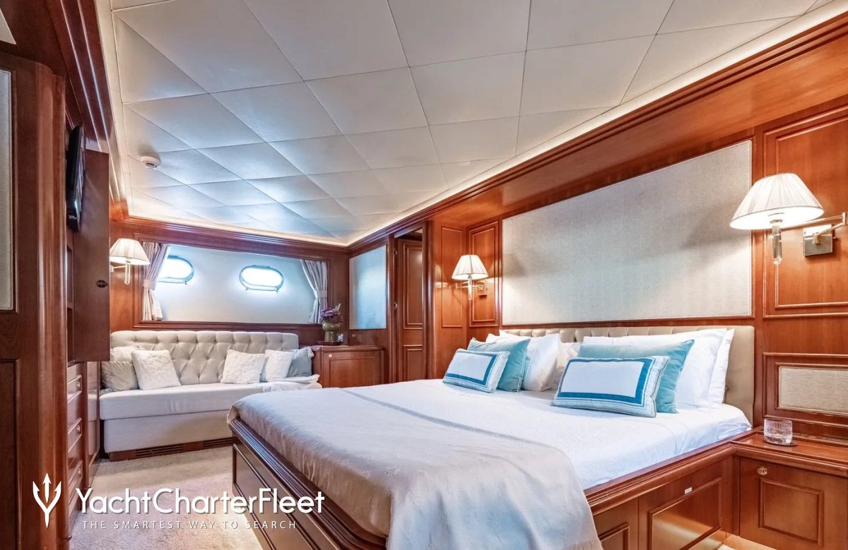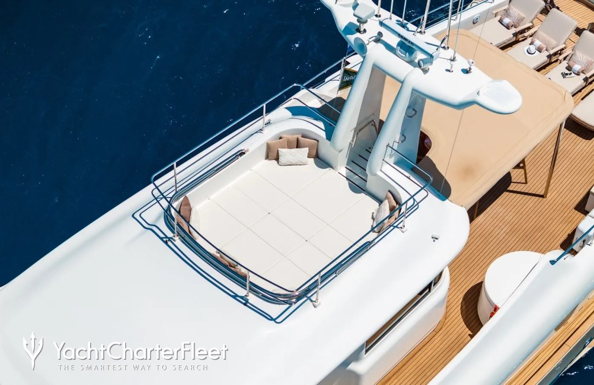 Families will particularly love Imagine thanks to her child-friendly setup. She offers guest accommodation for up to 12 guests with a layout comprising a master suite, one VIP cabin, one double cabin and two twin cabins. There are 9 beds in total, including 3 queen, 4 singles and 2 pullmans. She is also capable of carrying up to 5 crew onboard to ensure a relaxed luxury yacht charter experience.