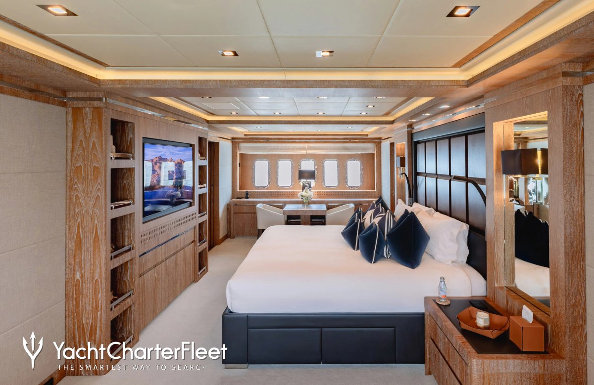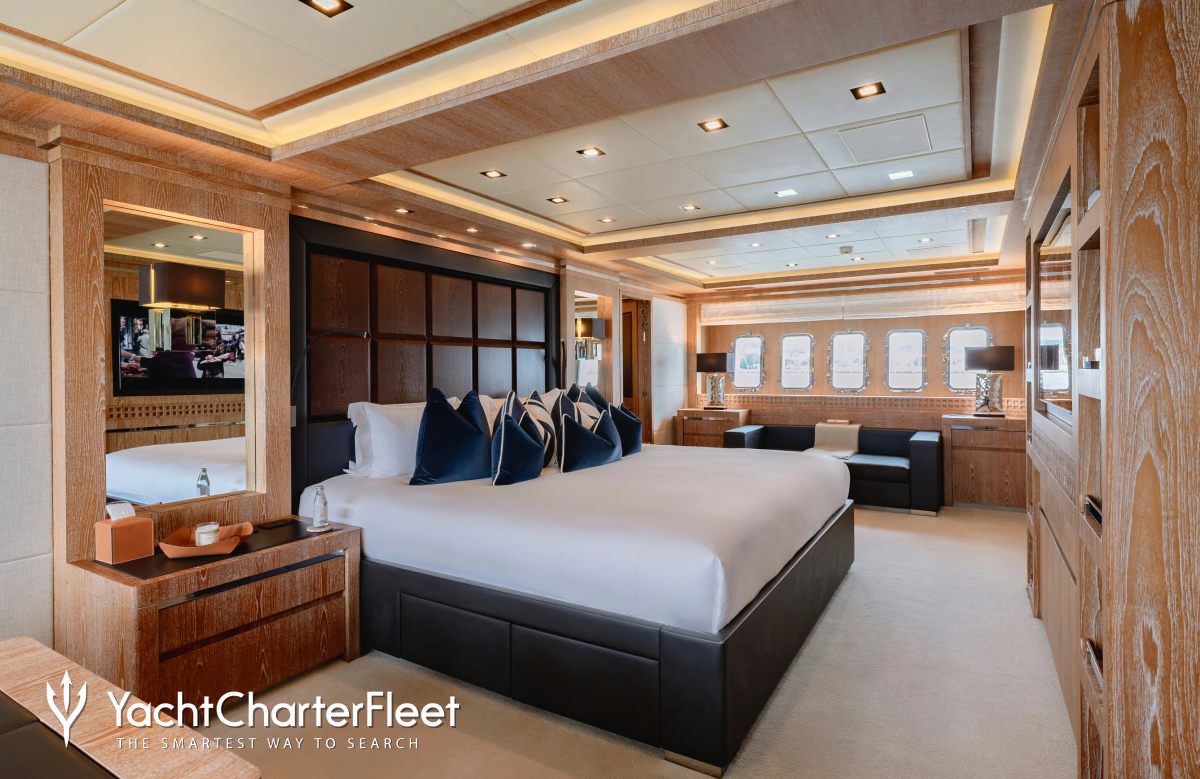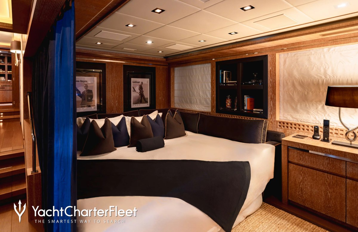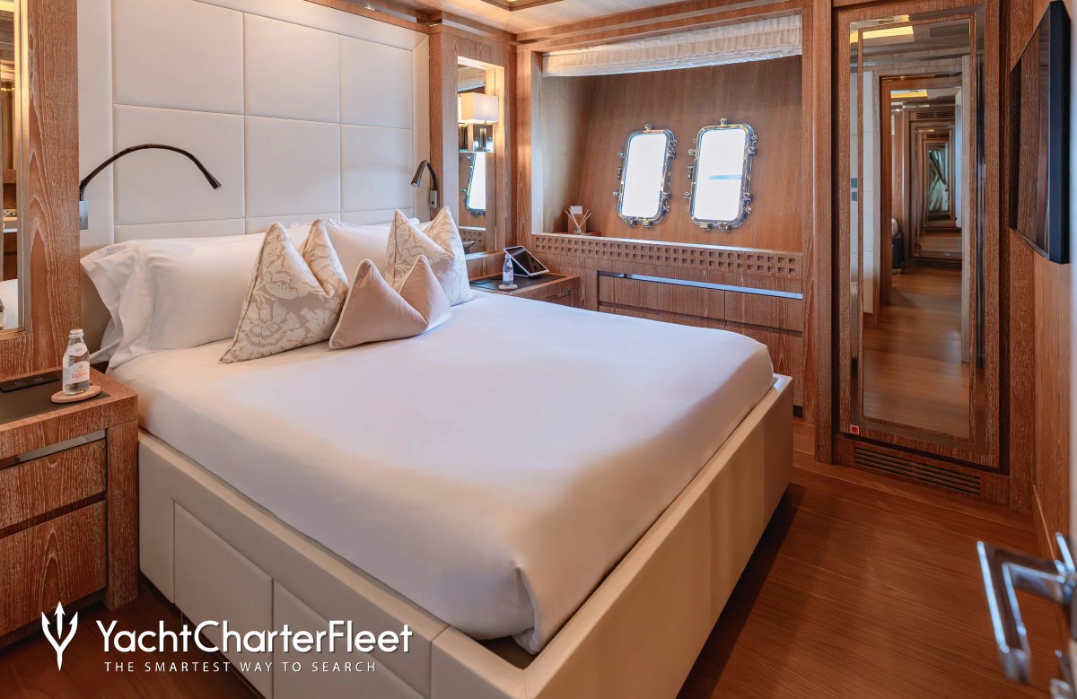 Royale X is great for families thanks to her child-friendly setup. Built in 2012, She offers guest accommodation for up to 10 guests with a layout comprising a master suite, one VIP cabin, one double cabin and one twin cabin. The supremely spacious full beam master suite incorporates its own study and dressing room as well as a his and her bathroom. There are 6 beds in total, including 1 king, 2 queen, 2 singles and 1 pullman. She is also capable of carrying up to 9 crew onboard to ensure a relaxed luxury yacht charter experience.
