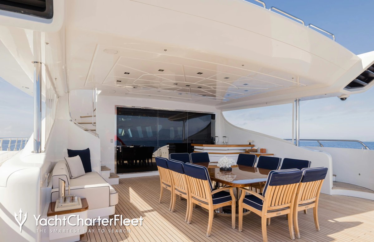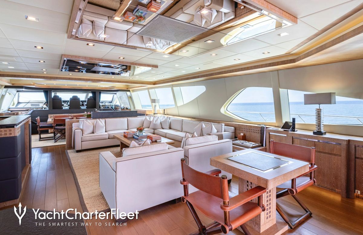 The 49.9m/163'9" open yacht 'Royale X' by the Italian shipyard Mangusta offers flexible accommodation for up to 10 guests in 4 cabins and features interior styling by Valentina Balducci.