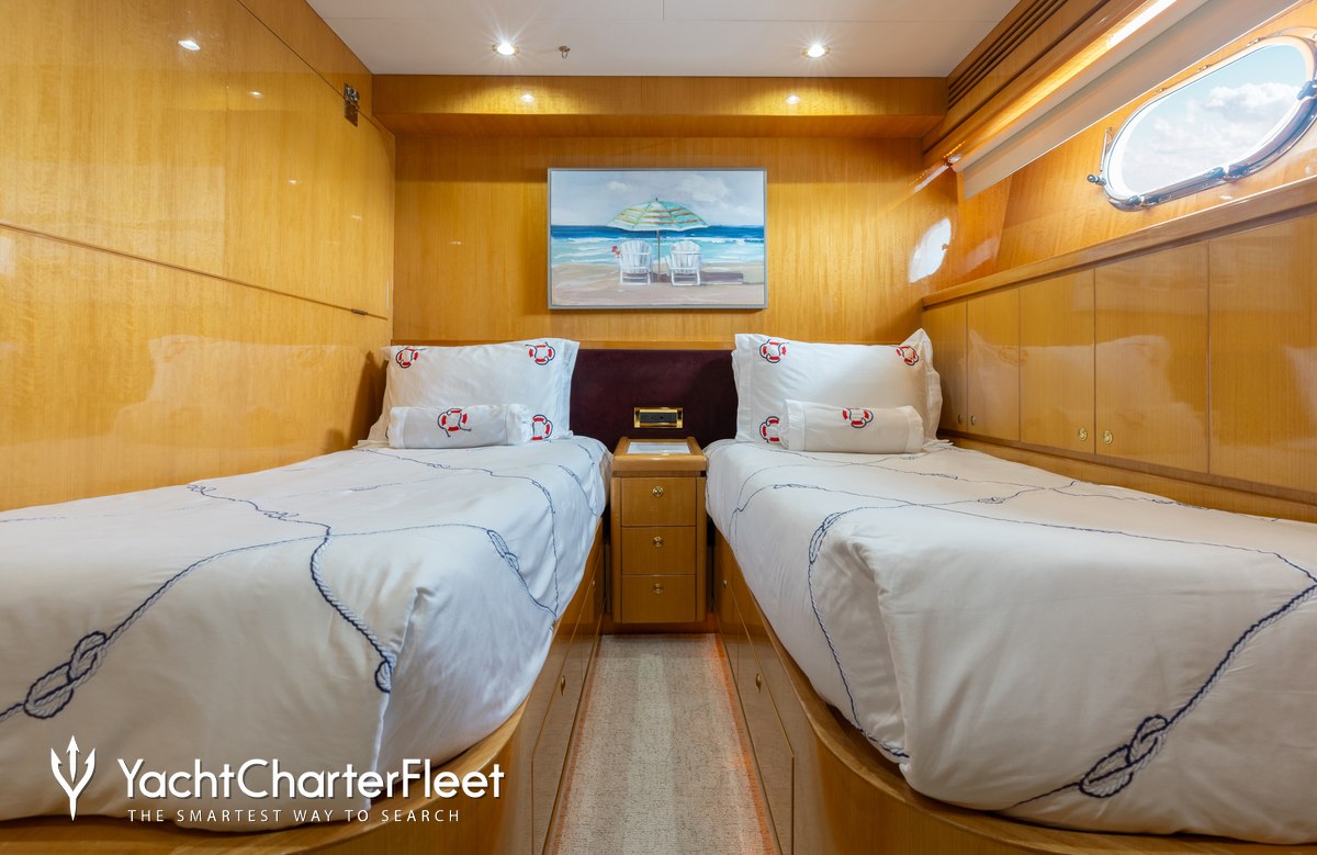 Lady Sandra is great for families thanks to her child-friendly setup. She offers guest accommodation for up to 8 guests with a layout comprising a master suite, one VIP cabin, one double cabin and one twin cabin. There are 6 beds in total, including 1 king, 2 queen, 2 singles and 1 pullman. She is also capable of carrying up to 4 crew onboard to ensure a relaxed luxury yacht charter experience.