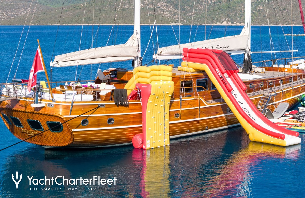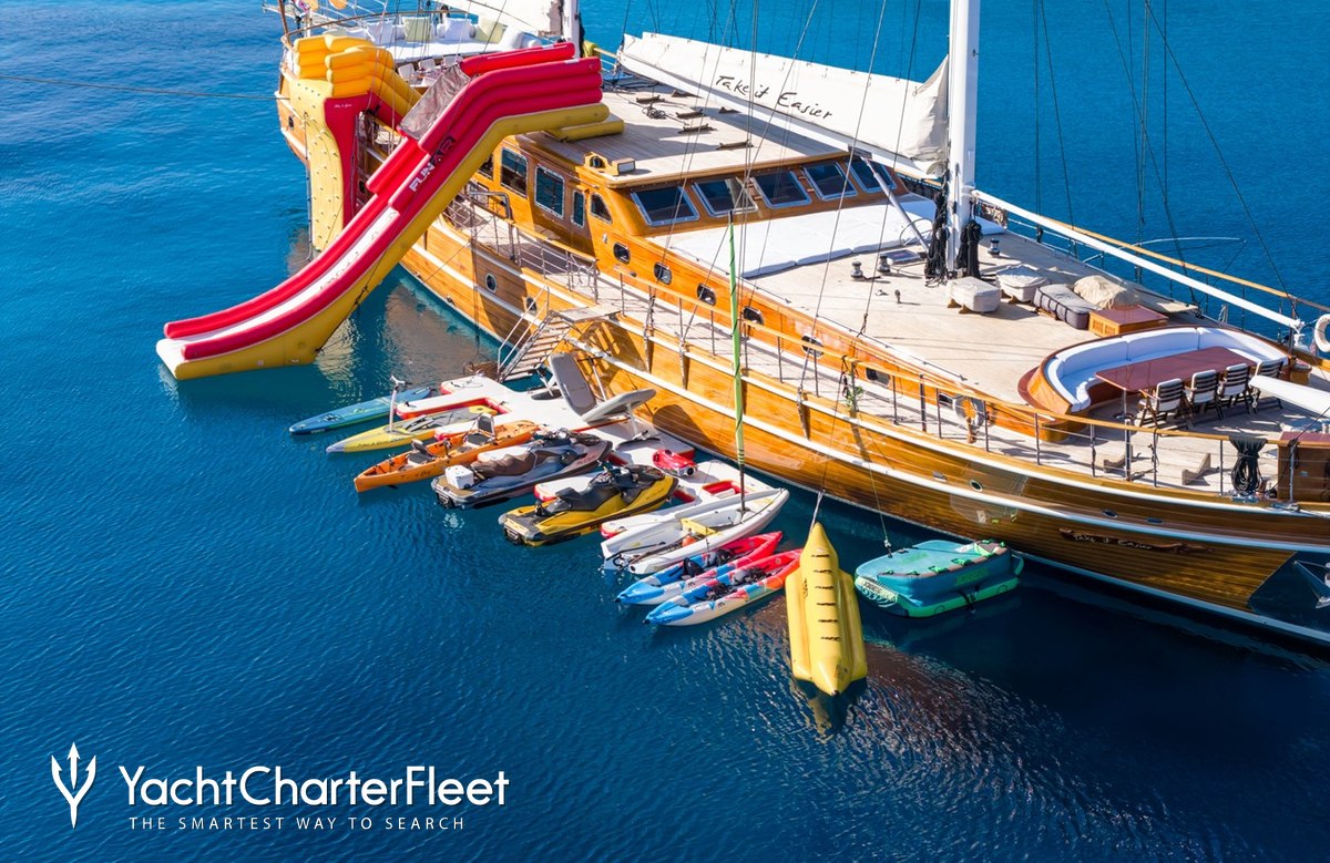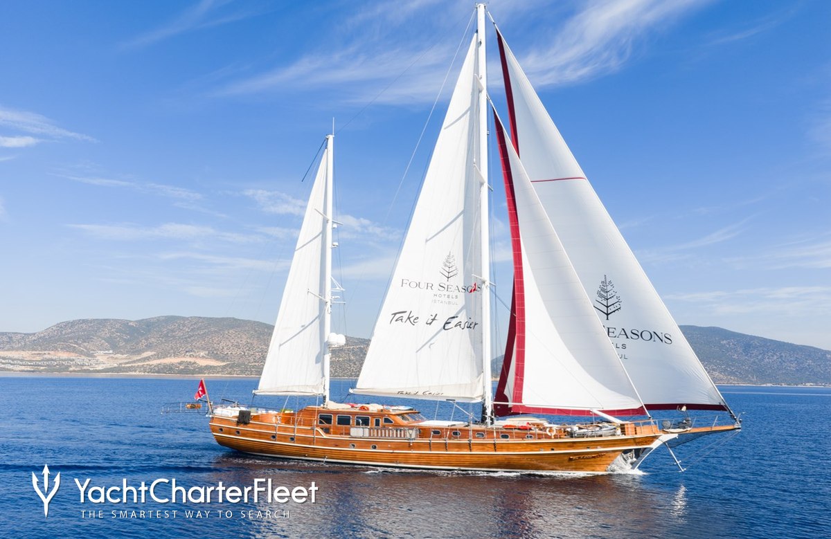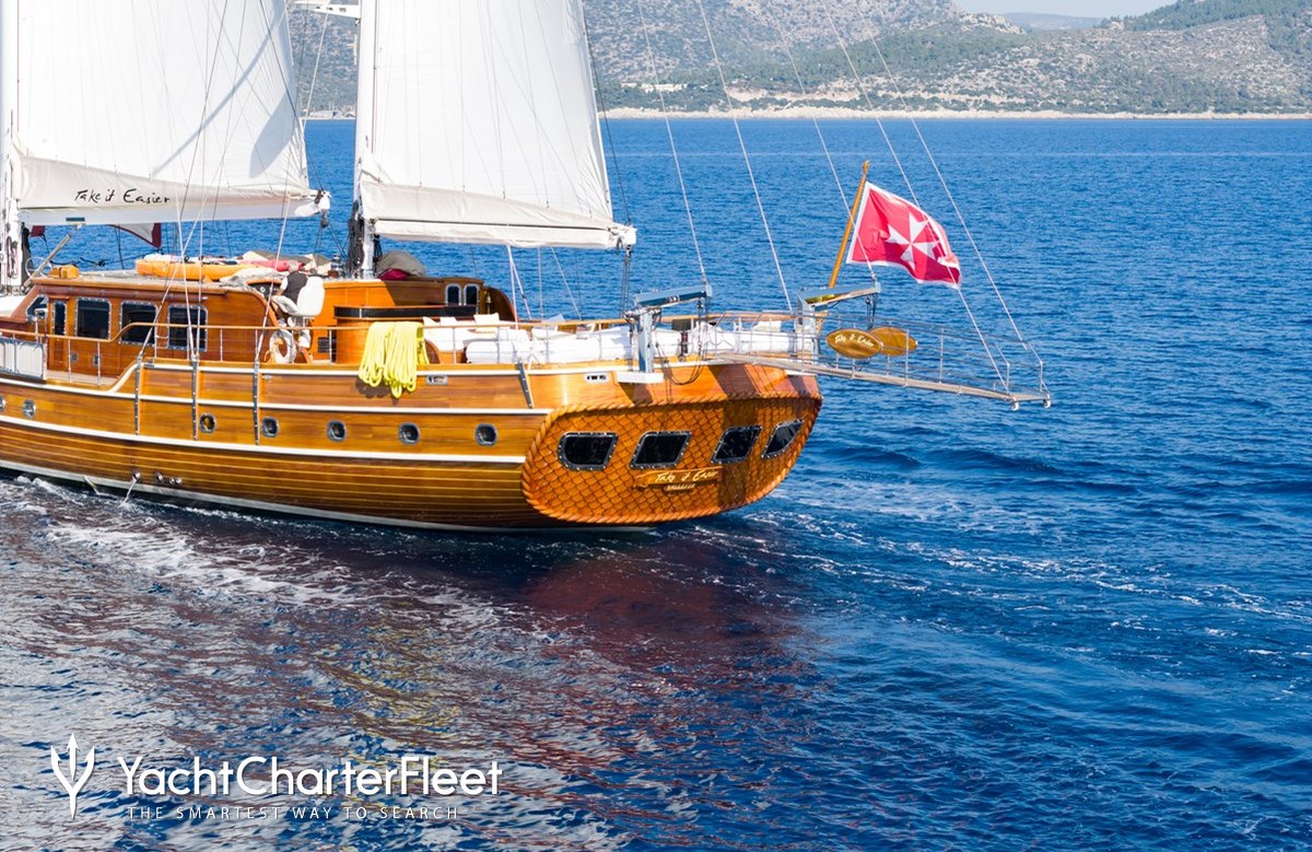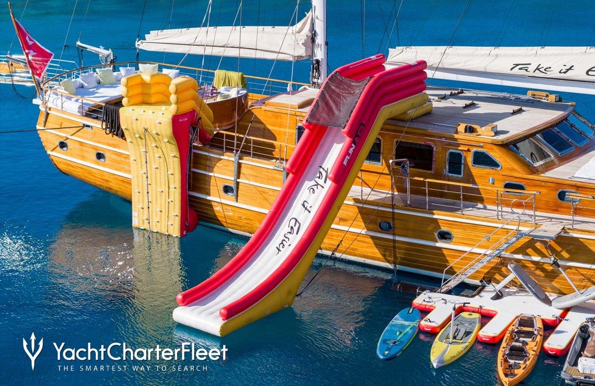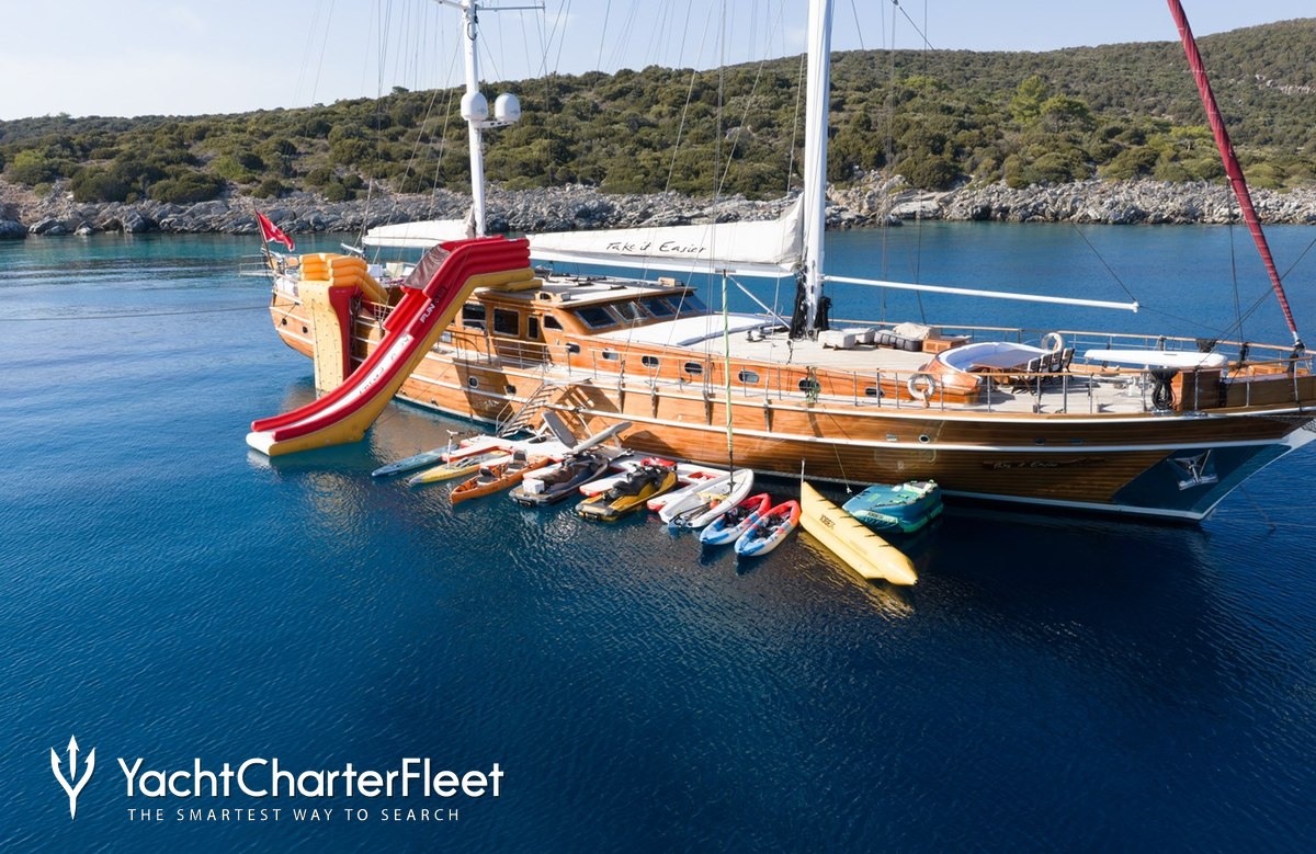 The 38m/124'8" 'Take It Easier' gulet yacht built by shipyard Cavusoglu Yat Imalathanesi is available for charter for up to 11 guests in 5 cabins.
