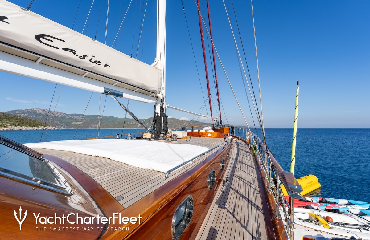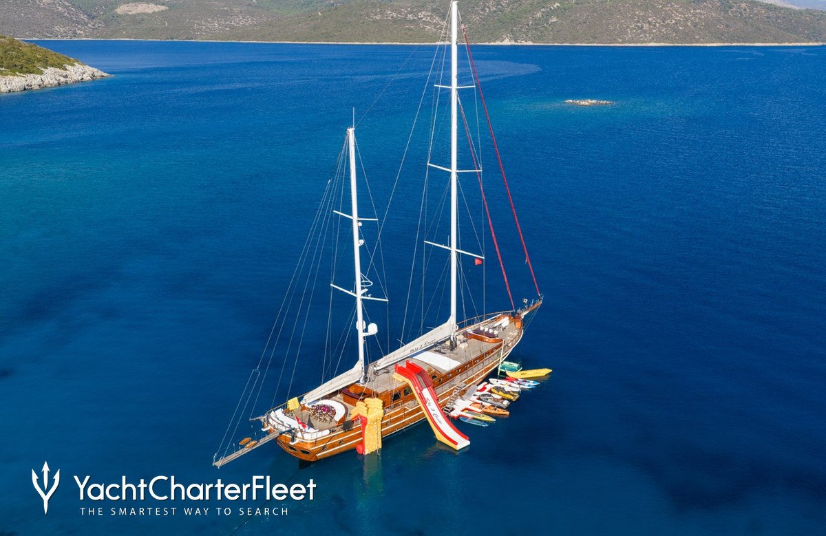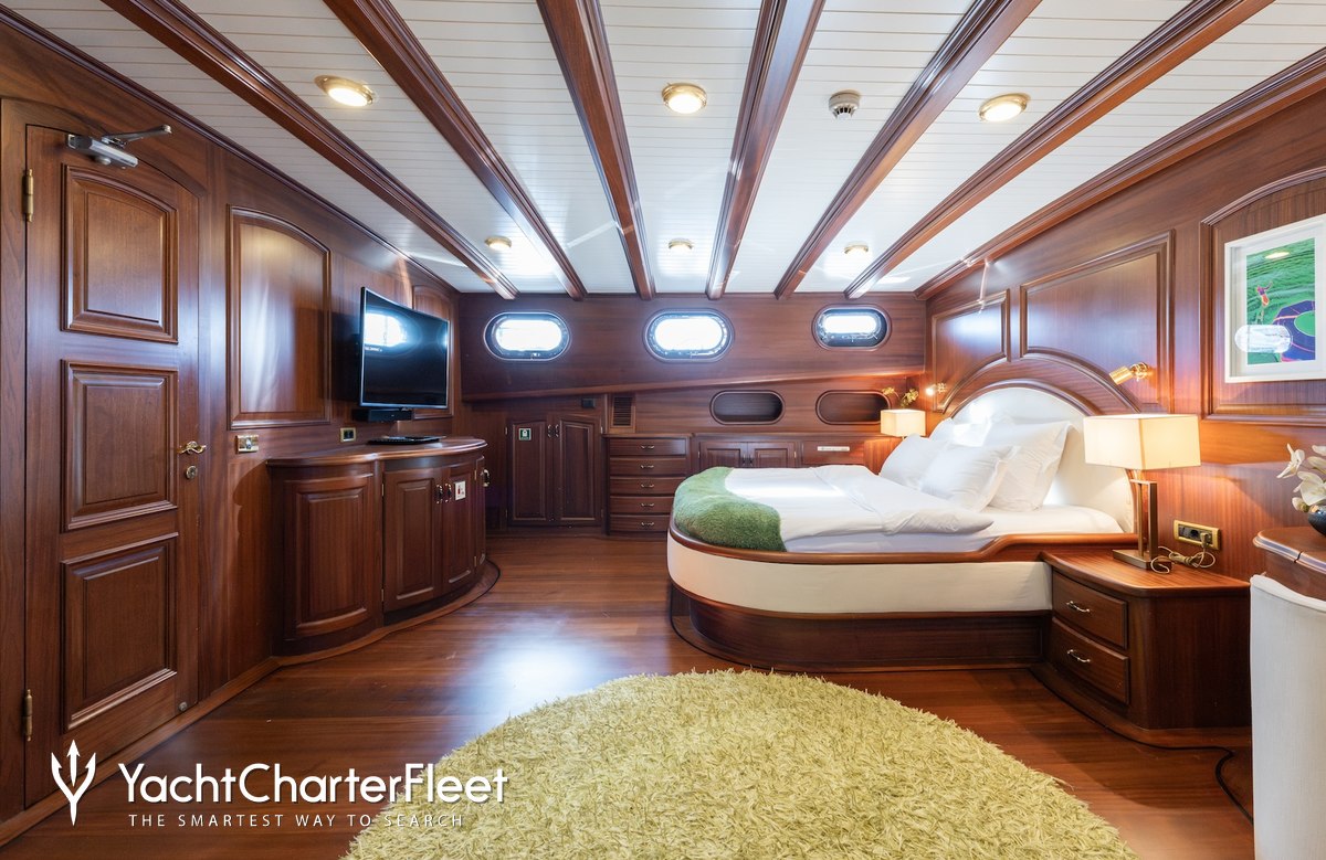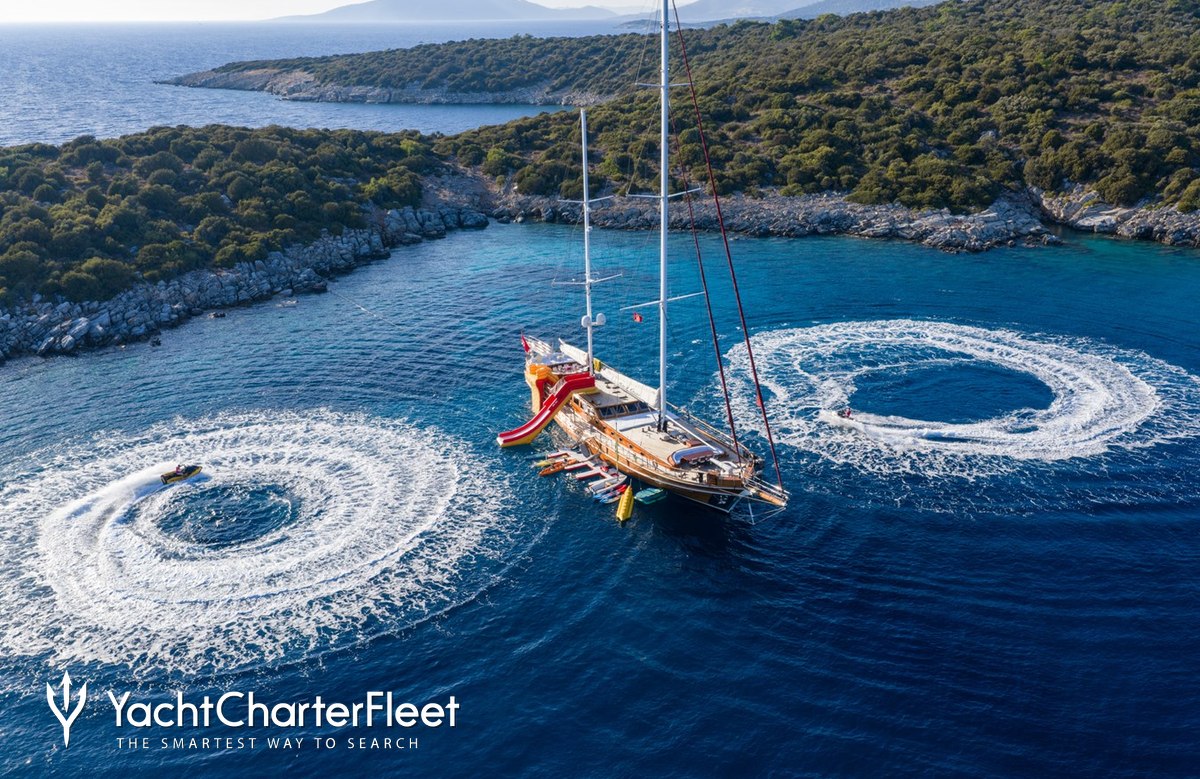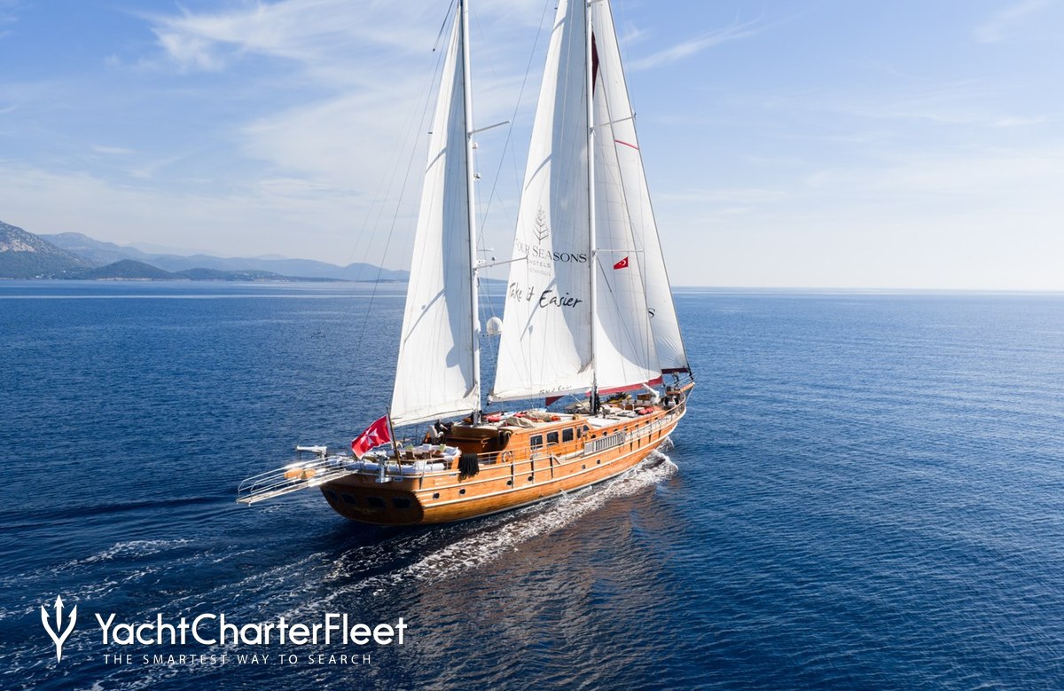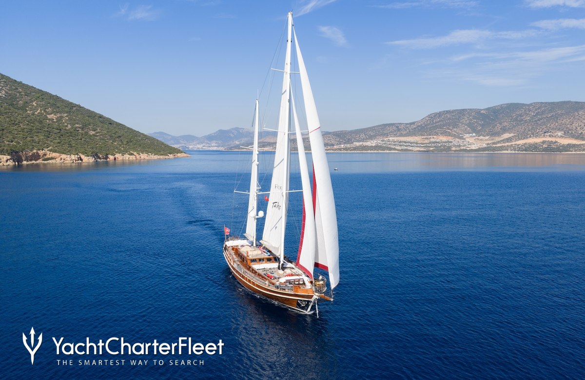 The 38m/124'8" 'Take It Easier' gulet yacht built by shipyard Cavusoglu Yat Imalathanesi is available for charter for up to 11 guests in 5 cabins.