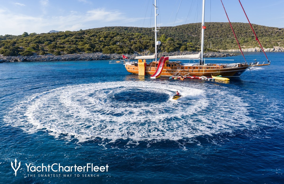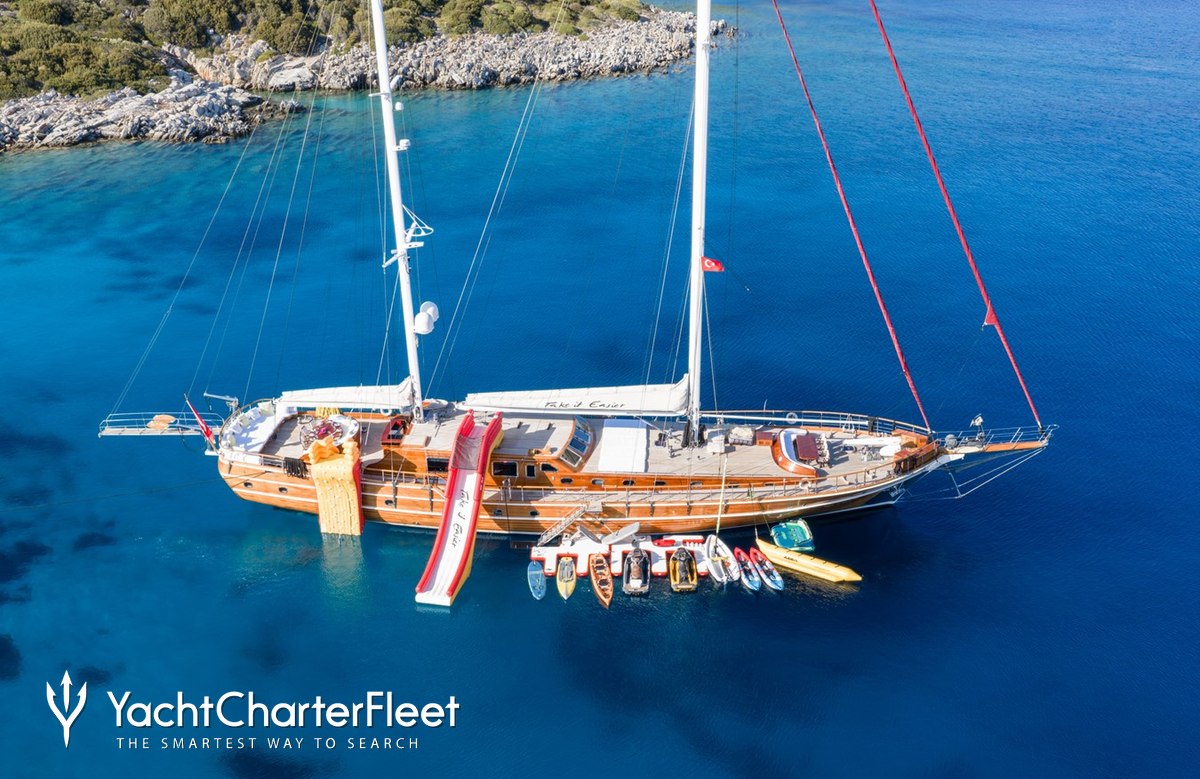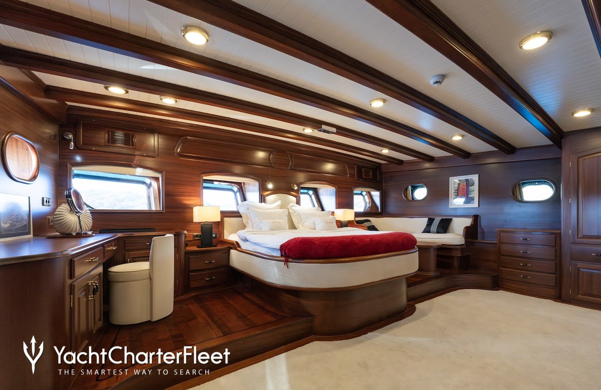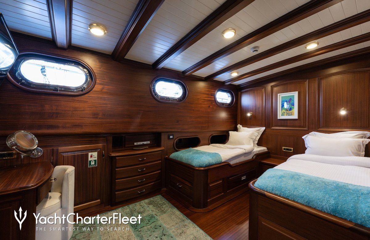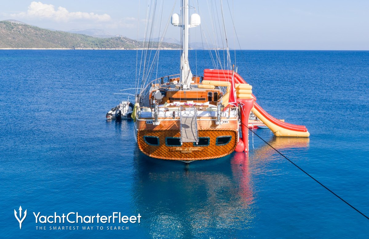 The 38m/124'8" 'Take It Easier' gulet yacht built by shipyard Cavusoglu Yat Imalathanesi is available for charter for up to 11 guests in 5 cabins.