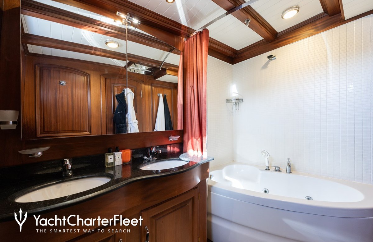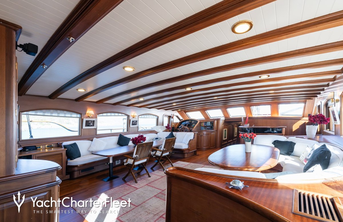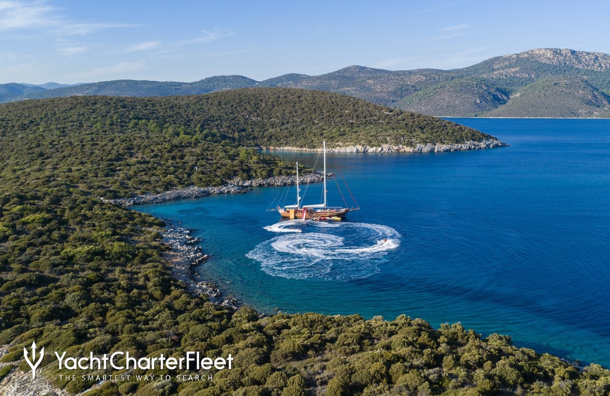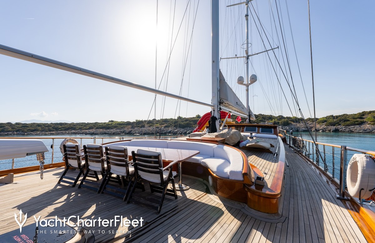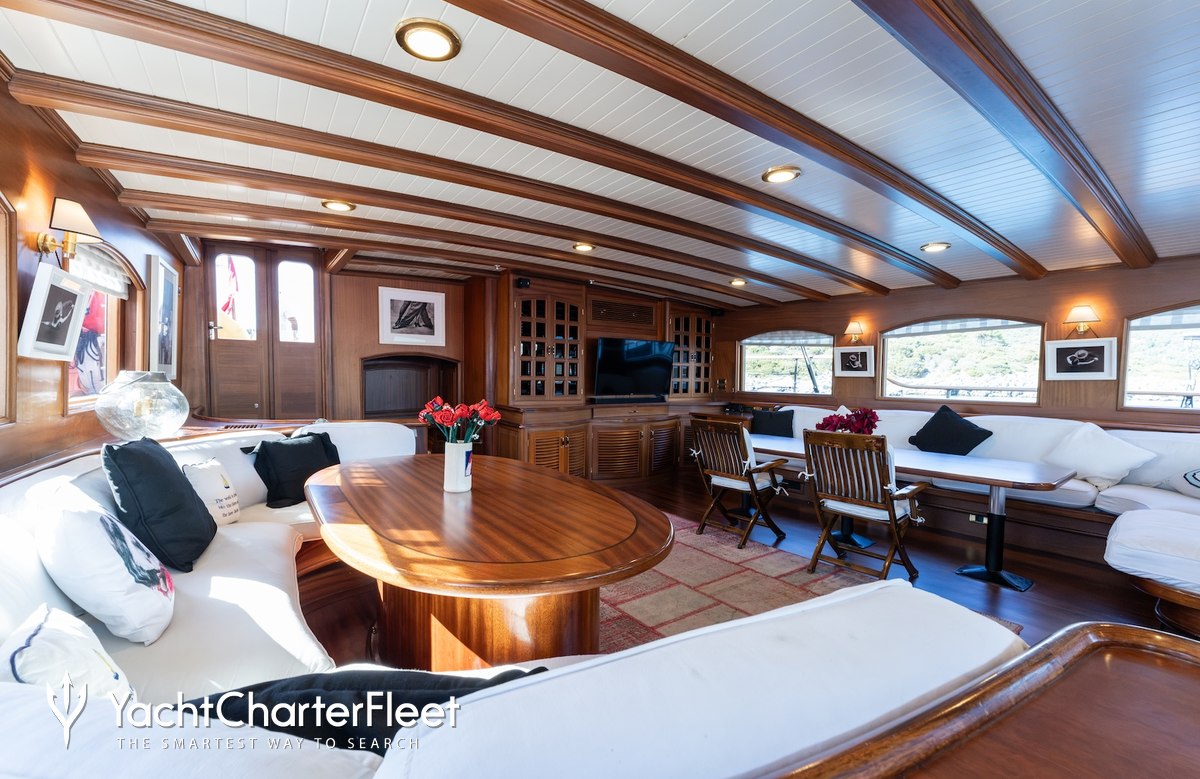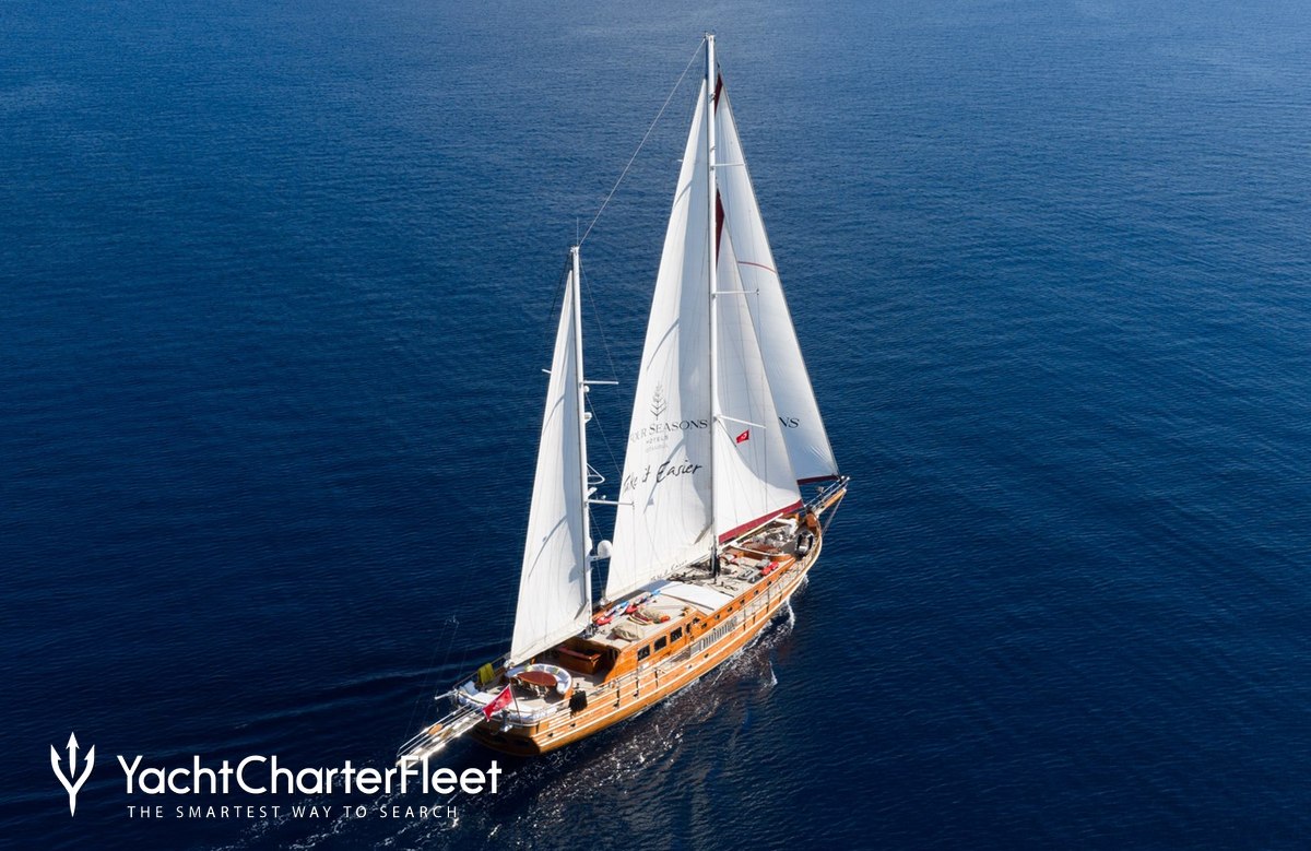 The 38m/124'8" 'Take It Easier' gulet yacht built by shipyard Cavusoglu Yat Imalathanesi is available for charter for up to 11 guests in 5 cabins.