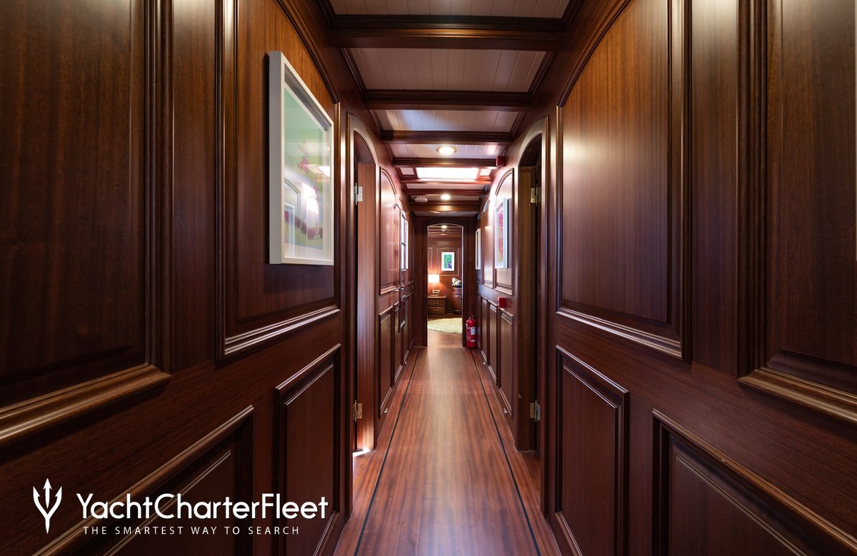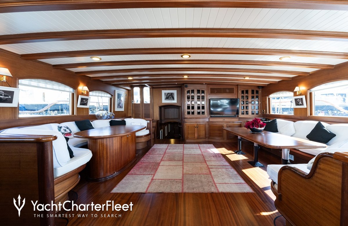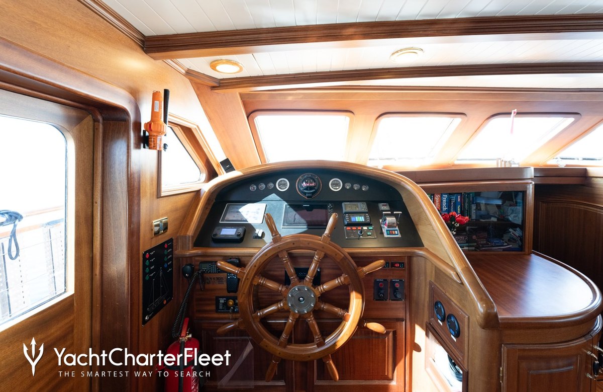 Take It Easier is built with a wood hull and wood superstructure. Powered by twin MAN engines, she comfortably cruises at 10 knots, reaches a maximum speed of 13 knots.