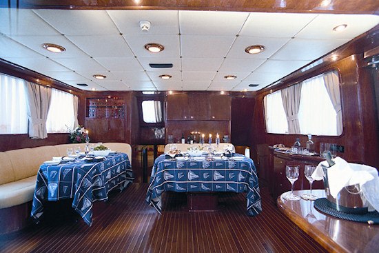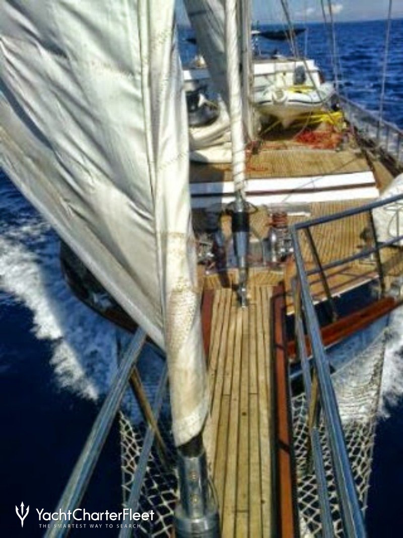 Troia is built with a wood hull and wood superstructure. Troia comfortably cruises at 12 knots, reaches a maximum speed of 13 knots.