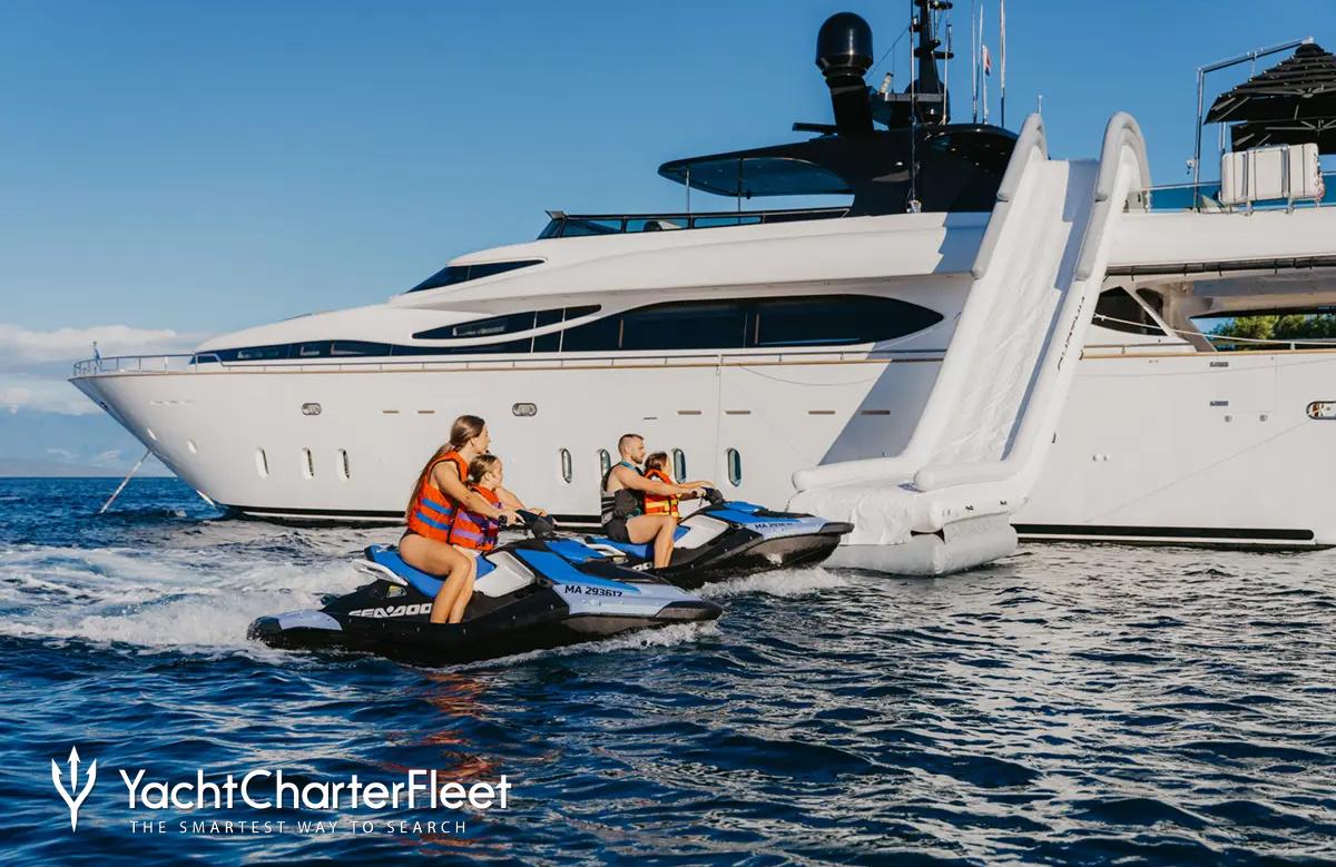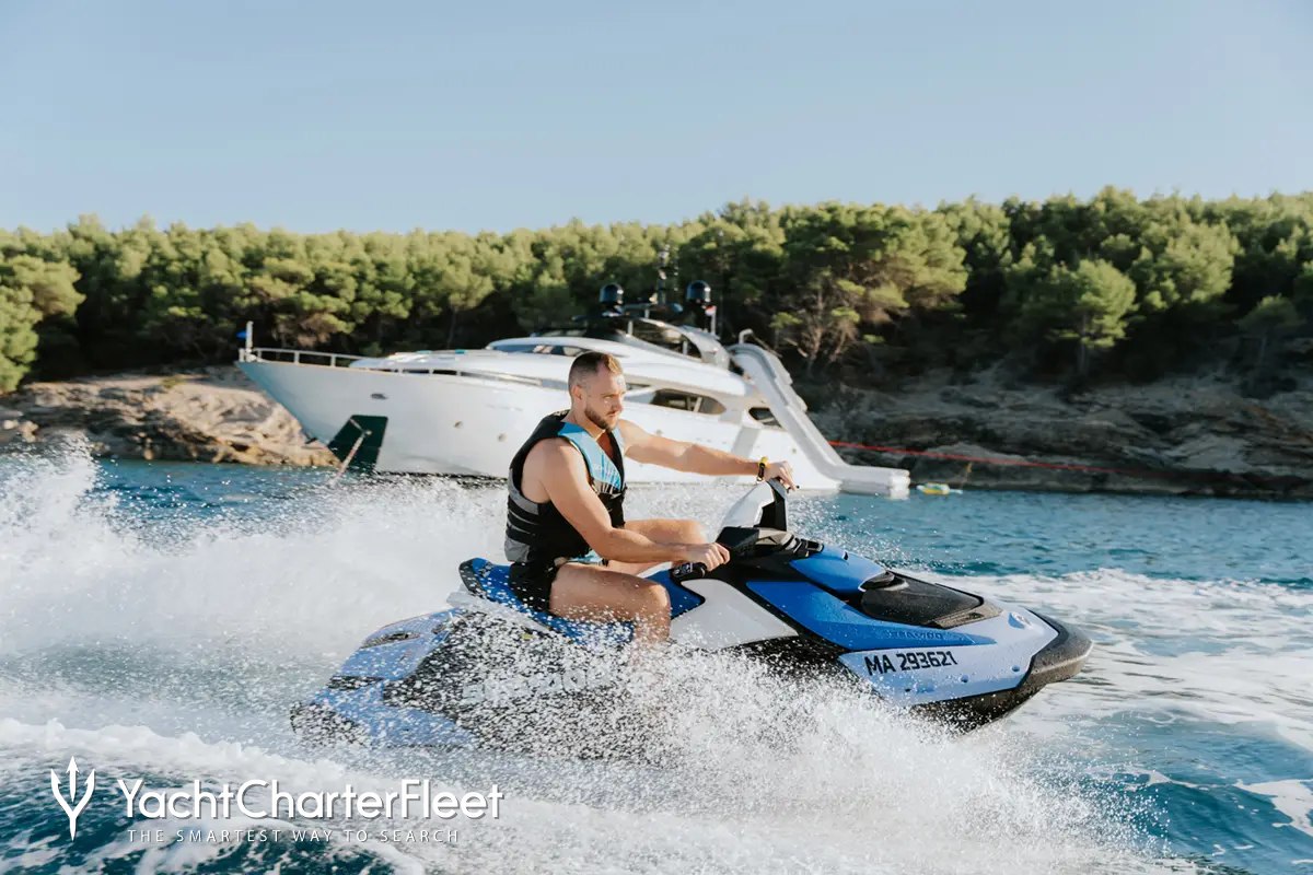 When not cruising Cynthia has onboard an incredible selection of water toys and accessories for you and your guests to connect with the waters around you. Principle among these is a waterslide for hours of fun for all ages. Take to the sea on the Jet Skis offering you power and control on the water. Also there are waterskis that are hugely entertaining whether you are a beginner or a seasoned pro. If that isn't enough Cynthia also features a seabob, paddleboards and snorkelling equipment. Cynthia also sports a 8m/26'3" Bura Tender to transport you with ease.