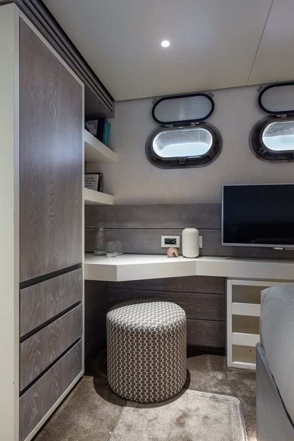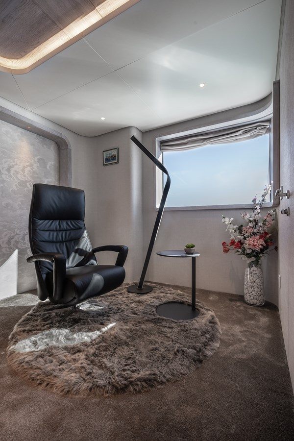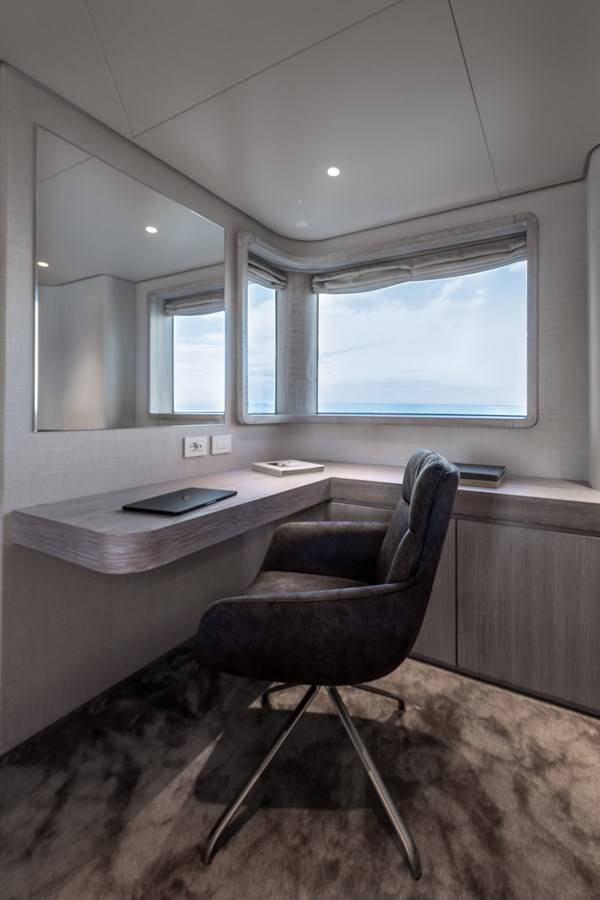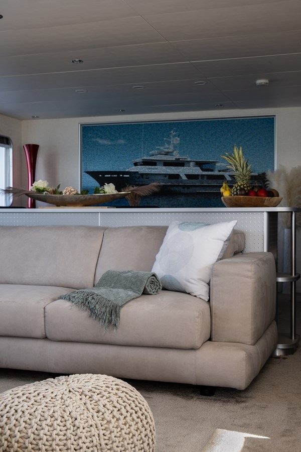 Built with a steel hull and aluminium superstructure, she offers greater on-board space and is more stable when at anchor thanks to her full-displacement hull. Powered by twin Caterpillar engines, she comfortably cruises at 10 knots, reaches a maximum speed of 13 knots with a range of up to 4,800 nautical miles from her 51,300 litre fuel tanks at cruising speed. B89 features at-anchor stabilizers providing exceptional comfort levels.