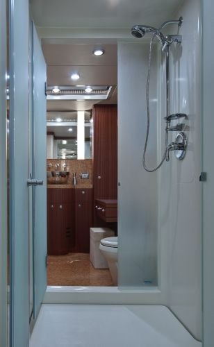 Built with a GRP hull and GRP superstructure, she benefits from a semi-displacement hull to provide exceptional seakeeping and impressive speeds. Her low draft of 1.7m/5'7" makes her primed for accessing shallow areas and cruising close to the shorelines. Her water tanks store around 550 Gallons of fresh water.