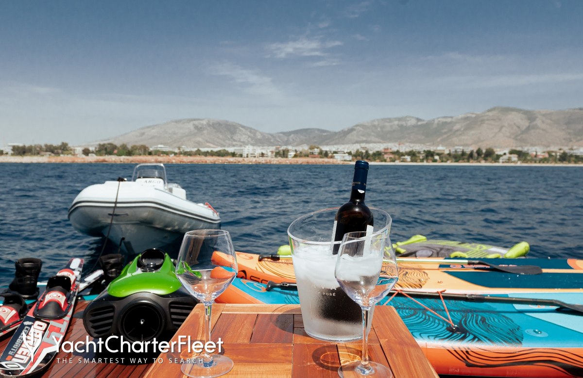 Irene has a good selection of water toys and accessories to entertain you and your guests whilst on charter. Principle among these are towable toys offering fun and adventure. Additionally, there are waterskis that are hugely entertaining whether you are a beginner or a seasoned pro. Another excellent feature is a F5 SEABOB, that allow you to skim along the surface or steer under the crystal water and experience life swimming with the fish. If that isn't enough Irene also features kayaks, fishing equipment, inflatable water toys, paddleboards and snorkelling equipment. Irene has a 3.9m/12'10" Highfield Tender to transfer you from ship to shore.