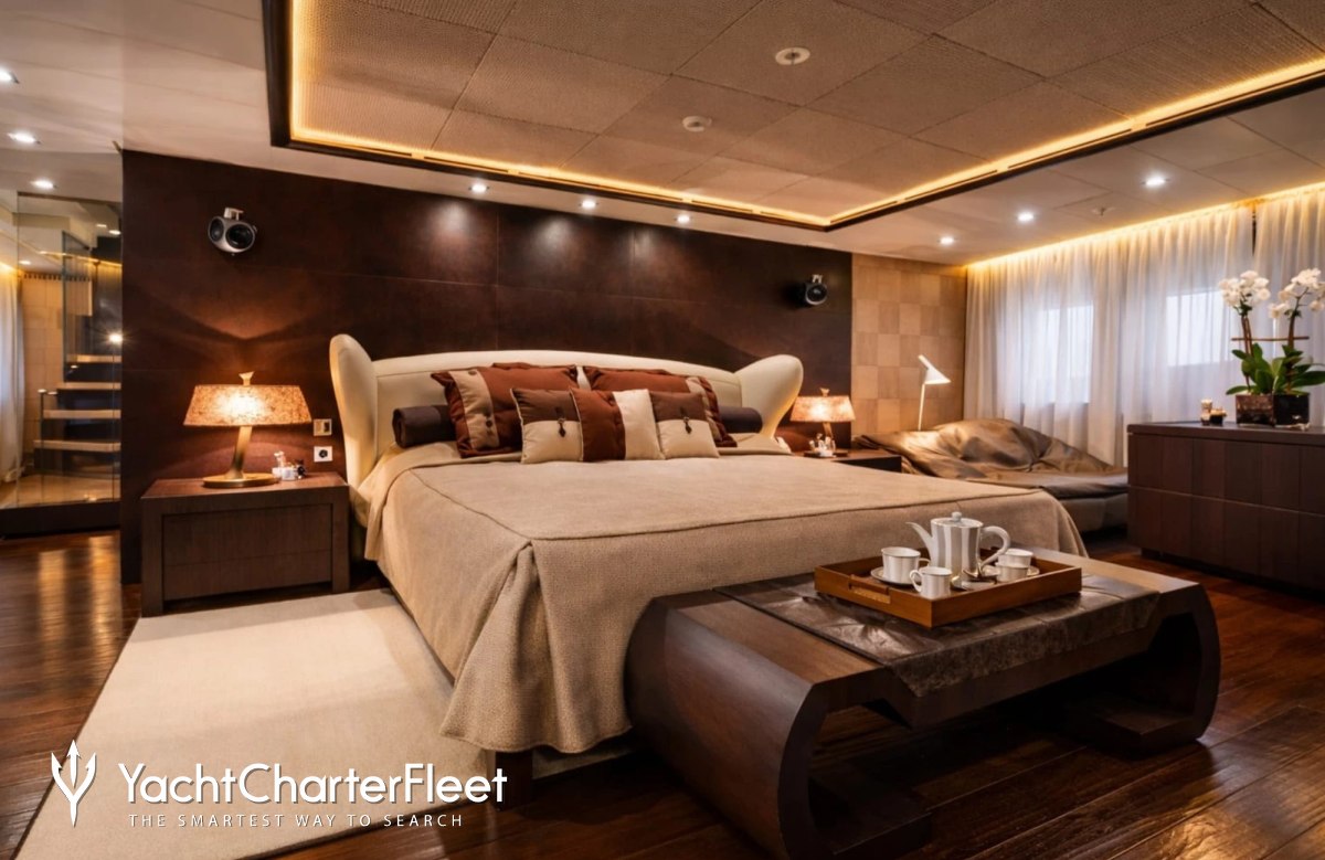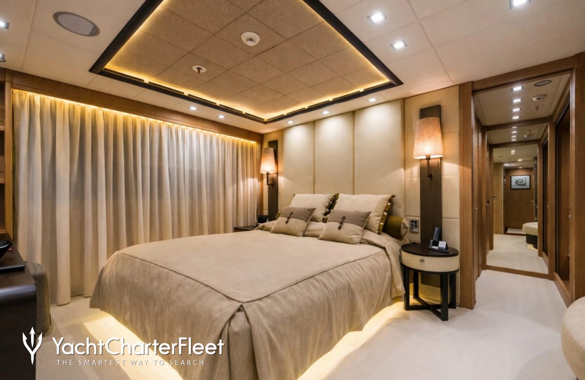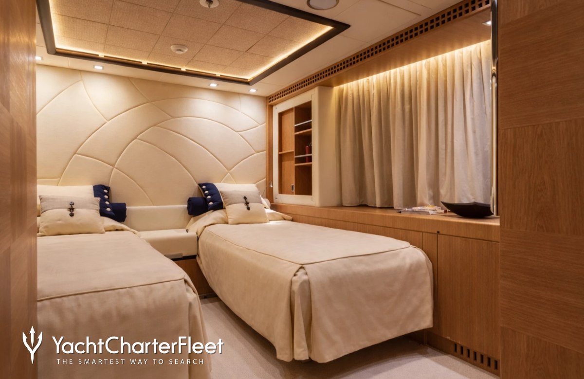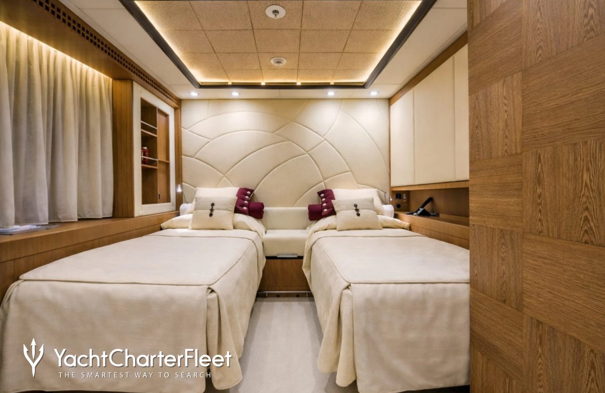 Built in 2013, I Nova offers guest accommodation for up to 12 guests in 6 suites comprising a master suite, one VIP cabin, two double cabins and two twin cabins. The supremely spacious full beam master suite incorporates its own study. She is also capable of carrying up to 12 crew onboard to ensure a relaxed luxury yacht charter experience.
