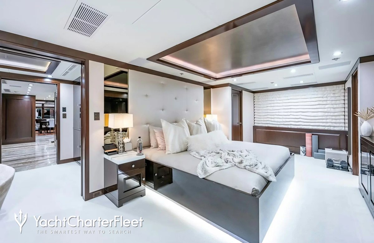 Families will particularly love Miss Michelle thanks to her child-friendly setup. Built in 2015, She offers guest accommodation for up to 12 guests with a layout comprising a master suite, two double cabins and two twin cabins. The supremely spacious full beam master suite incorporates its own study and dressing room as well as a his and her bathroom. The bed configuration includes 3 queen, 4 singles and 2 pullmans. She is also capable of carrying up to 8 crew onboard to ensure a relaxed luxury yacht charter experience.