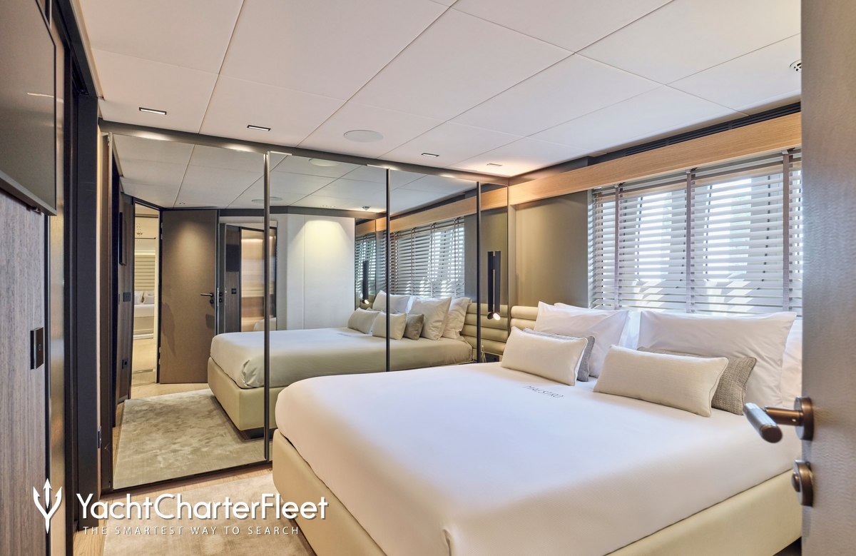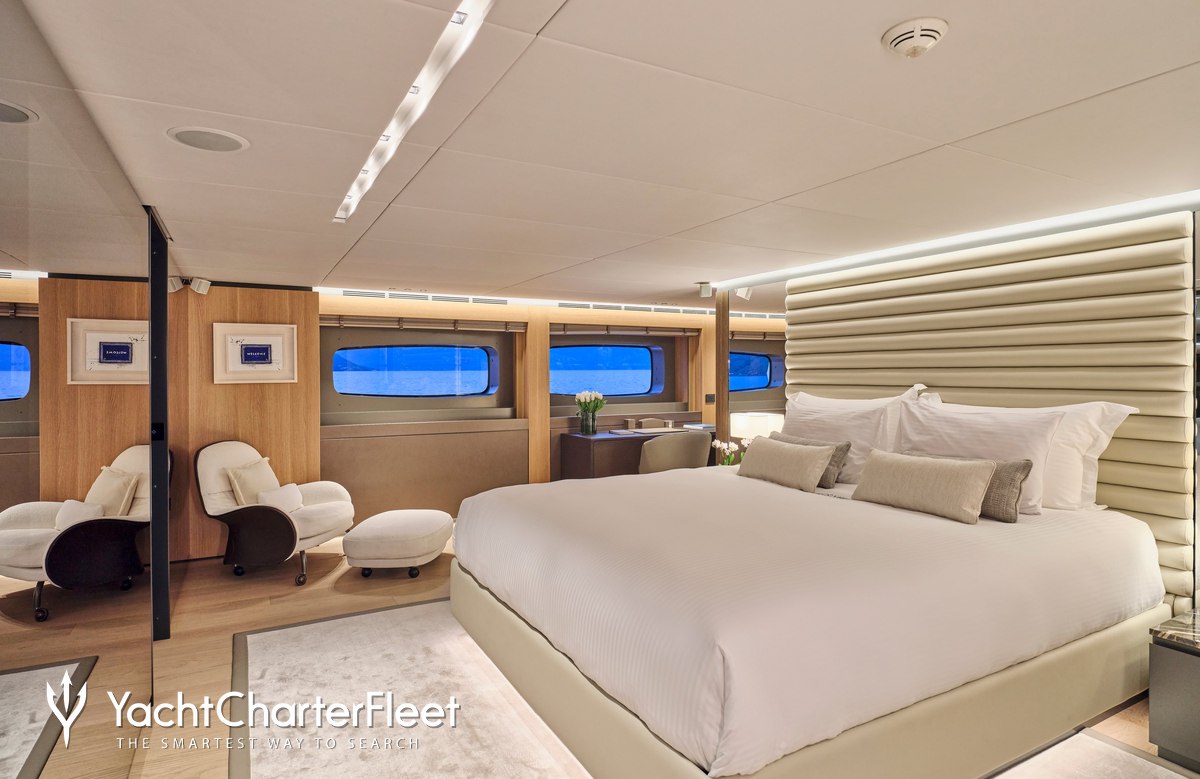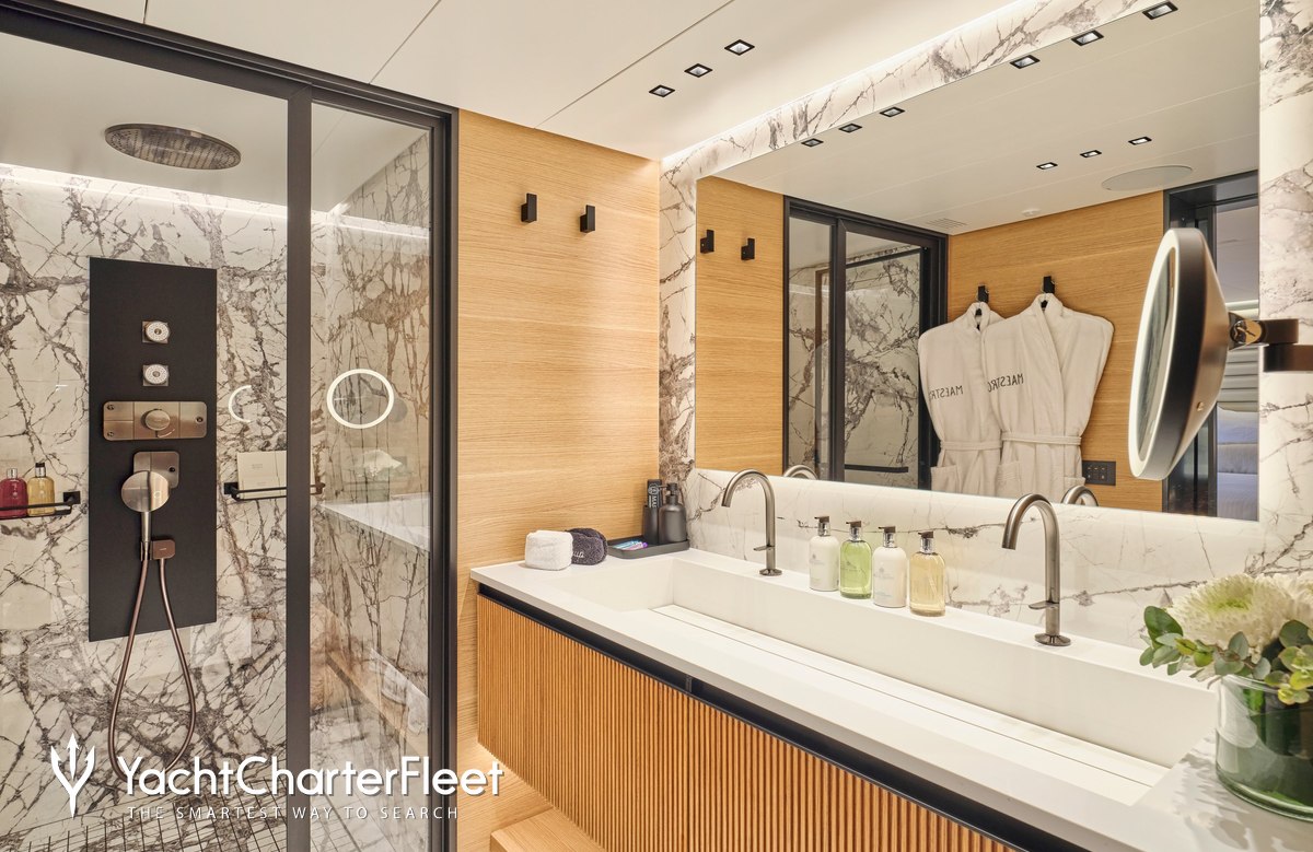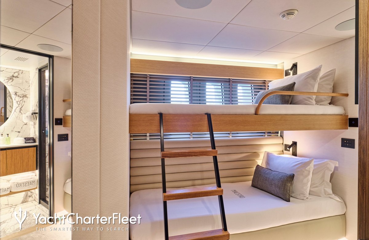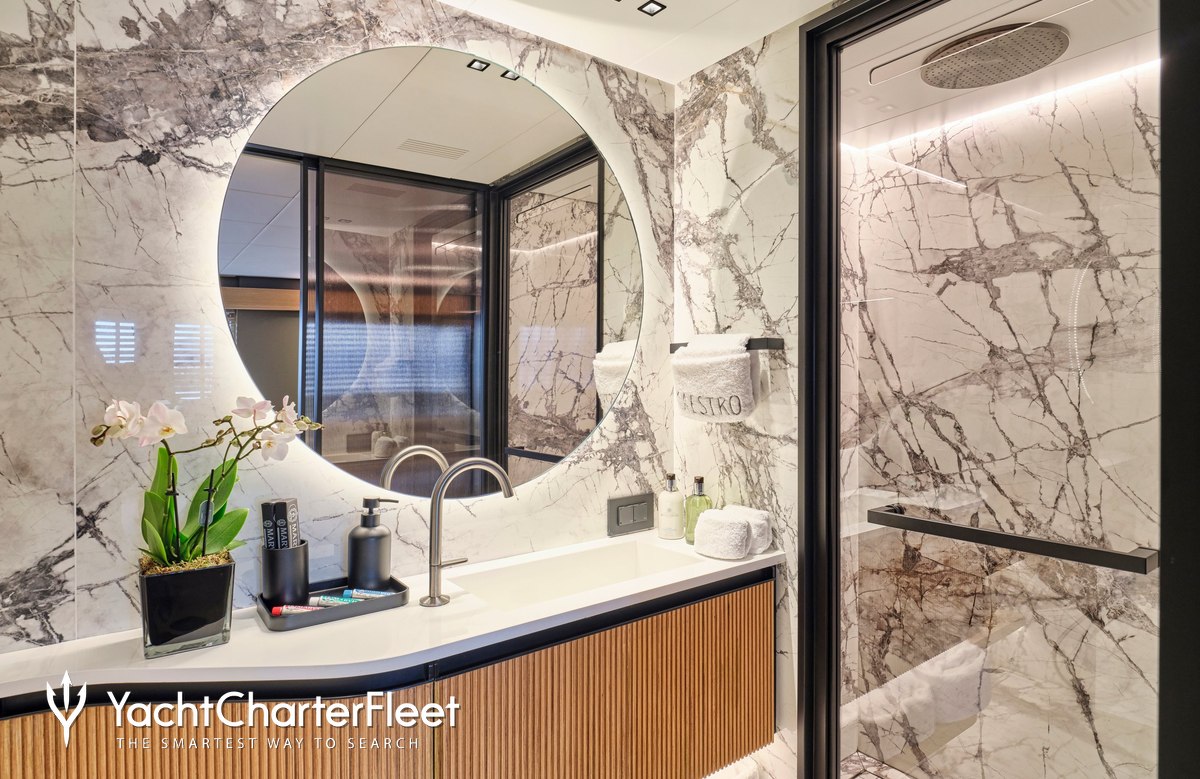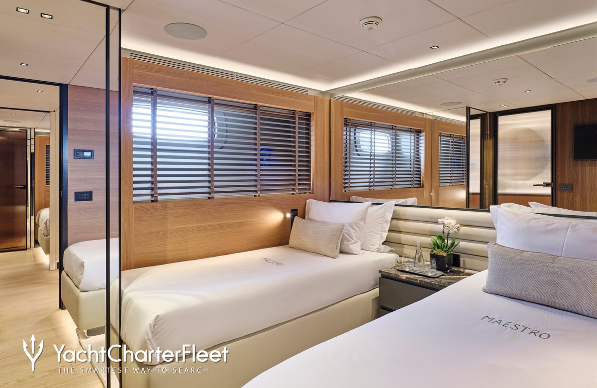 Maestro offers guest accommodation for up to 12 guests in 6 suites comprising a master suite located on the main deck, one VIP cabin, one double cabin and one twin cabin. The supremely spacious full beam master suite incorporates its own study and dressing room. The bed configuration includes 1 king, 1 queen, 1 double, 6 singles and 2 convertible. She is also capable of carrying up to 9 crew onboard to ensure a relaxed luxury yacht charter experience.
