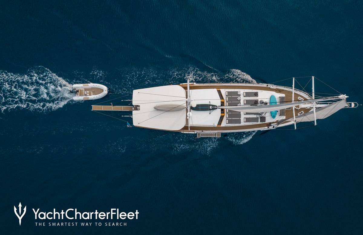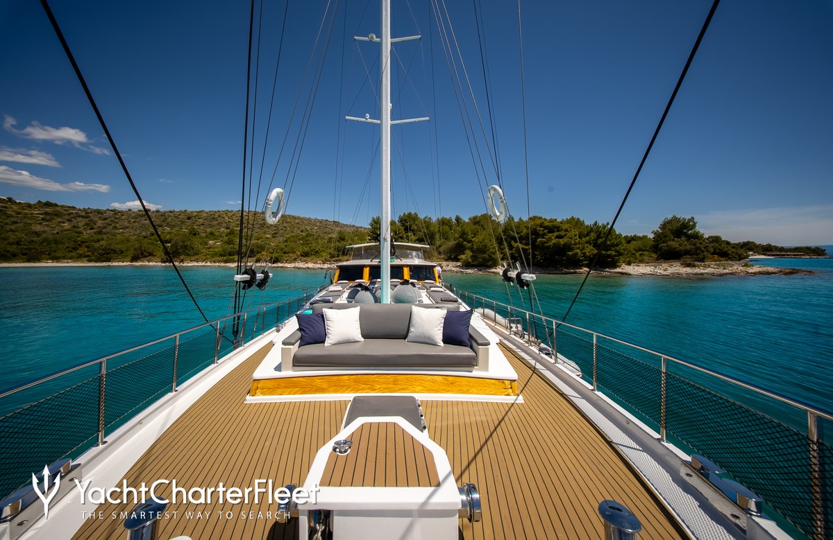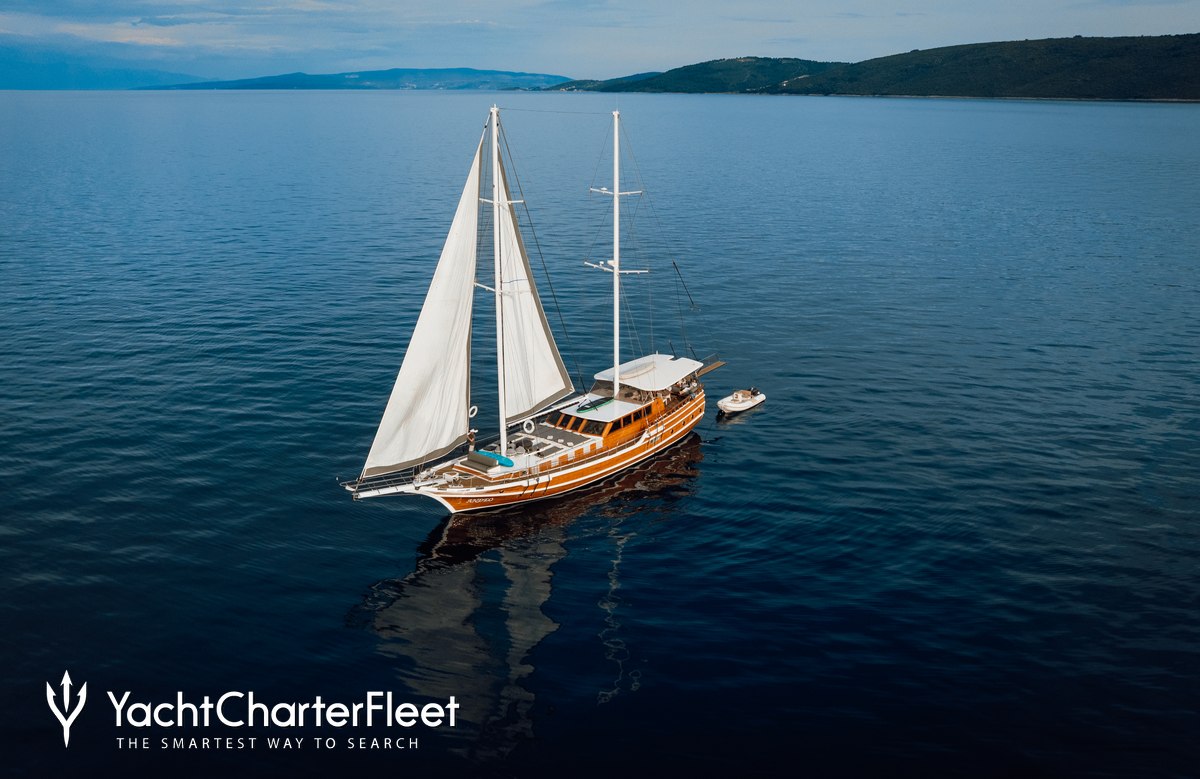 The 27m/88'7" 'Andeo' gulet yacht built by shipyard Custom is available for charter for up to 10 guests in 5 cabins.