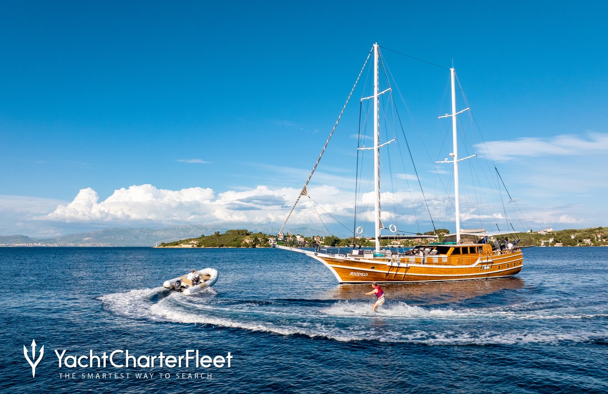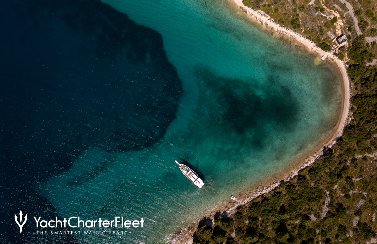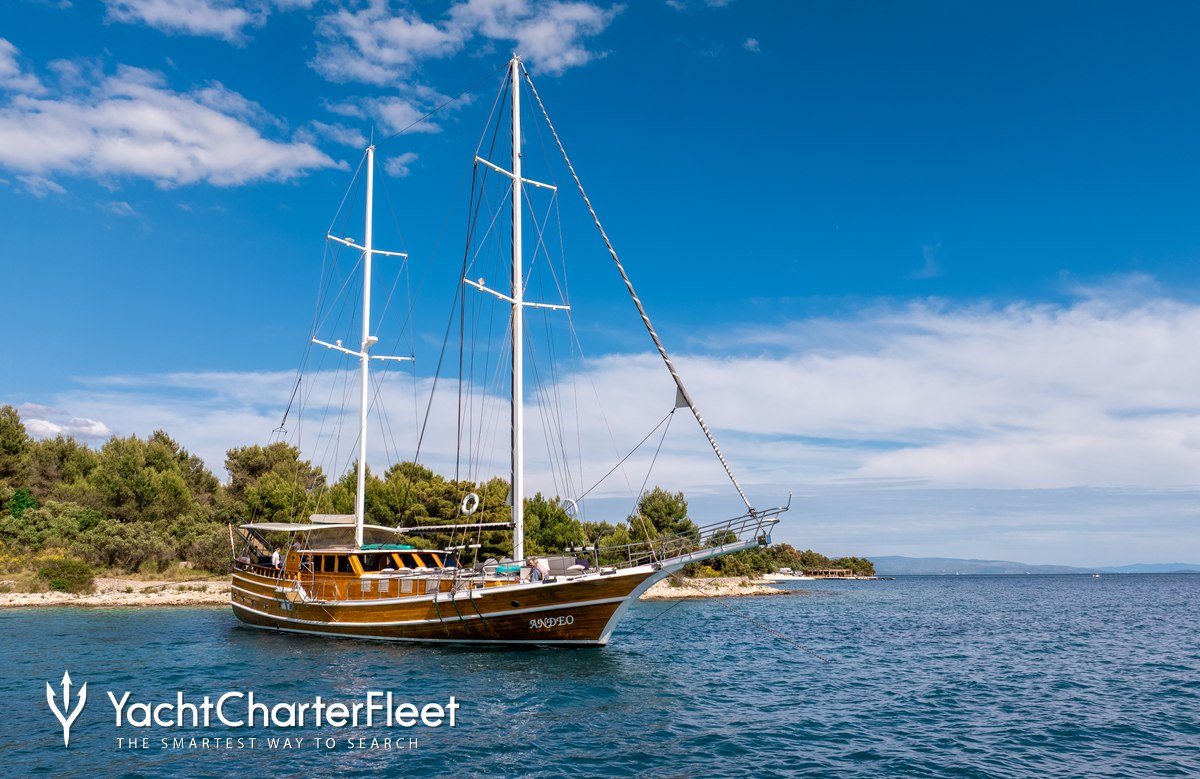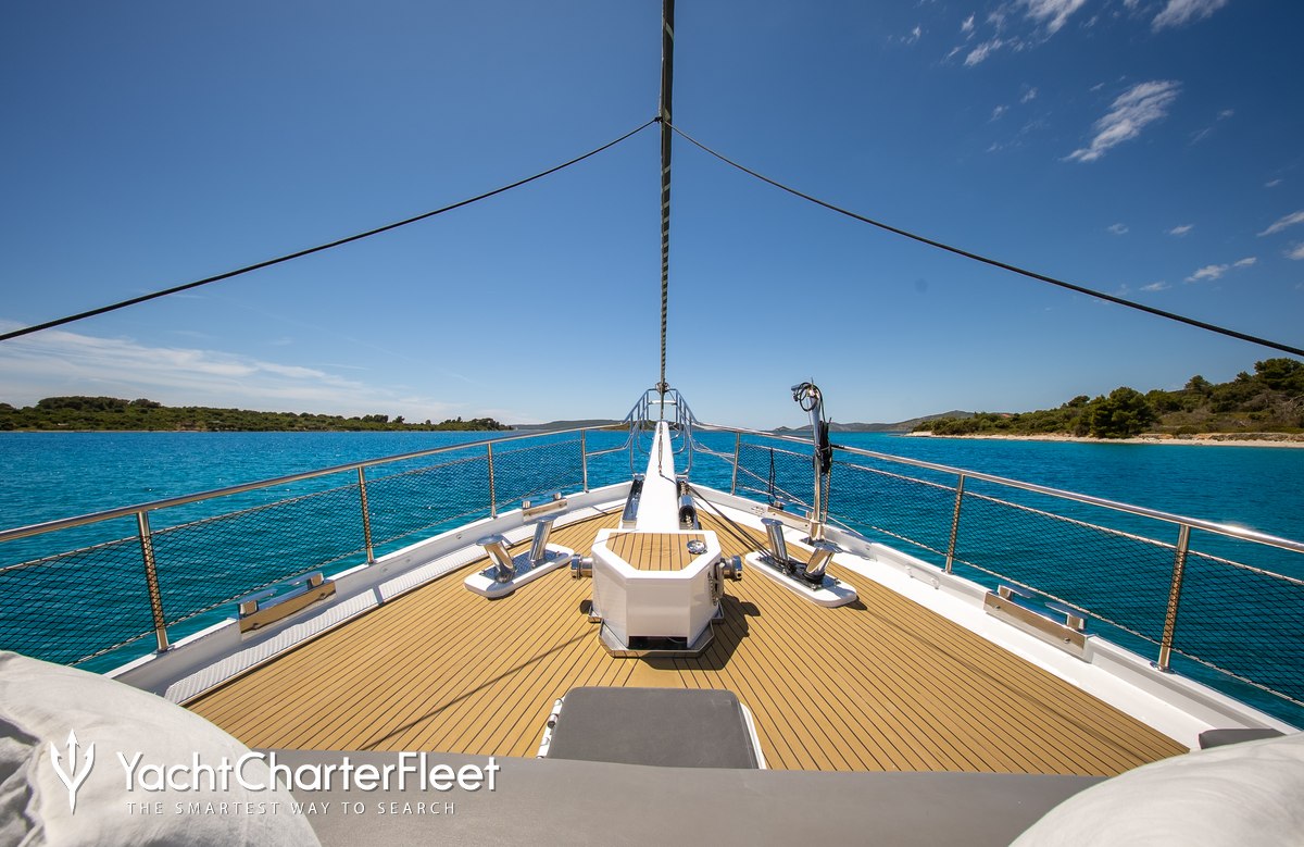 The 27m/88'7" 'Andeo' gulet yacht built by shipyard Custom is available for charter for up to 10 guests in 5 cabins.