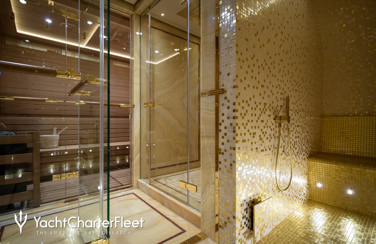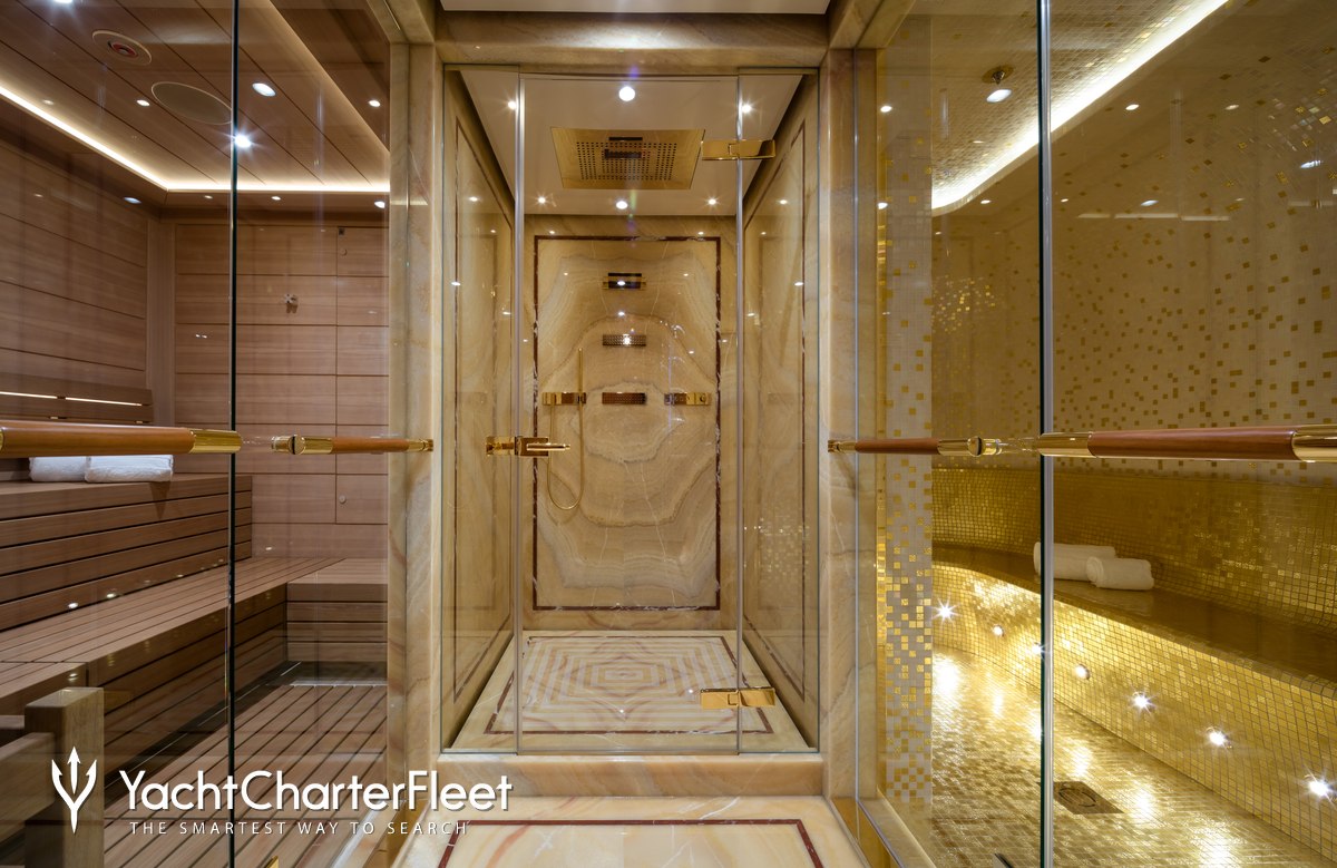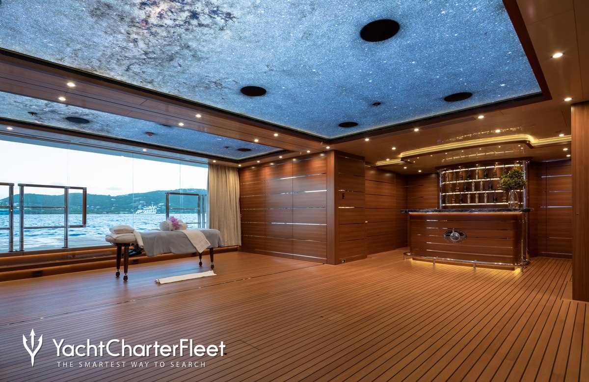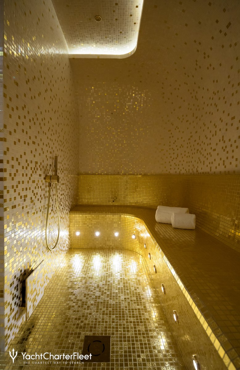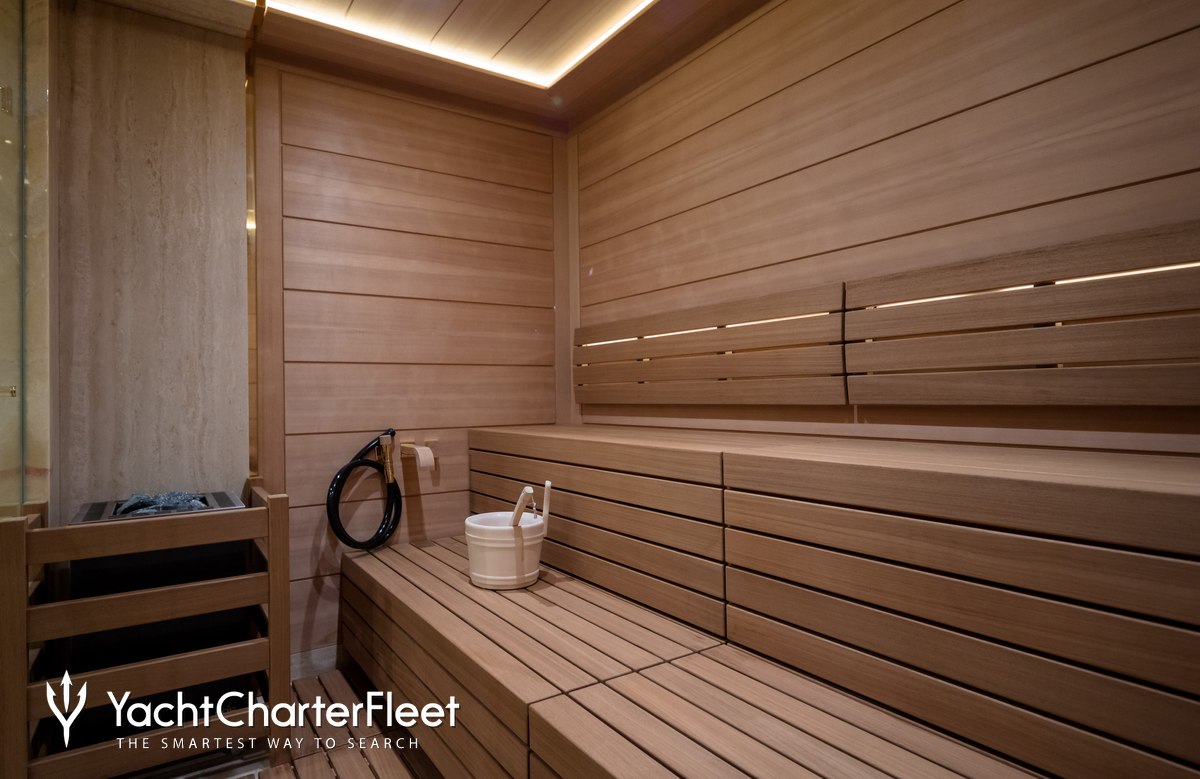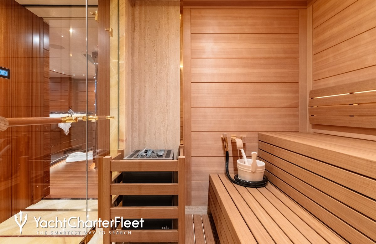 A charter on Black Pearl is comfortable and convenient thanks to the provided amenities such as a dancefloor where you and your guests can celebrate in style. Elsewhere she boasts a movie theatre, perfect to relax after a long day on the water. Visit the sauna and disconnect in peace and quiet plus take a plunge in the pool under the sun. Head to the beach club and take advantage of indoor-outdoor living and entertaining or maintain your fitness routine and work out in the well-equipped gym. Soak up the bubbles in style in the deck jacuzzi.