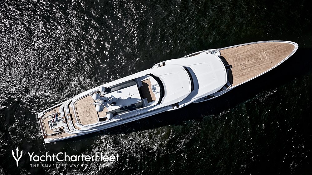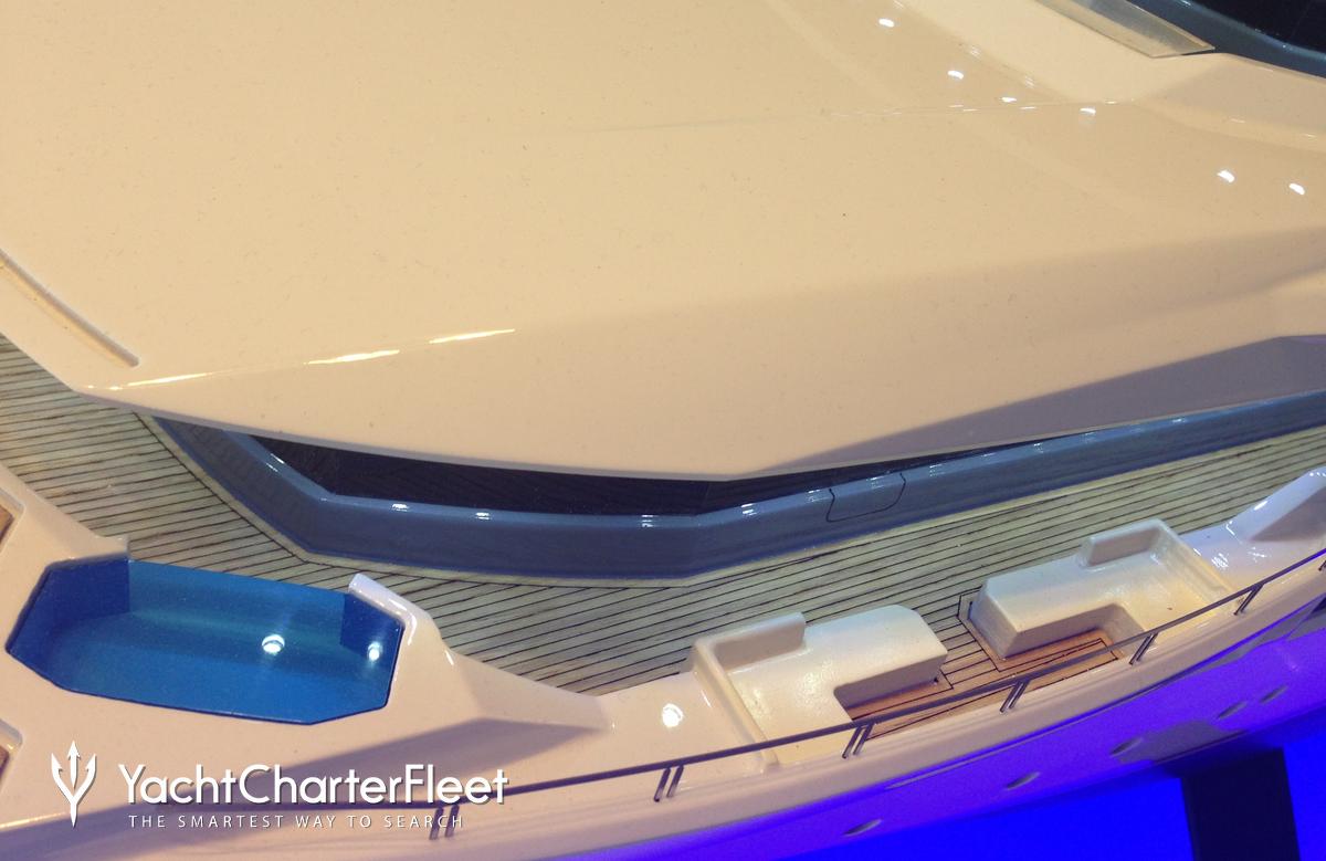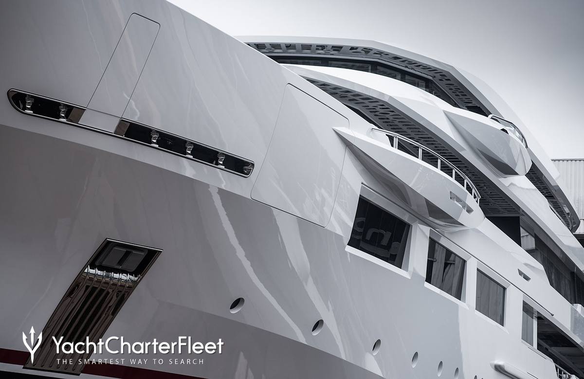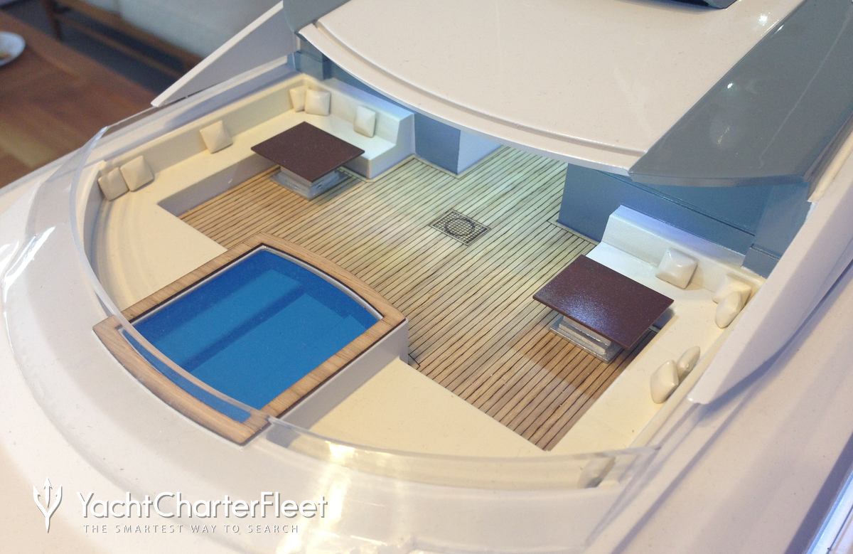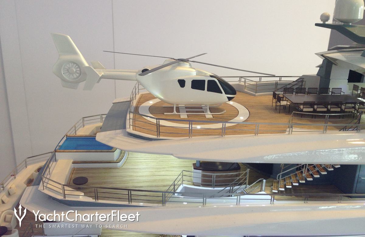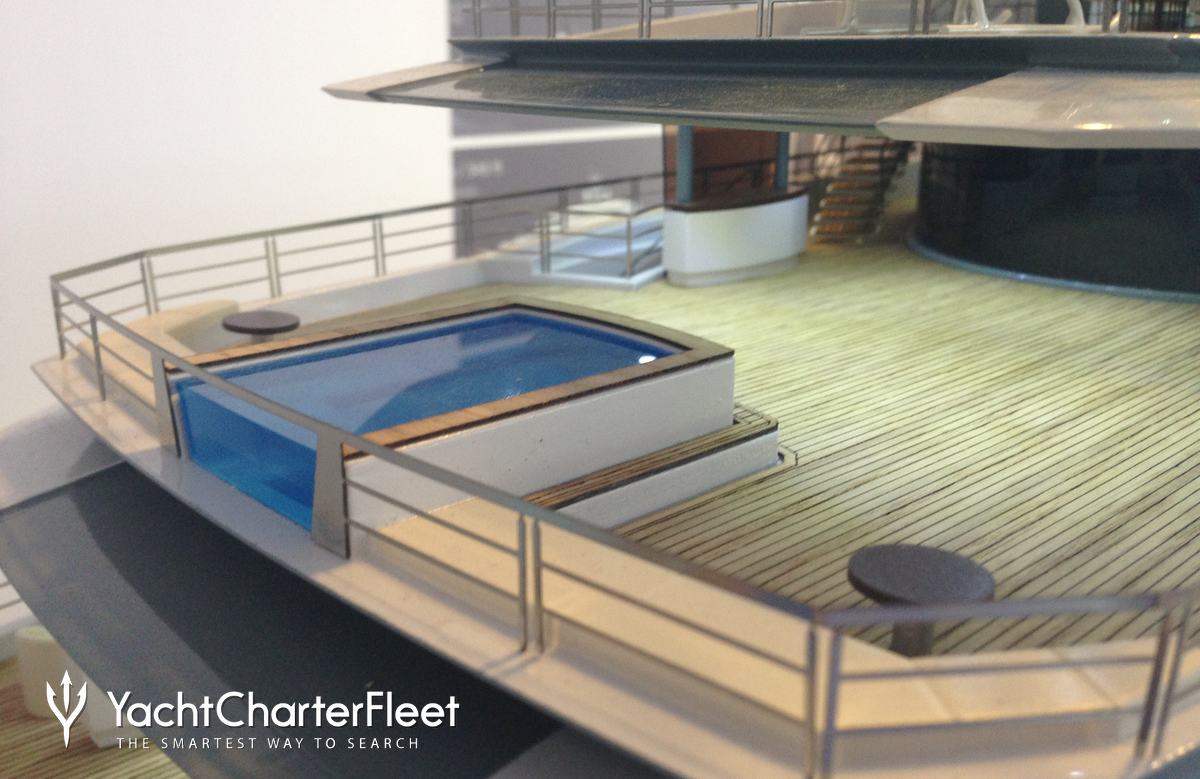 Her features include separate crew passageway, steam room, spa, beauty salon, elevator, underwater lights, beach club, gym, WiFi and air conditioning.