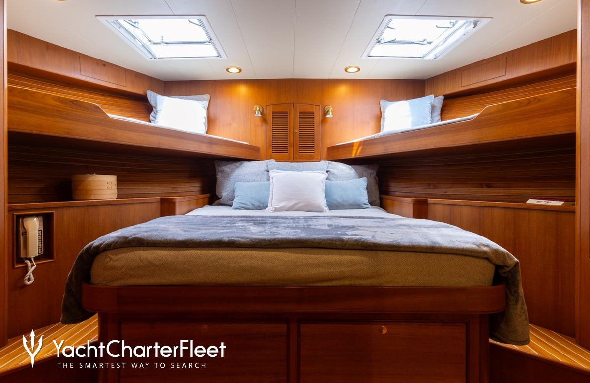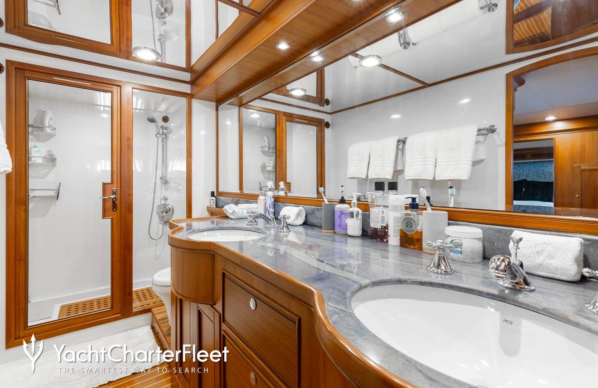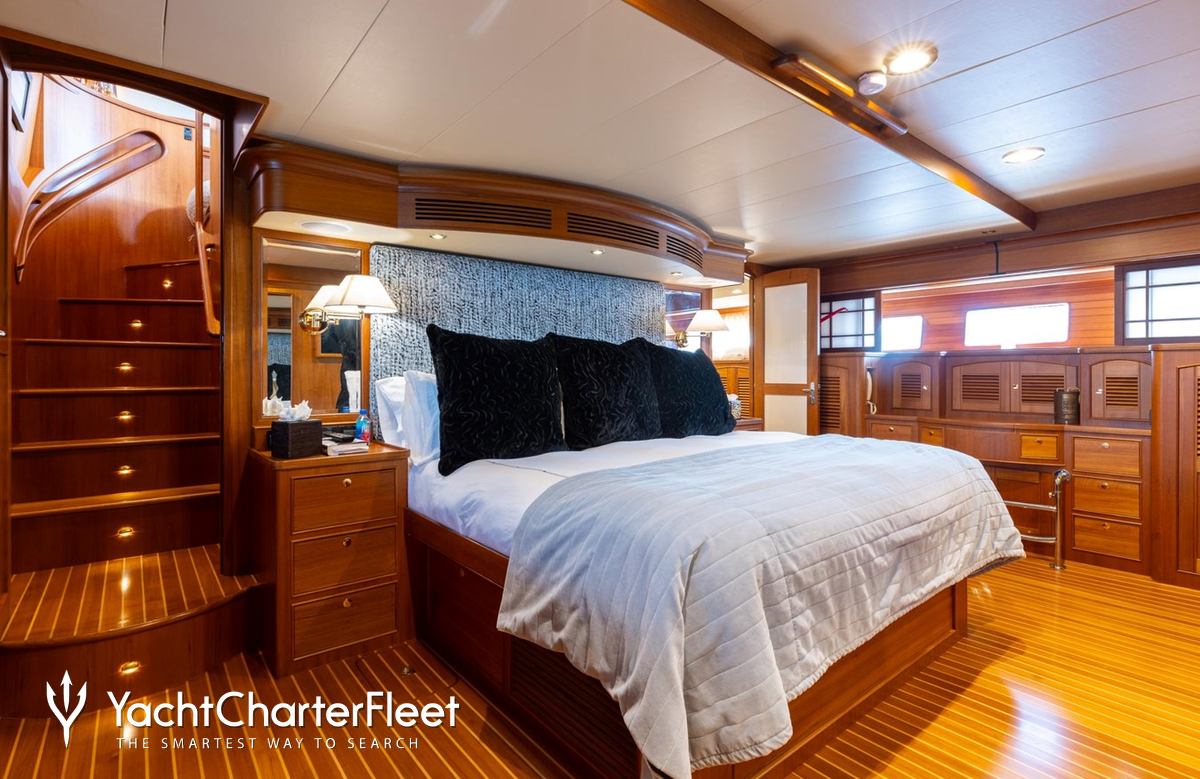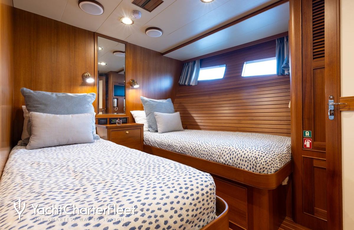Virginia Sea is great for families thanks to her child-friendly setup. She offers guest accommodation for up to 8 guests with a layout comprising a master suite, one VIP cabin and two twin cabins. There are 8 beds in total, including 2 king, 4 singles and 2 pullmans. She is also capable of carrying up to 4 crew onboard to ensure a relaxed luxury yacht charter experience.