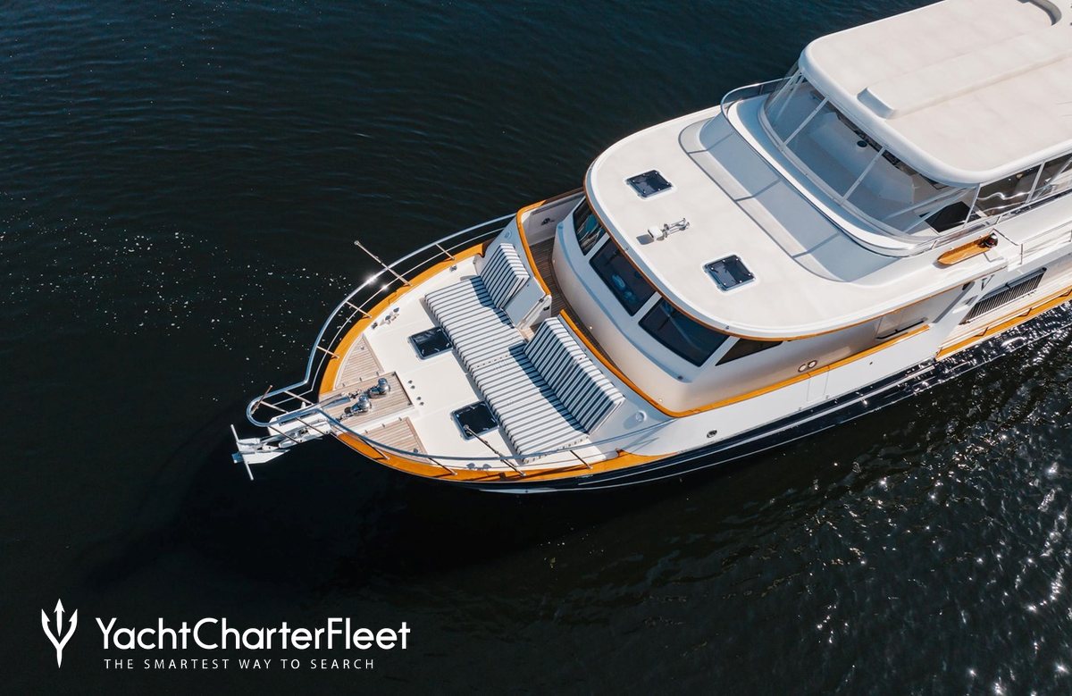 Built with a GRP hull and GRP superstructure, she benefits from a semi-displacement hull to provide exceptional seakeeping and impressive speeds. Powered by twin Caterpillar engines, she comfortably cruises at 23 knots, reaches a maximum speed of 27 knots with a range of up to 1,500 nautical miles from her 4,000 gallon fuel tanks at 10 knots. With a shallow draft of 1.62m/5'4" Virginia Sea can anchor closer to coves and sheltered bays overnight.
