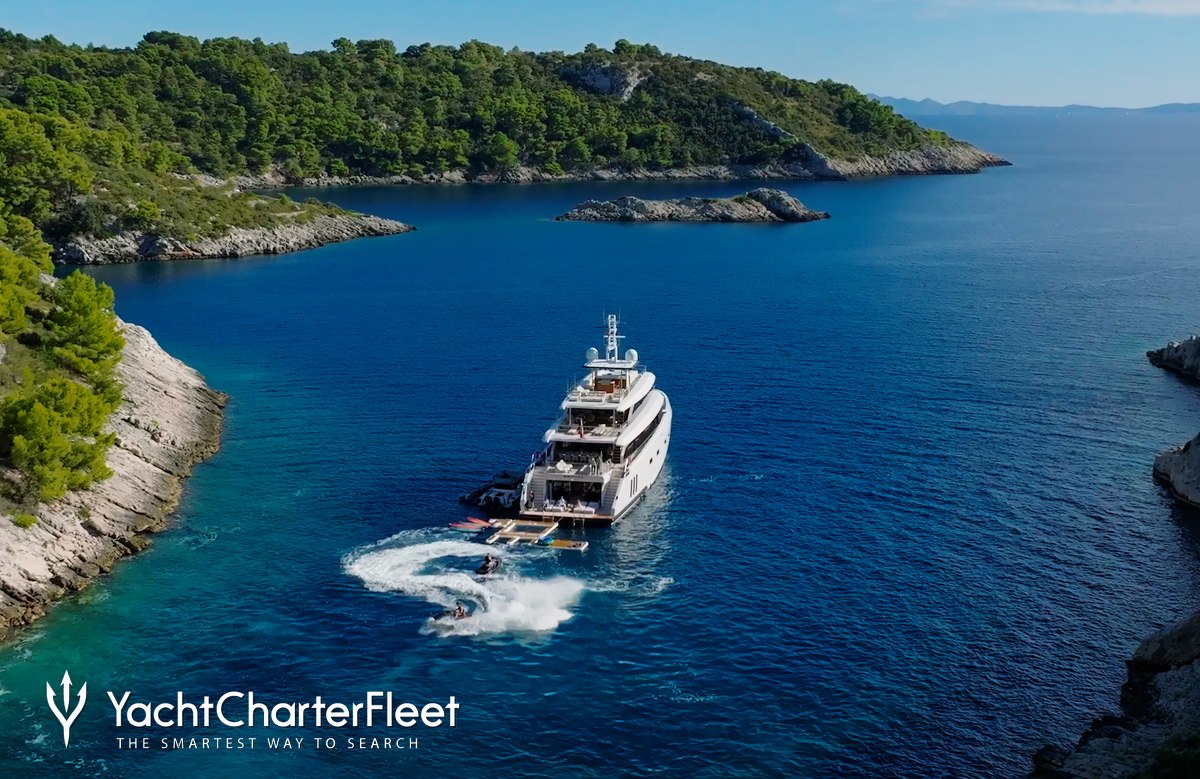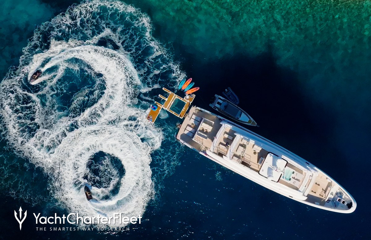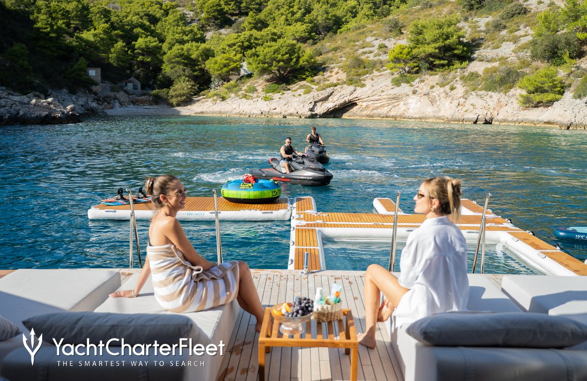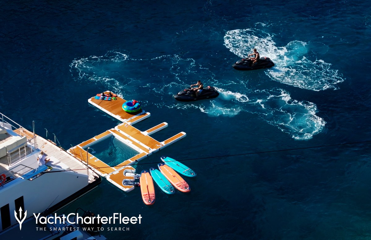 Motor yacht Renata boasts a wealth of convivial spaces, perfect for luxury yacht charters with families of friends, offering ample opportunities to kick back and relax, or enjoy the water on the yacht's array of water toys, the choice is yours. She is equipped with a movie theatre and beach club.