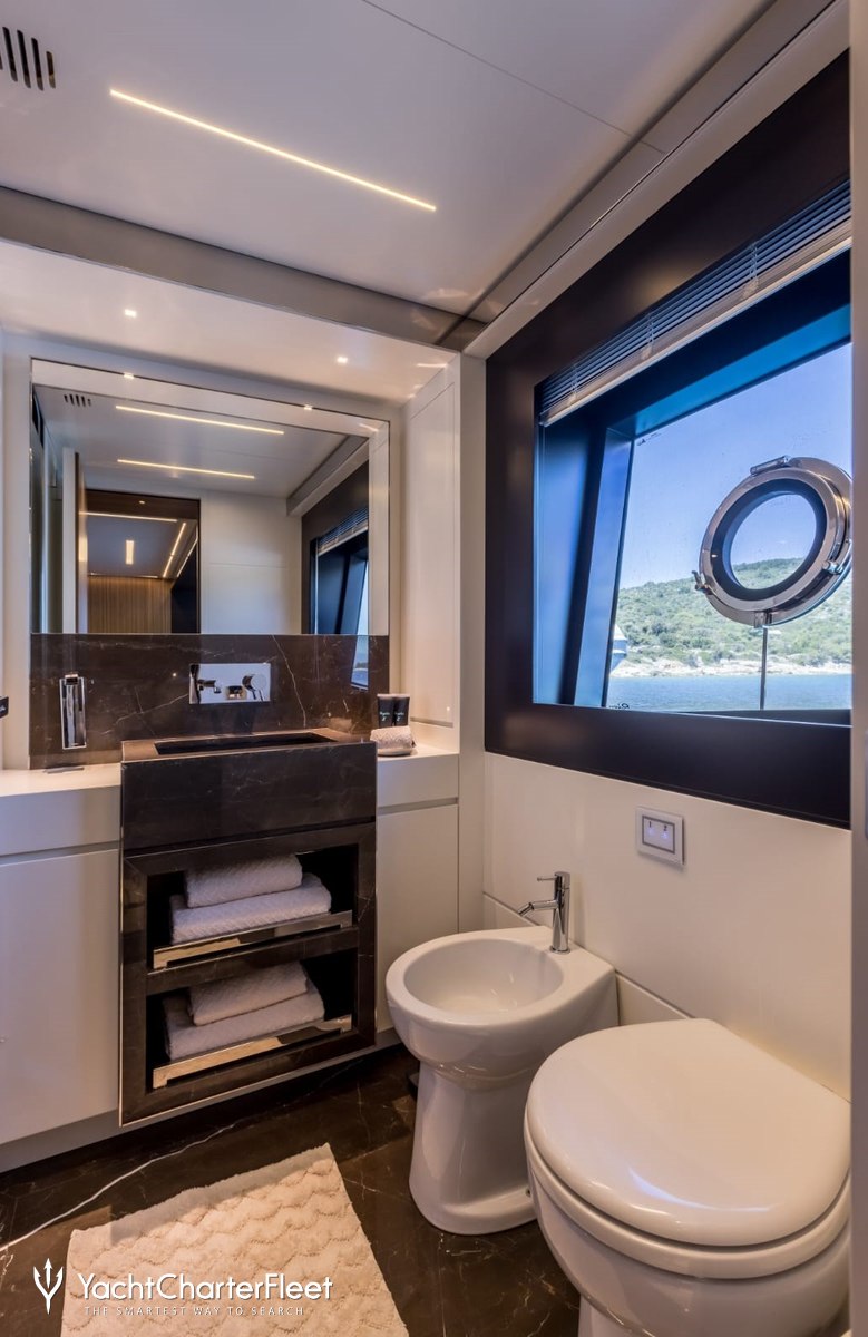 Built with a GRP hull and GRP superstructure, she has impressive speed and great efficiency thanks to her planing hull. Powered by twin MTU engines, she comfortably cruises at 23 knots, reaches a maximum speed of 26 knots with a range of up to 310 nautical miles from her 9,000 litre fuel tanks at cruising speed. An advanced stabilisation system on board reduces the side-to-side roll of the yacht and promises guests exceptional comfort levels at anchor or when underway.