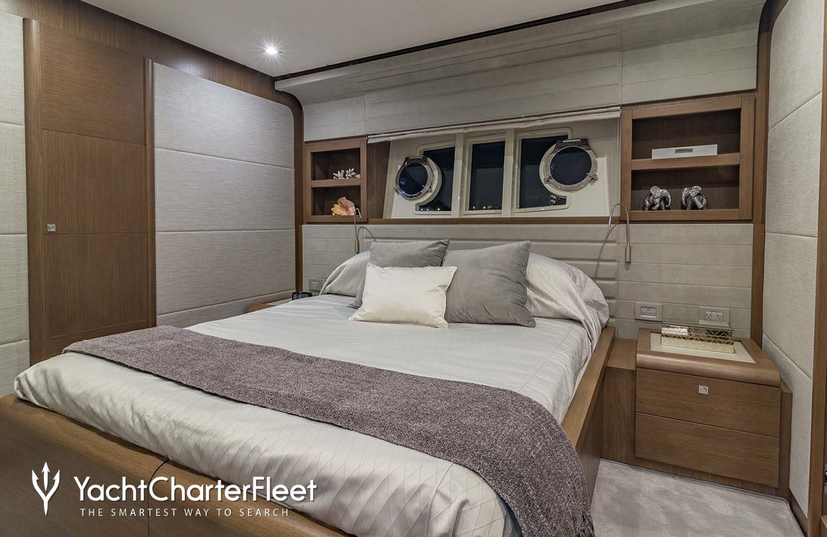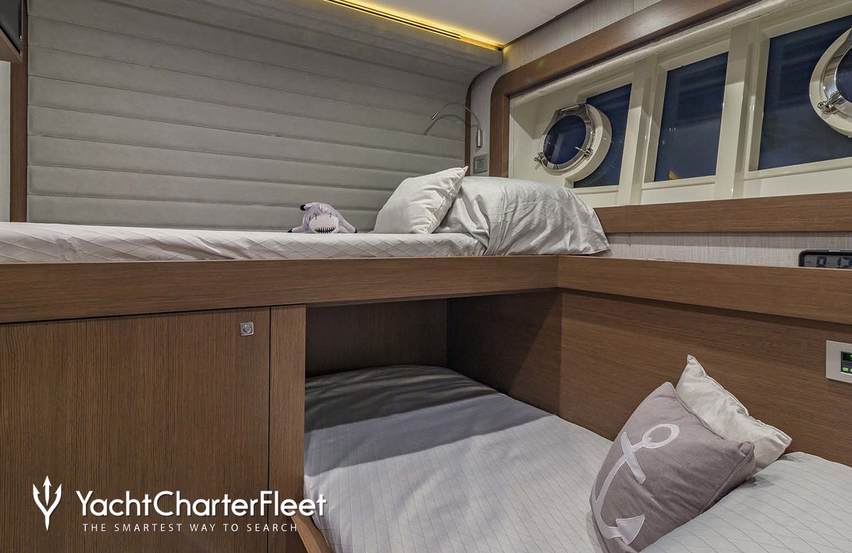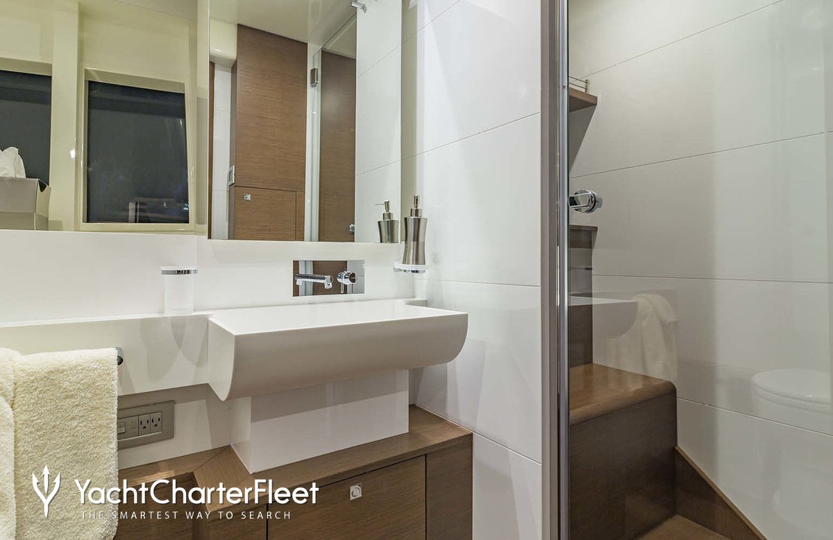 Leon offers guest accommodation for up to 8 guests in 4 suites comprising a master suite, two double cabins and one twin cabin. The bed configuration includes 3 queen and 2 singles. She is also capable of carrying up to 3 crew onboard to ensure a relaxed luxury yacht charter experience.