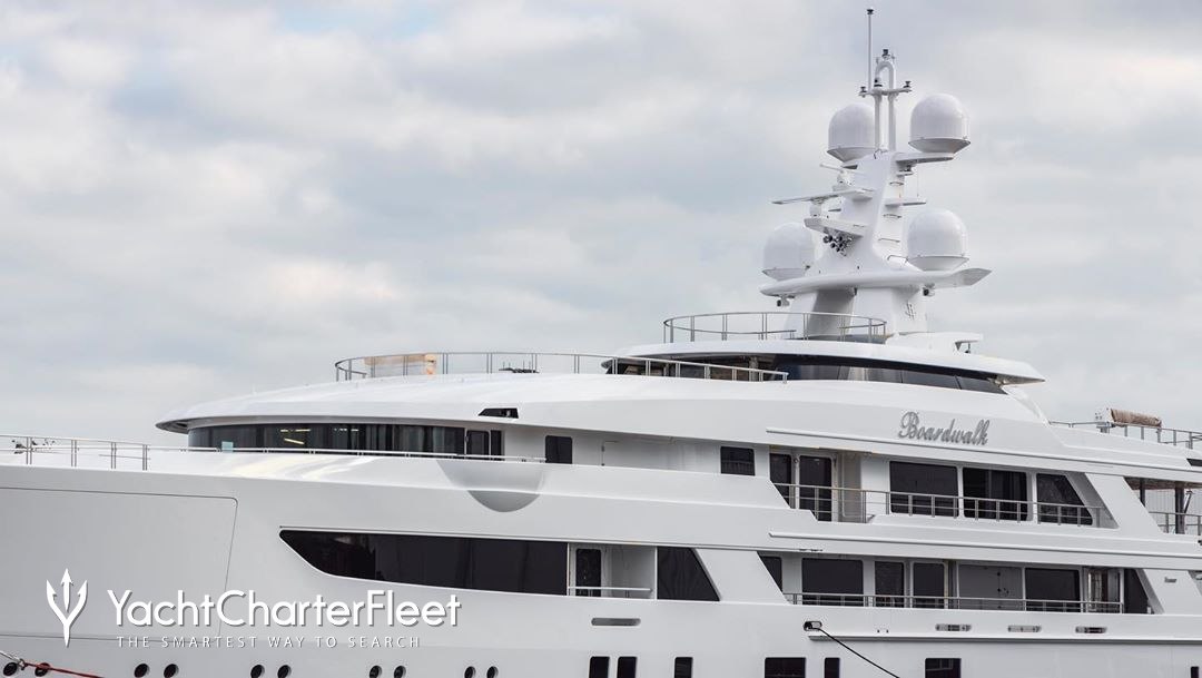 The luxury motor yacht Boardwalk V is displayed on this page merely for informational purposes and she is not necessarily available for yacht charter or for sale, nor is she represented or marketed in anyway by Trident Media Ltd. This document is not contractual. The yacht particulars displayed in the results above are displayed in good faith and whilst believed to be correct are not guaranteed, please check with your yacht charter broker. Trident Media Ltd does not warrant or assume any legal liability or responsibility for the accuracy, completeness, or usefulness of any information and/or images displayed as they may not be current. All boat information is subject to change without prior notice and is without warranty.