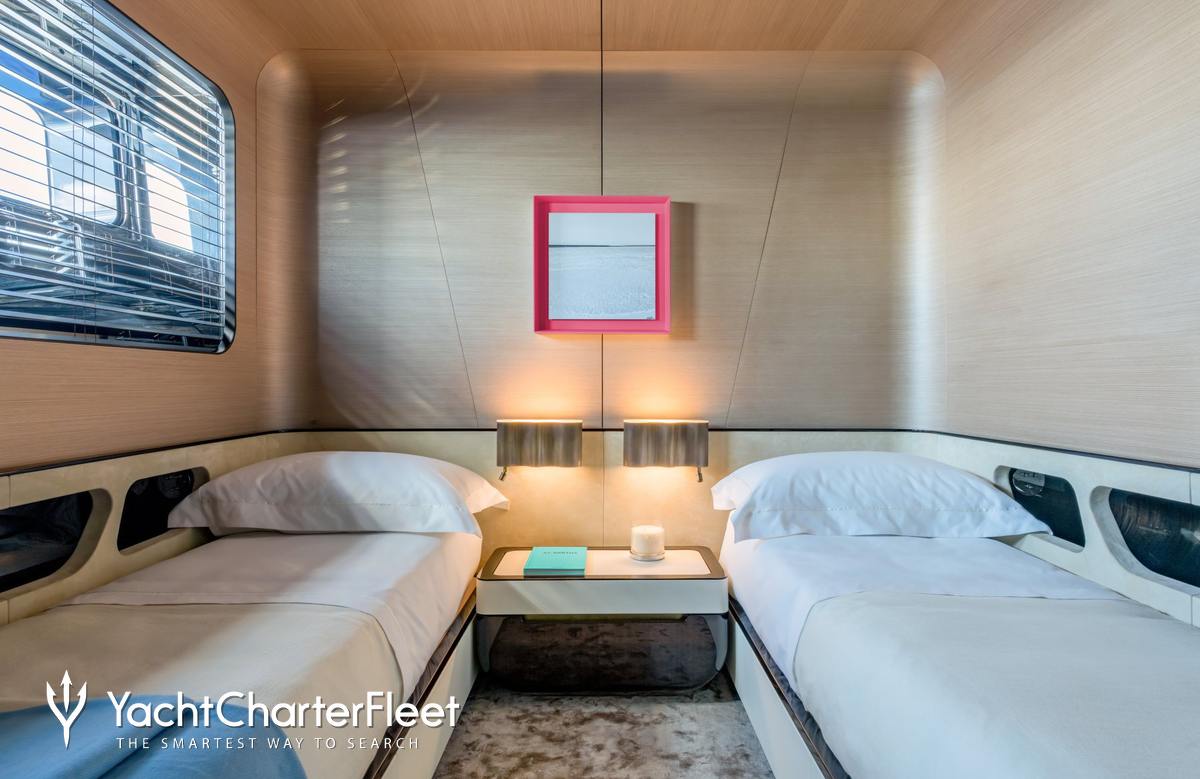 Katana X offers guest accommodation for up to 10 guests in 5 suites comprising a master suite, one VIP cabin, one double cabin and two twin cabins. She is also capable of carrying up to 8 crew onboard to ensure a relaxed luxury yacht charter experience.