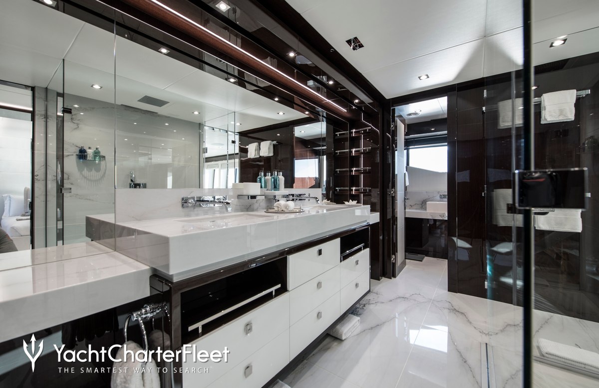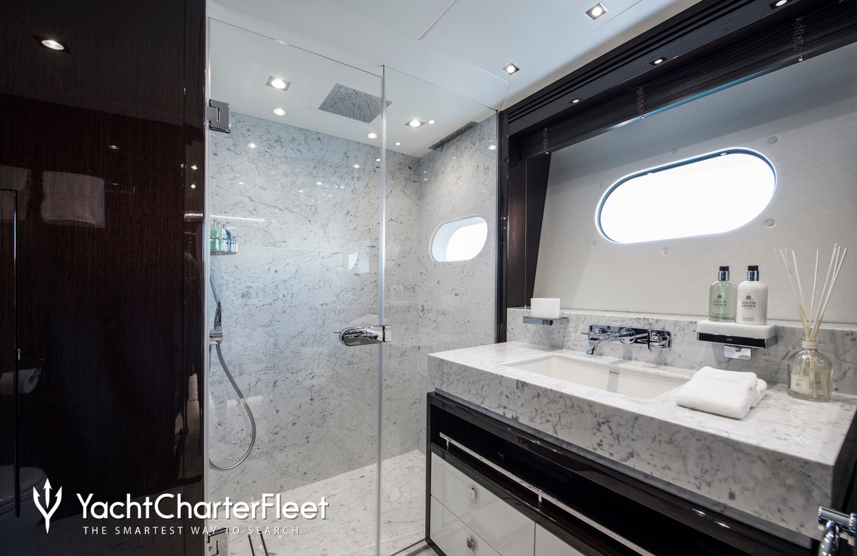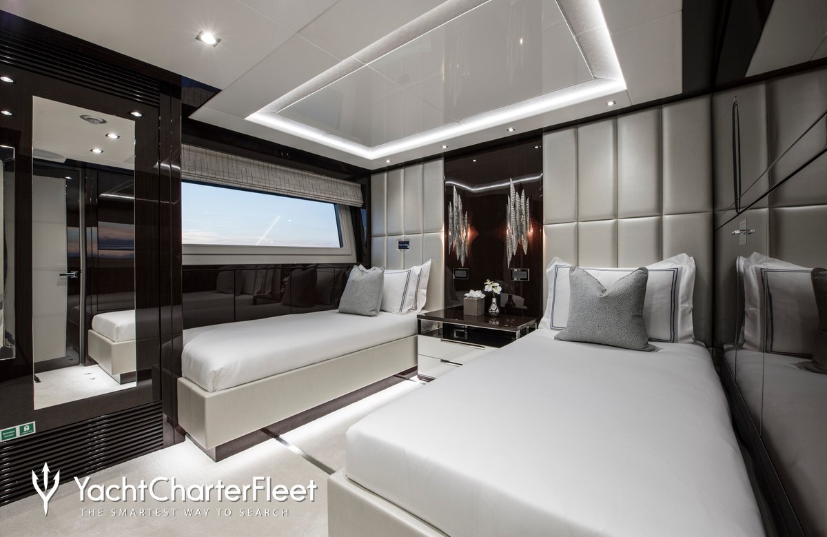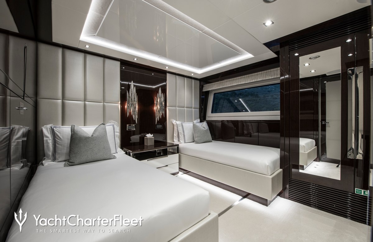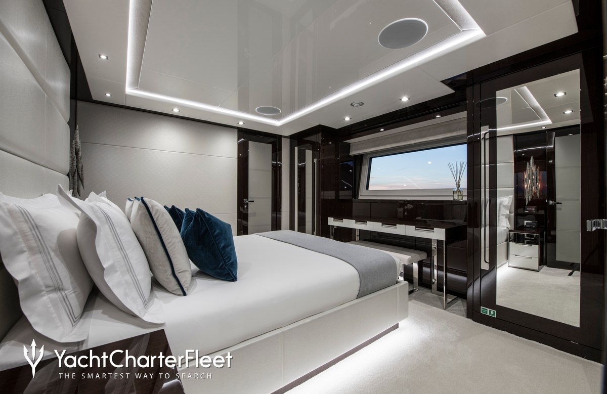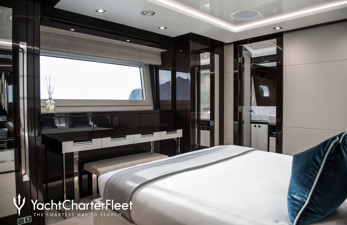 Built in 2018, Sweet Escape offers guest accommodation for up to 10 guests in 5 suites comprising a master suite located on the main deck, two double cabins and two cabins that can operate as twins or doubles. There are 5 beds in total, including 1 king and 2 doubles. She is also capable of carrying up to 8 crew onboard to ensure a relaxed luxury yacht charter experience.