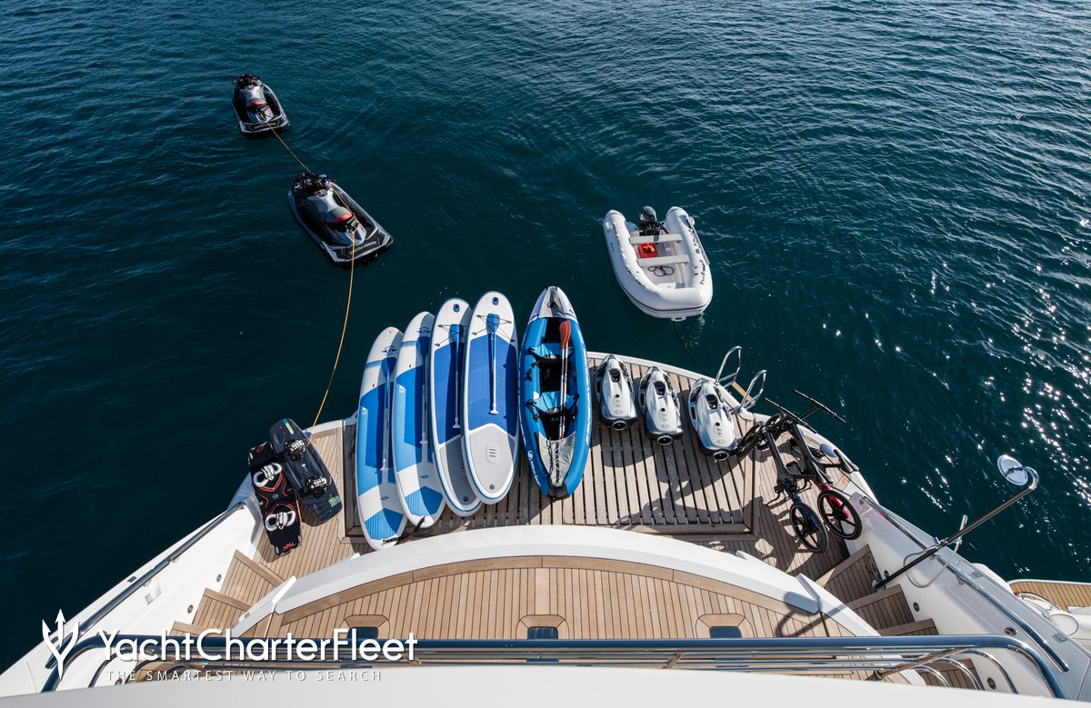 Sweet Escape has aboard a plentiful range of water toys and accessories ready to entertain you and your guests whilst on charter. Take to the sea on the Jet Skis offering you power and control on the water. In addition there is a waterski that are hugely entertaining whether you are a beginner or a seasoned pro. Extreme sports fans will appreciate the included Kite Surfers. If that isn't enough Sweet Escape also features a seabob, wakeboards, kayaks, bikes and paddleboards. Sweet Escape features two tenders, but leading the pack is a Williams Jet Tender to transport you in style.